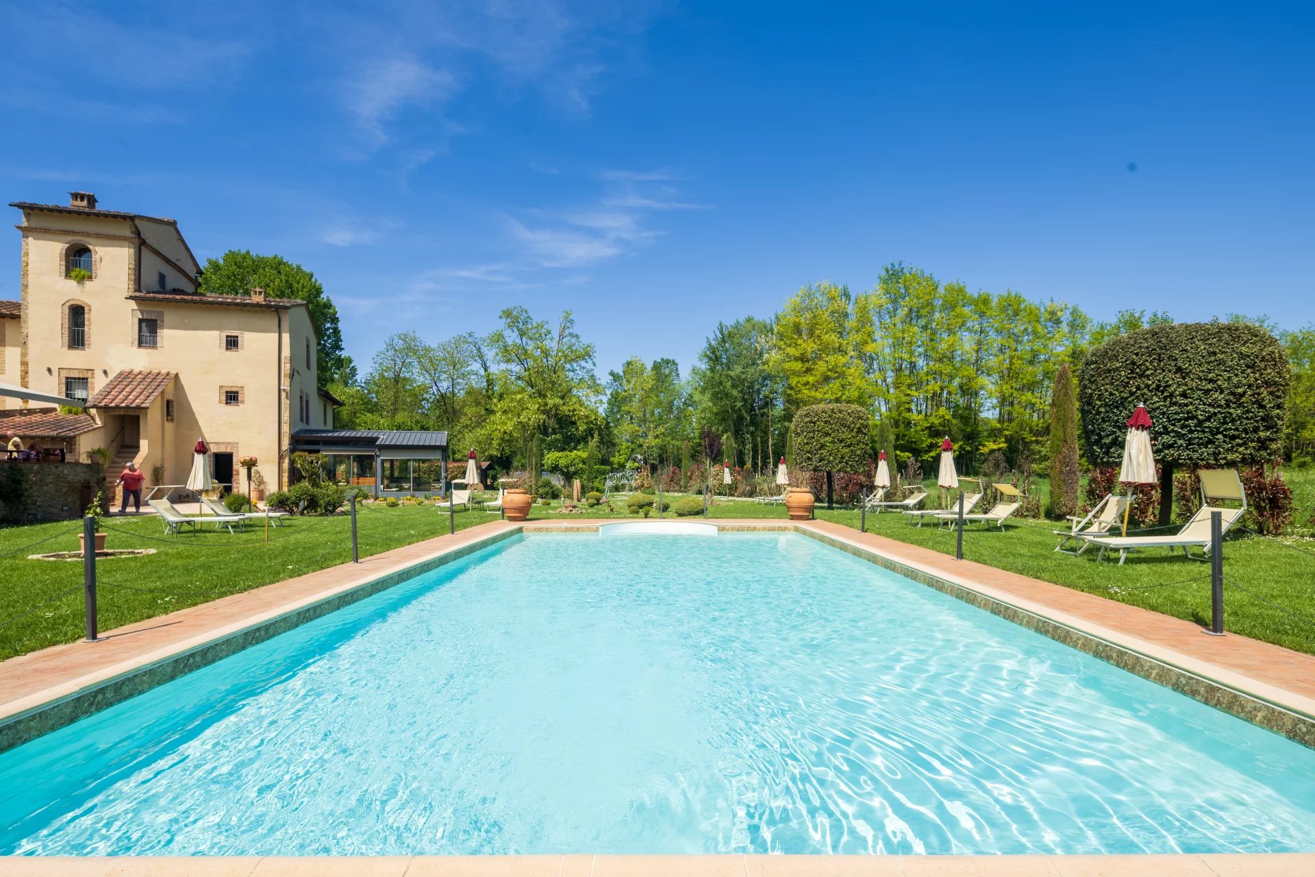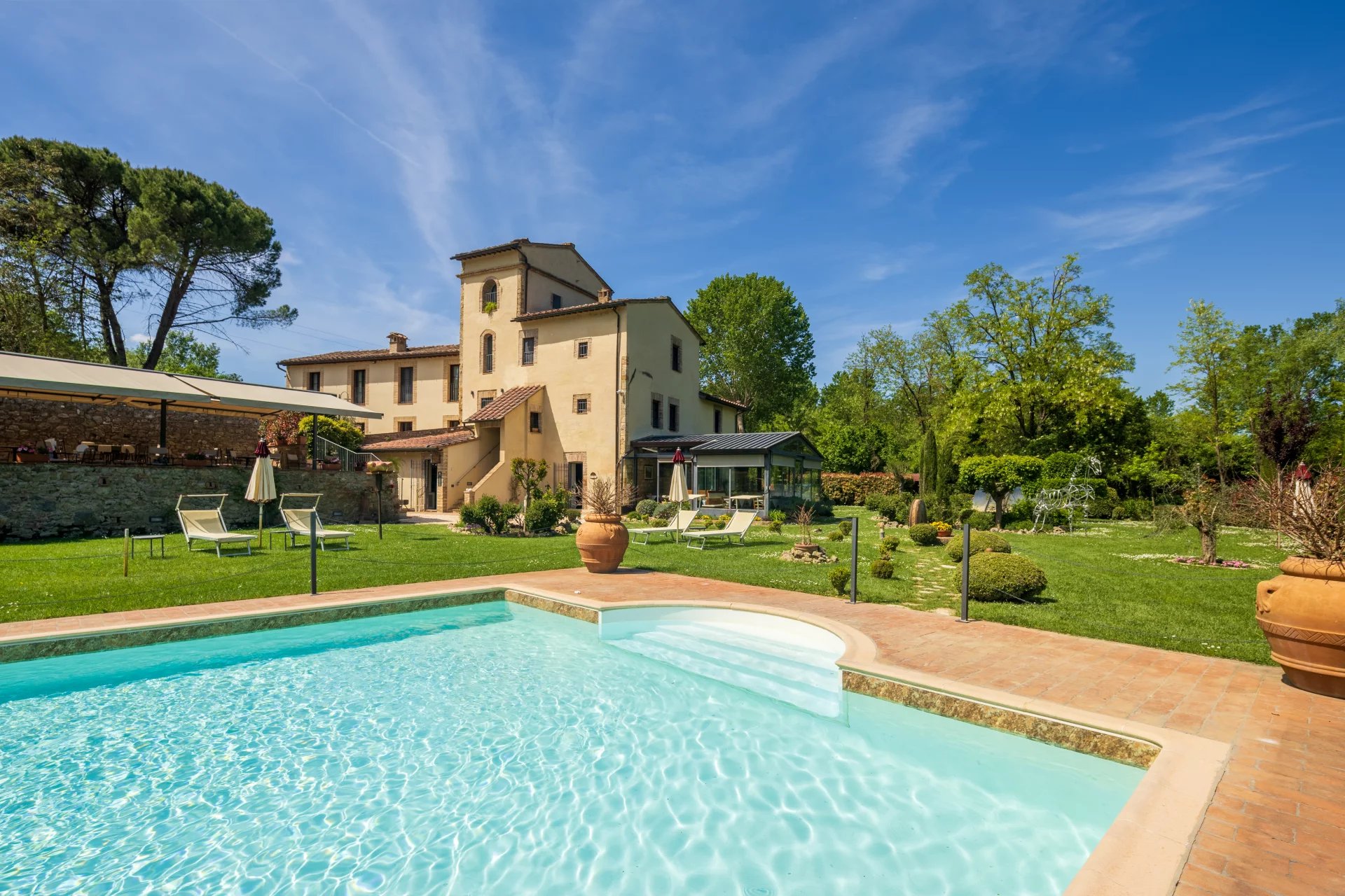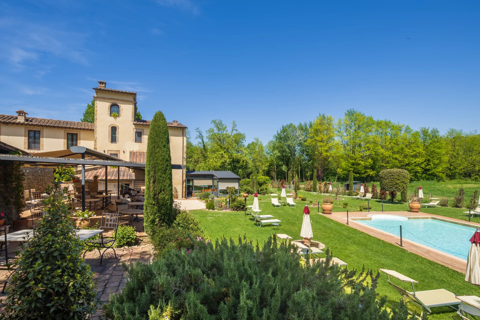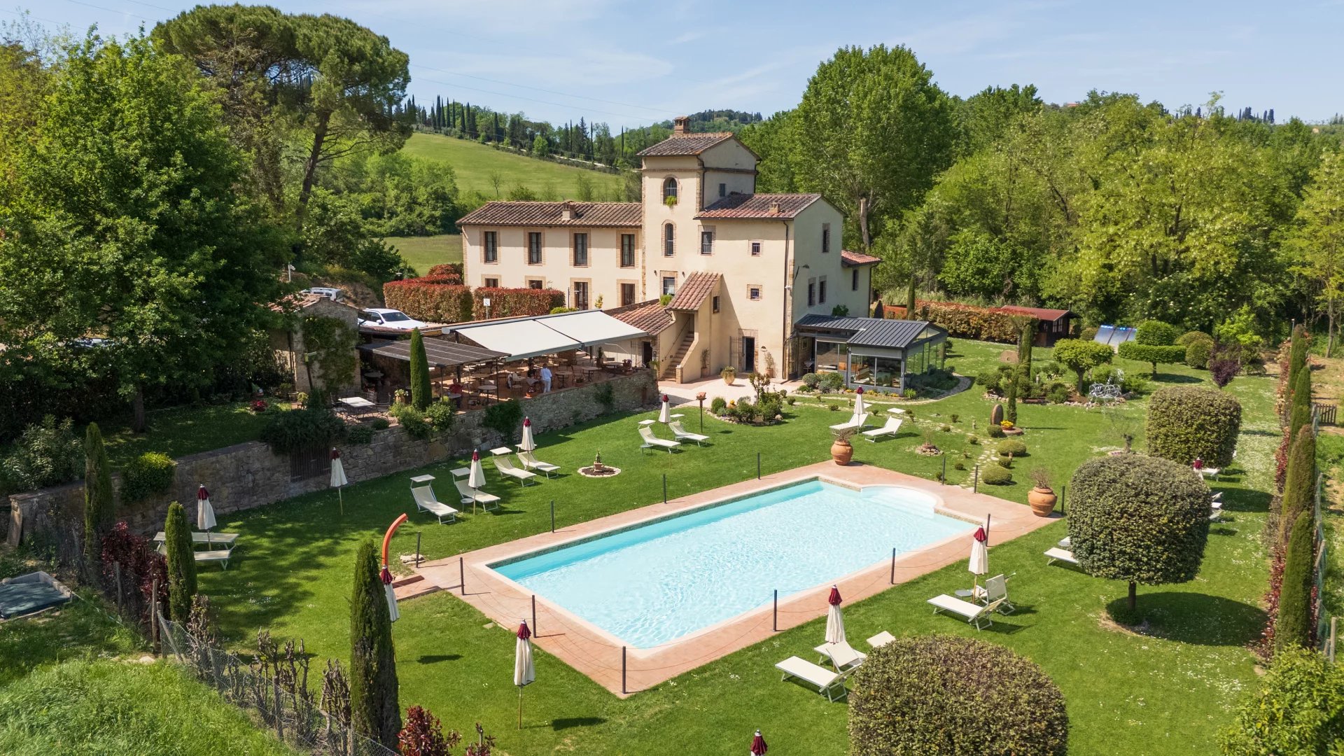 Con una superficie complessiva di circa 600 mq distribuita su due livelli, l’hotel ospita 16 camere, ciascuna unica nel suo stile e arricchita da elementi tradizionali come travi a vista, pavimenti in cotto e viste panoramiche sulle dolci colline toscane. L’atmosfera è quella di una residenza di charme, con interni eleganti pensati per offrire il massimo del comfort. All’esterno, un’ampia piscina di 14x7 metri è incorniciata da curati giardini, un grande terrazzo coperto e ben 4,6 ettari di terreno agricolo che abbracciano la proprietà.