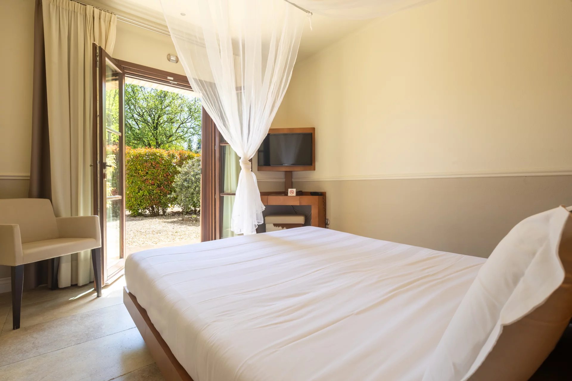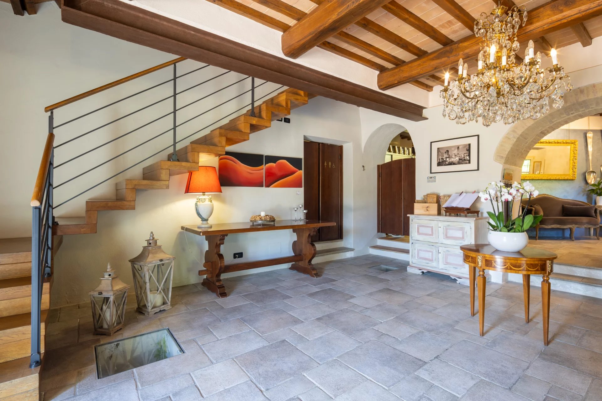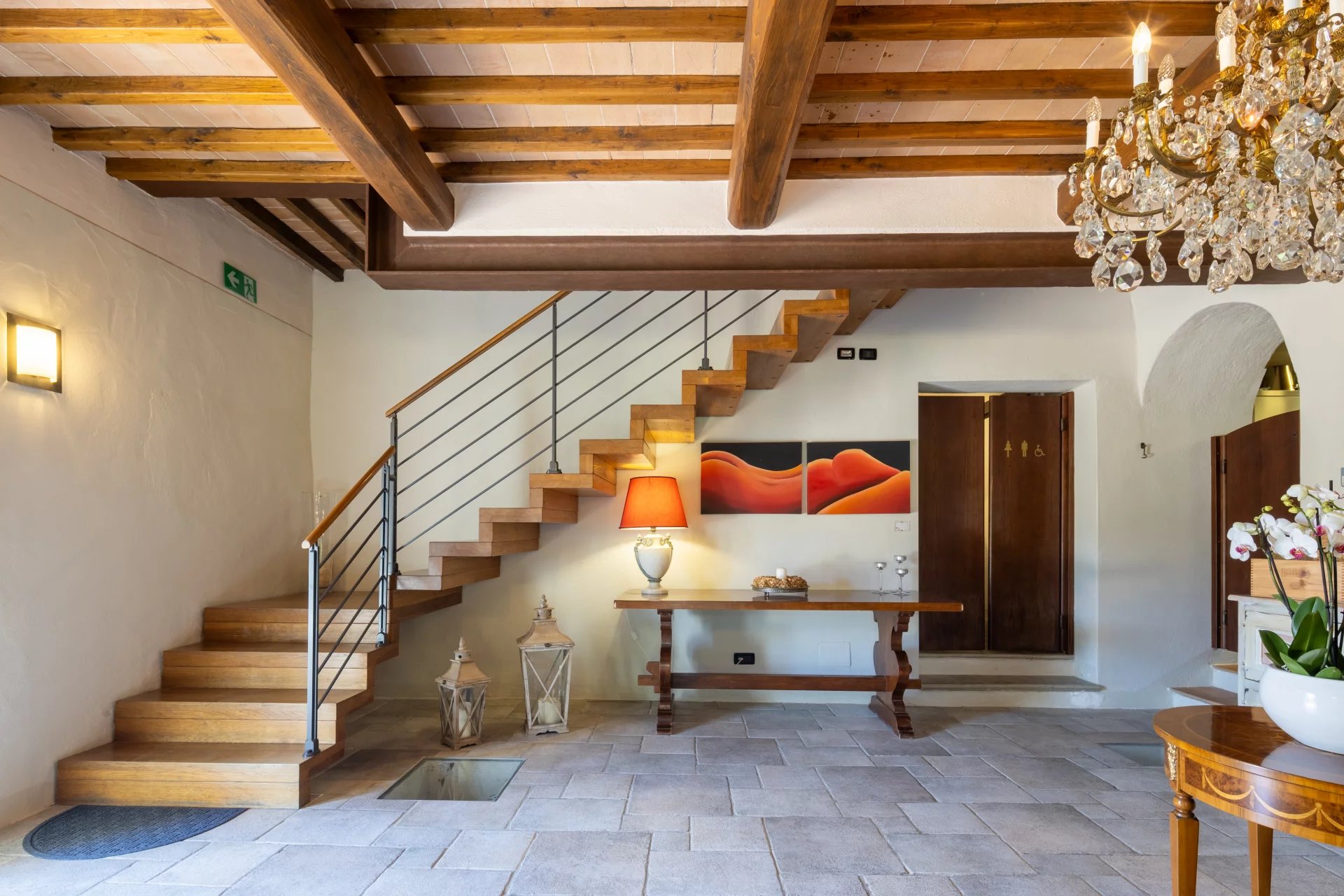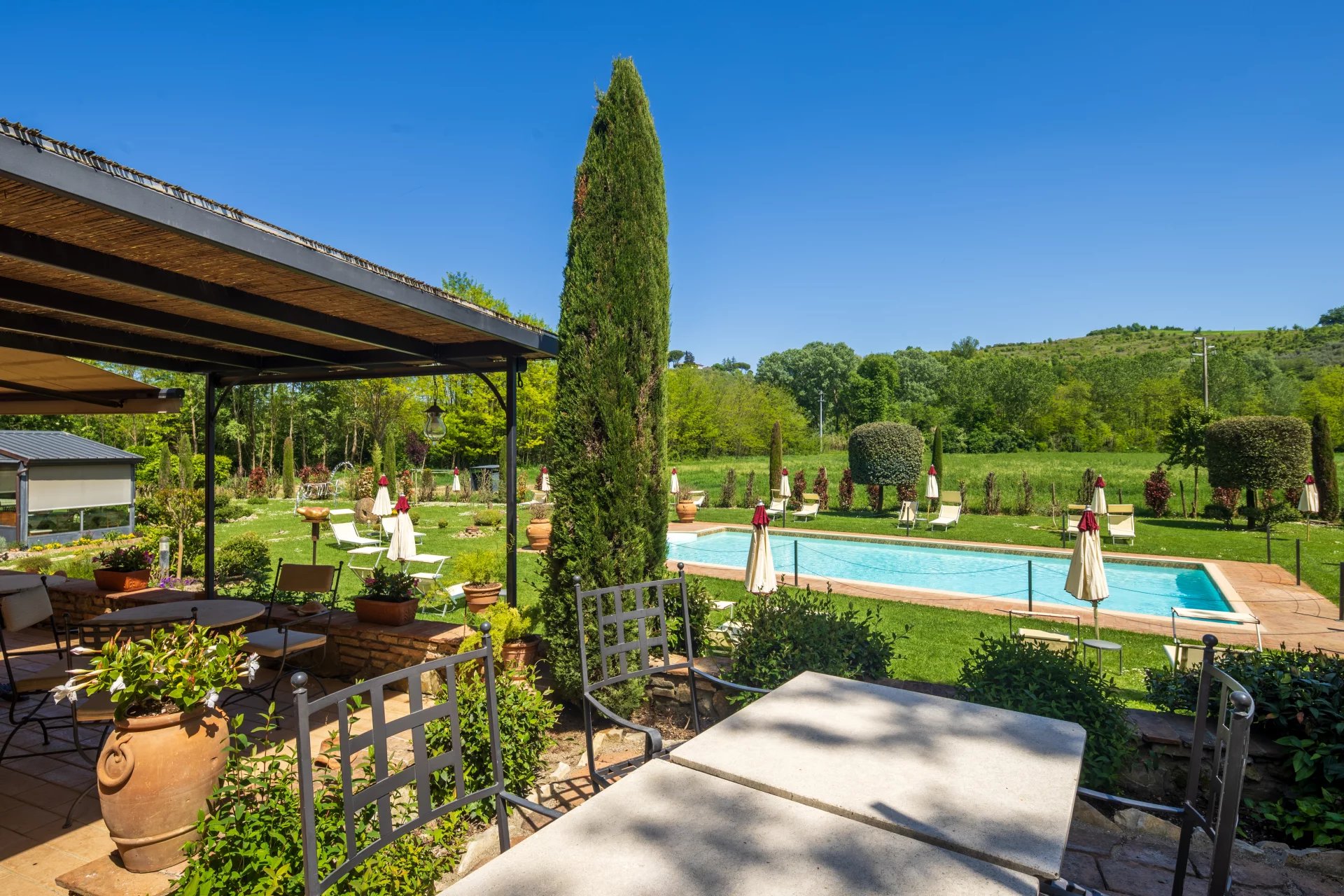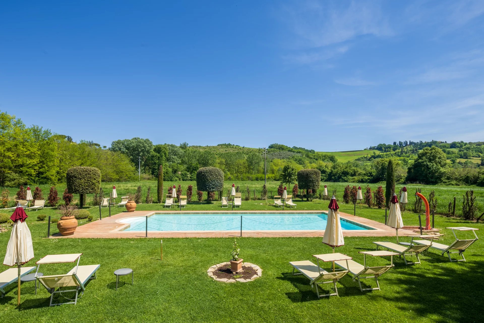 Con una superficie complessiva di circa 600 mq distribuita su due livelli, l’hotel ospita 16 camere, ciascuna unica nel suo stile e arricchita da elementi tradizionali come travi a vista, pavimenti in cotto e viste panoramiche sulle dolci colline toscane. L’atmosfera è quella di una residenza di charme, con interni eleganti pensati per offrire il massimo del comfort. All’esterno, un’ampia piscina di 14x7 metri è incorniciata da curati giardini, un grande terrazzo coperto e ben 4,6 ettari di terreno agricolo che abbracciano la proprietà.