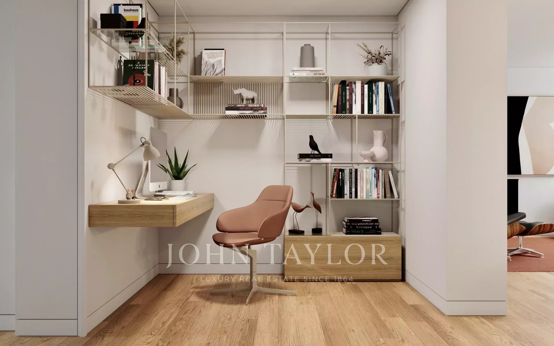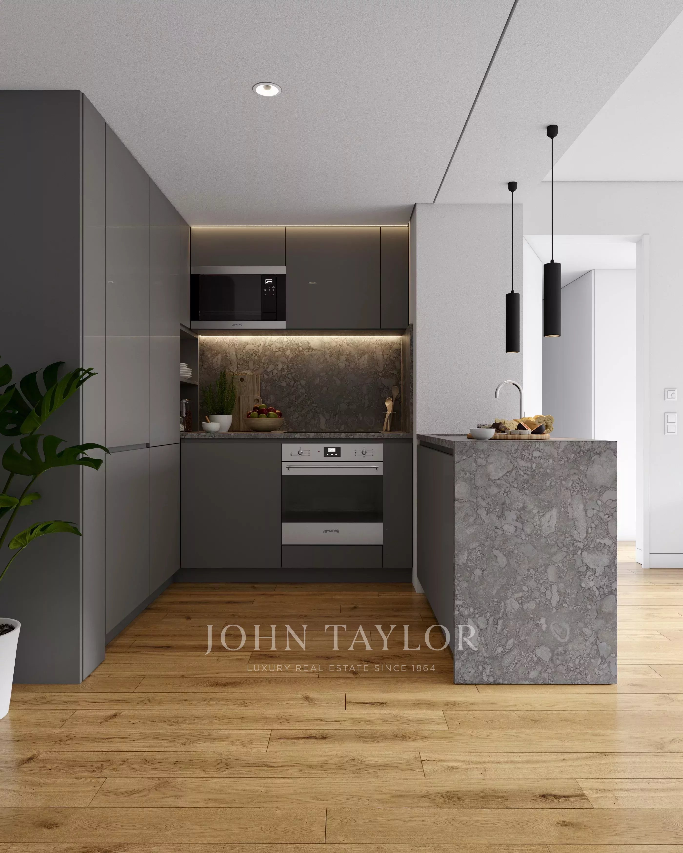 Nuovo appartamento con 2+1 camere da letto e 116 m2 di superficie privata lorda, con 2 suite e un ufficio, parcheggio, aria condizionata, cucina completamente attrezzata, pavimenti in legno e finestre con doppi vetri, con finiture, rivestimenti e materiali di alta qualità.