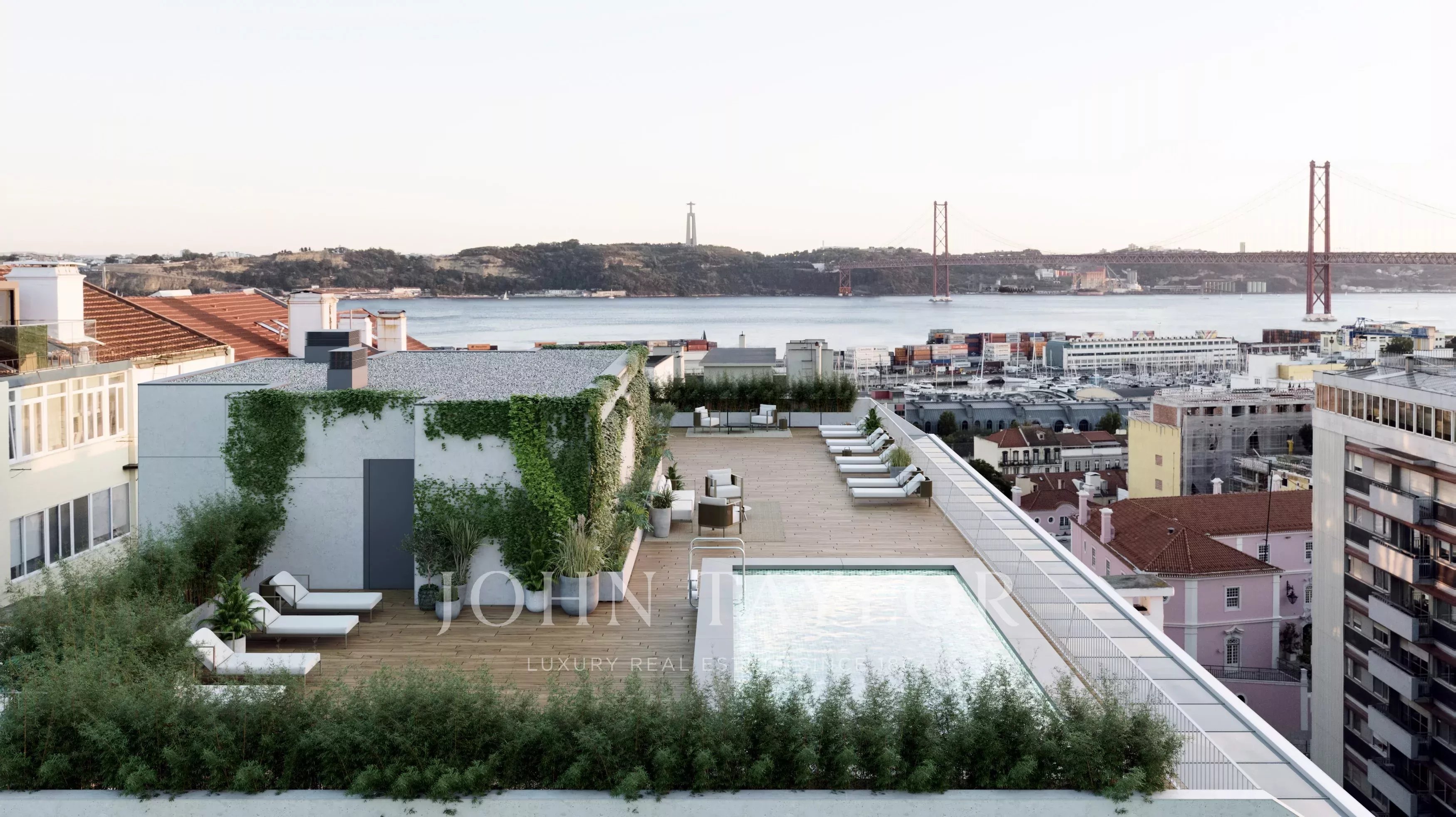 Il condominio Infante Residences ha accesso esclusivo a un elegante tetto con piscina e area di svago, perfetto per godersi la vista panoramica sulla capitale e sul fiume Tago.