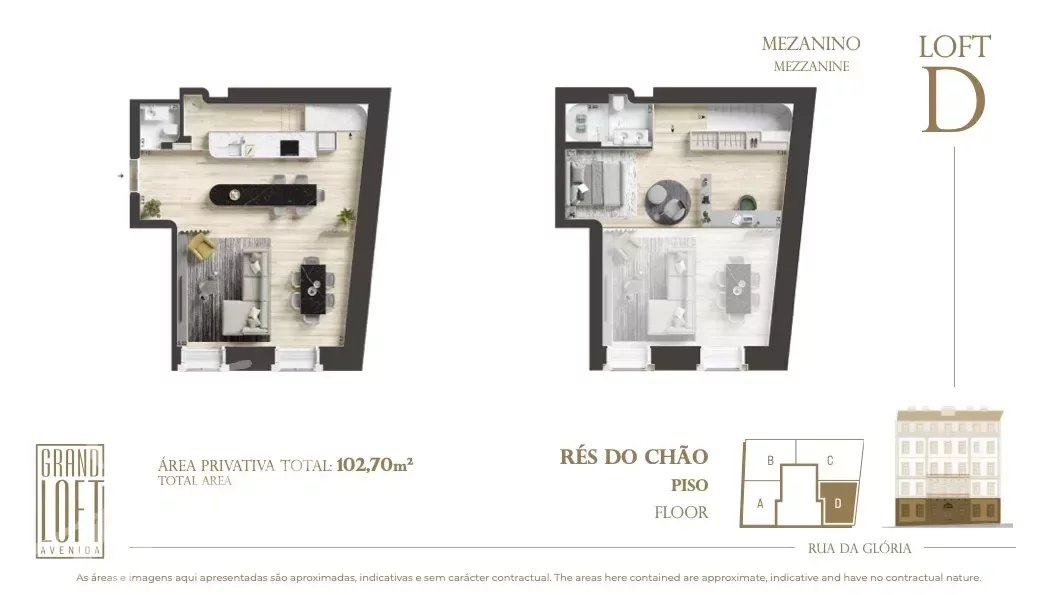 Questo loft con una camera da letto ha una superficie lorda coperta di 102,70 m2 e una vista sulla tipica Rua da Glória.
