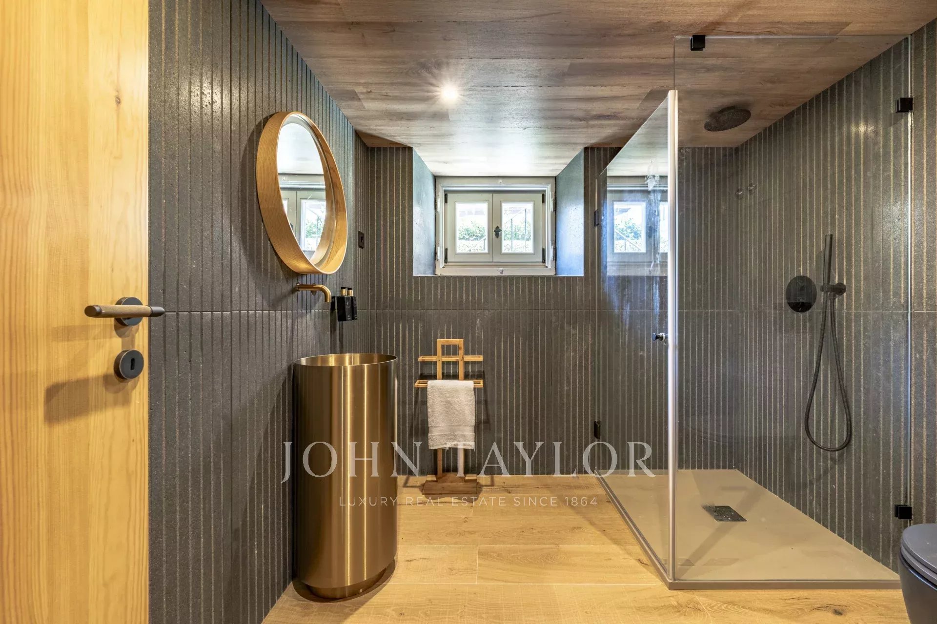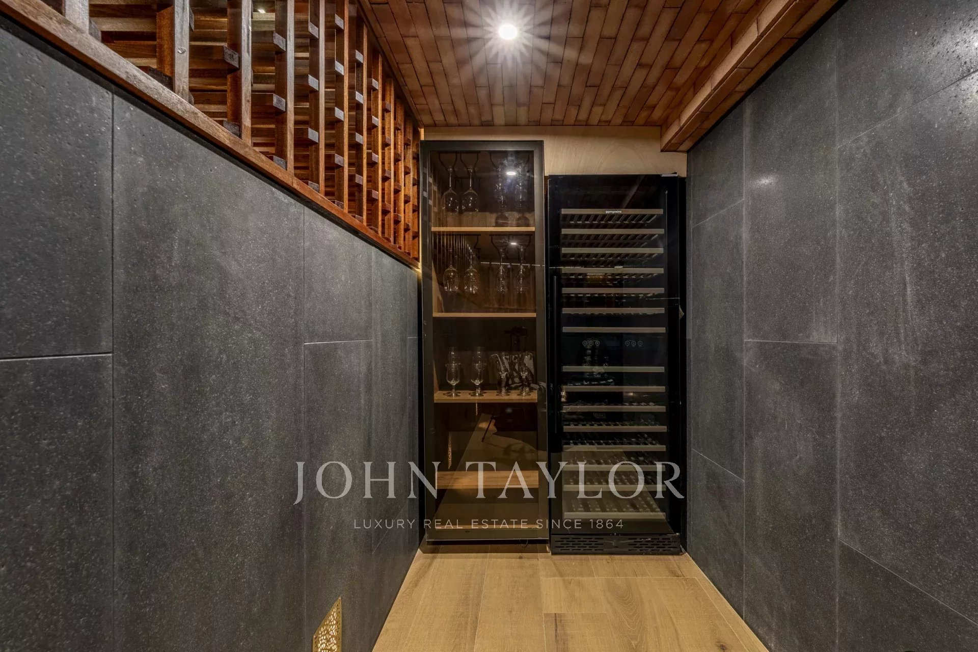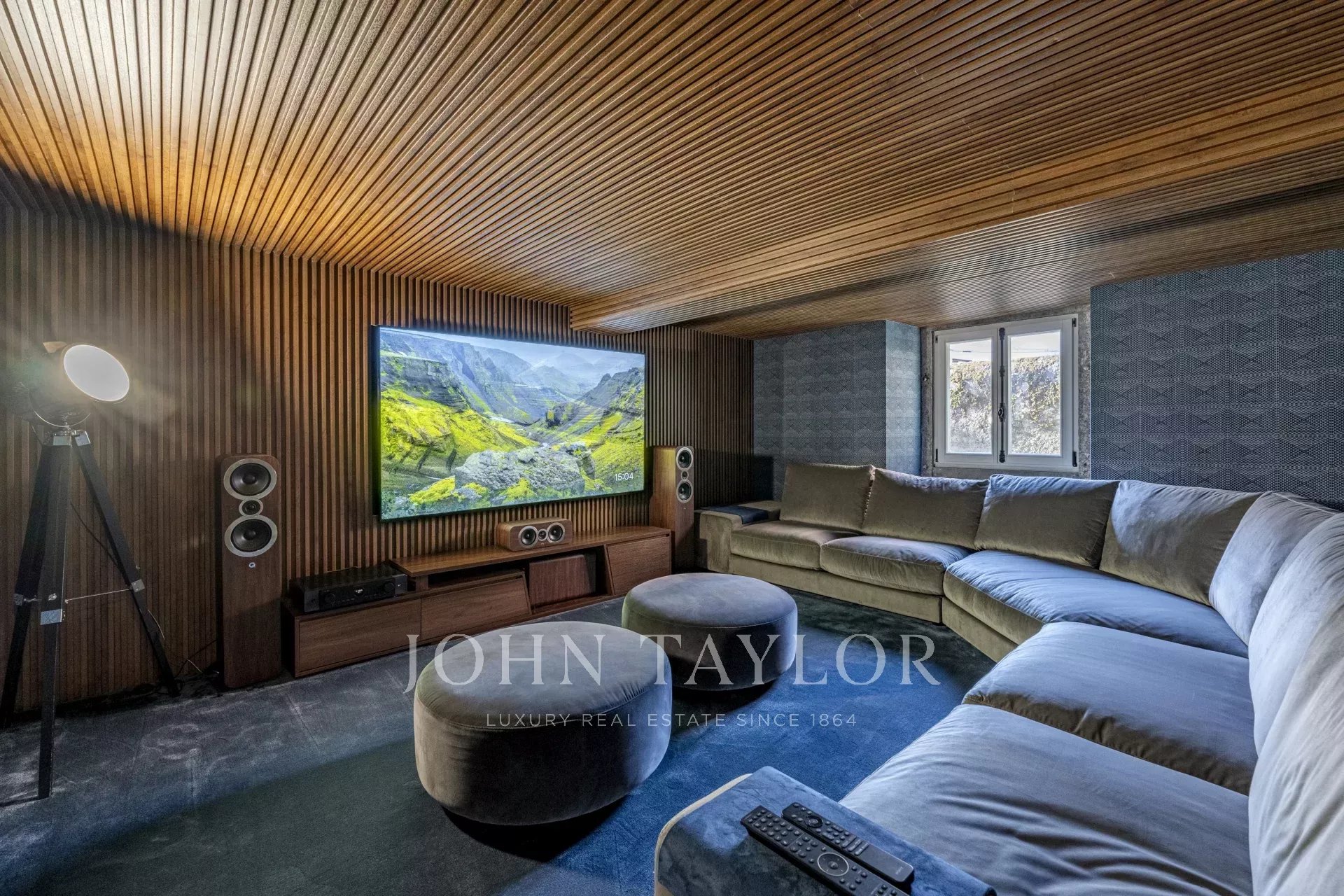 Il piano inferiore offre un'area di intrattenimento con una sala TV insonorizzata, una cantina, una sauna, una lavanderia e un'ulteriore camera da letto.