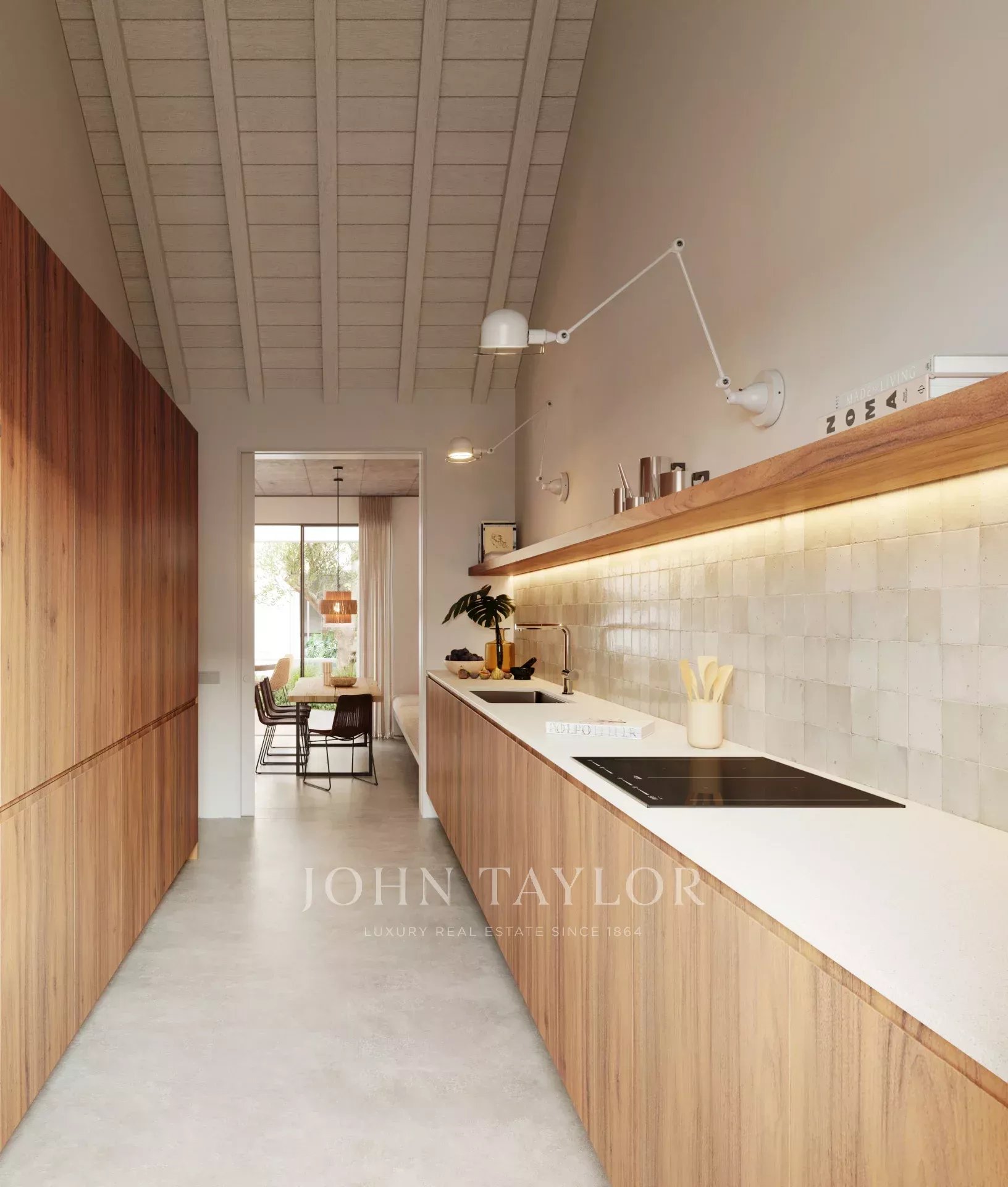 Accesso diretto al giardino e alla piscina, creando una forte connessione tra gli spazi interni ed esterni.