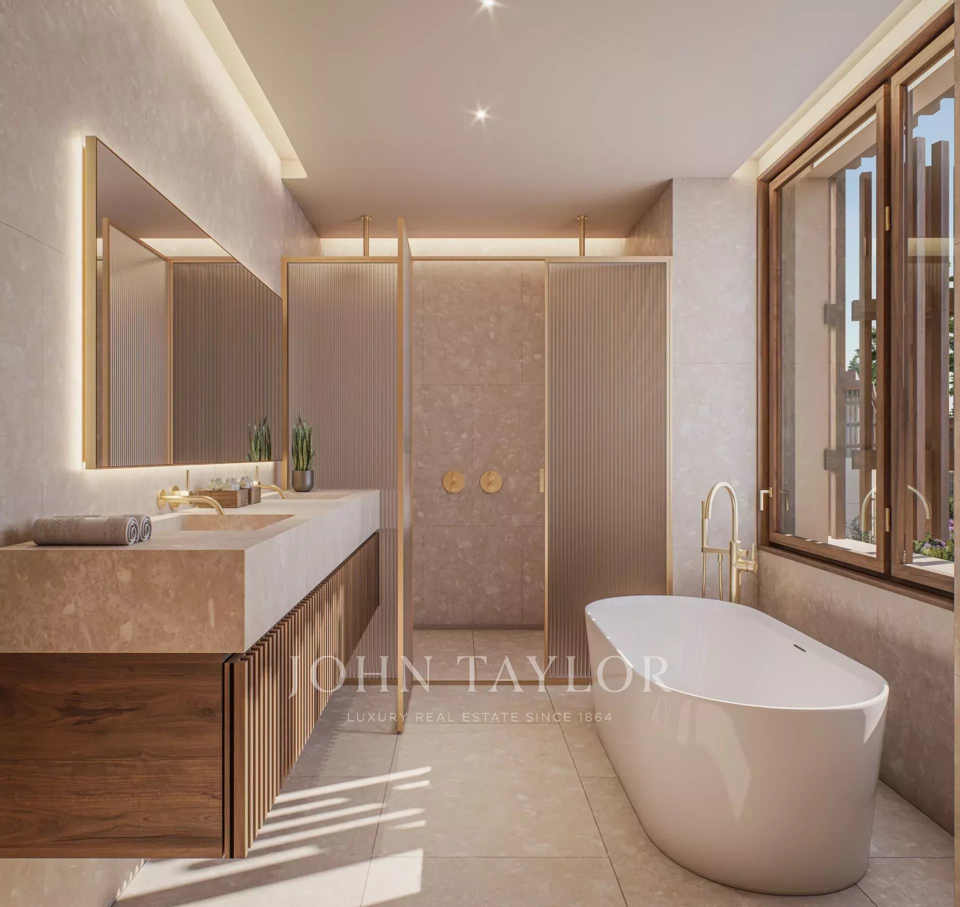 Al piano superiore si trovano una seconda zona giorno, una suite padronale e due camere da letto con bagno privato, tutte con accesso a un ampio balcone con vista mozzafiato.