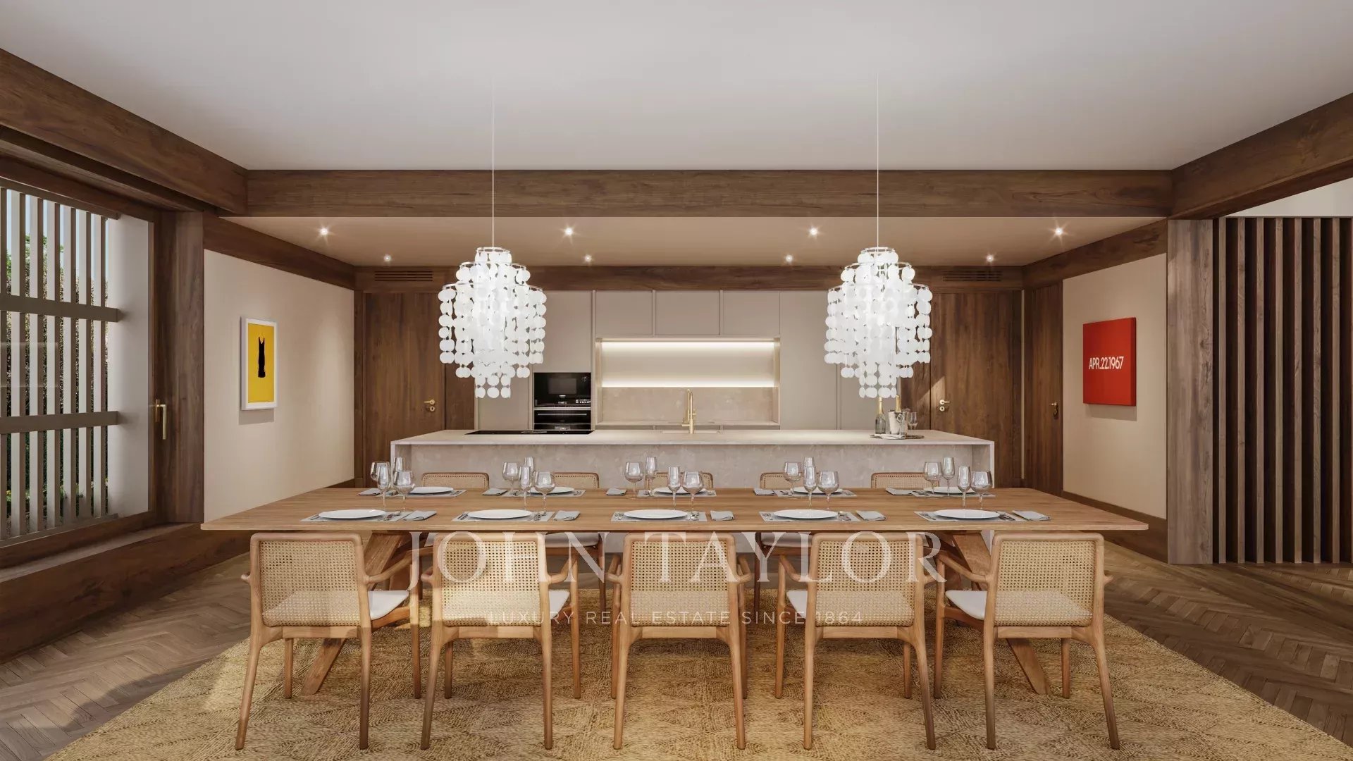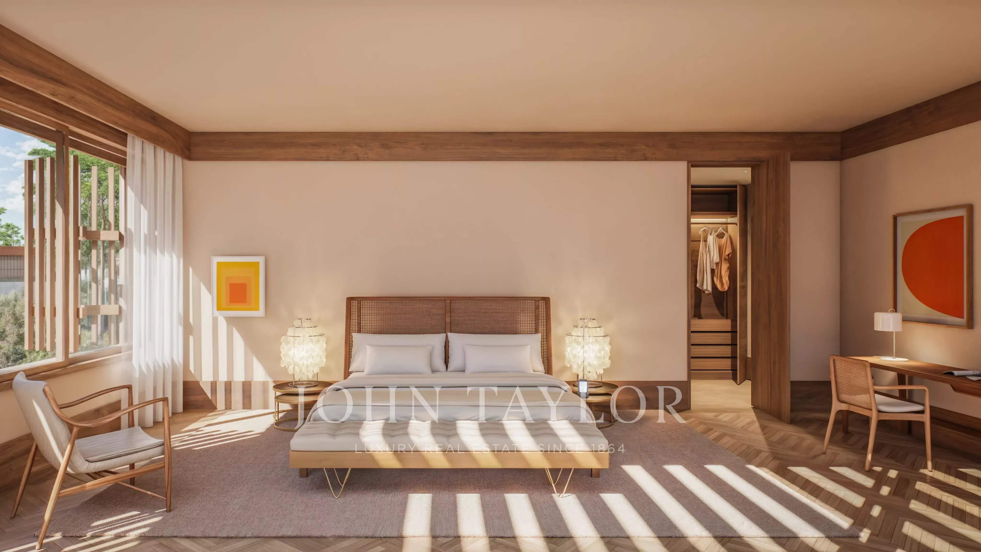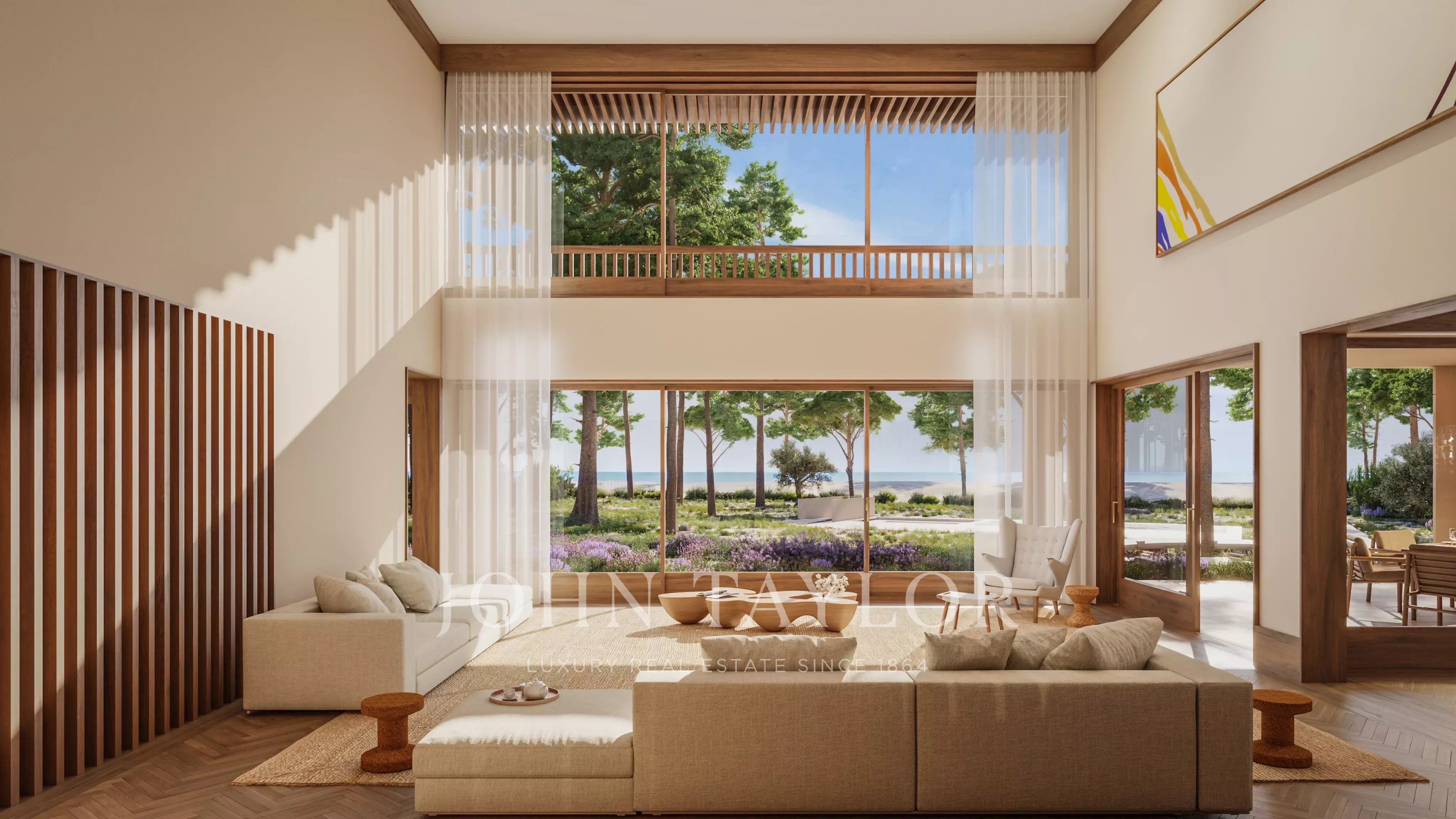 Al piano terra, la villa dispone di un ampio soggiorno e zona pranzo, una cucina completamente attrezzata, un retro cucina, un bagno per gli ospiti, una sala TV, un ufficio privato e una camera da letto en-suite con cabina armadio. Il soggiorno e la sala da pranzo si aprono su un portico con spazi per mangiare e vivere all'aperto. La villa comprende una spaziosa piscina affacciata sulla spiaggia, inserita in un'ampia area esterna.