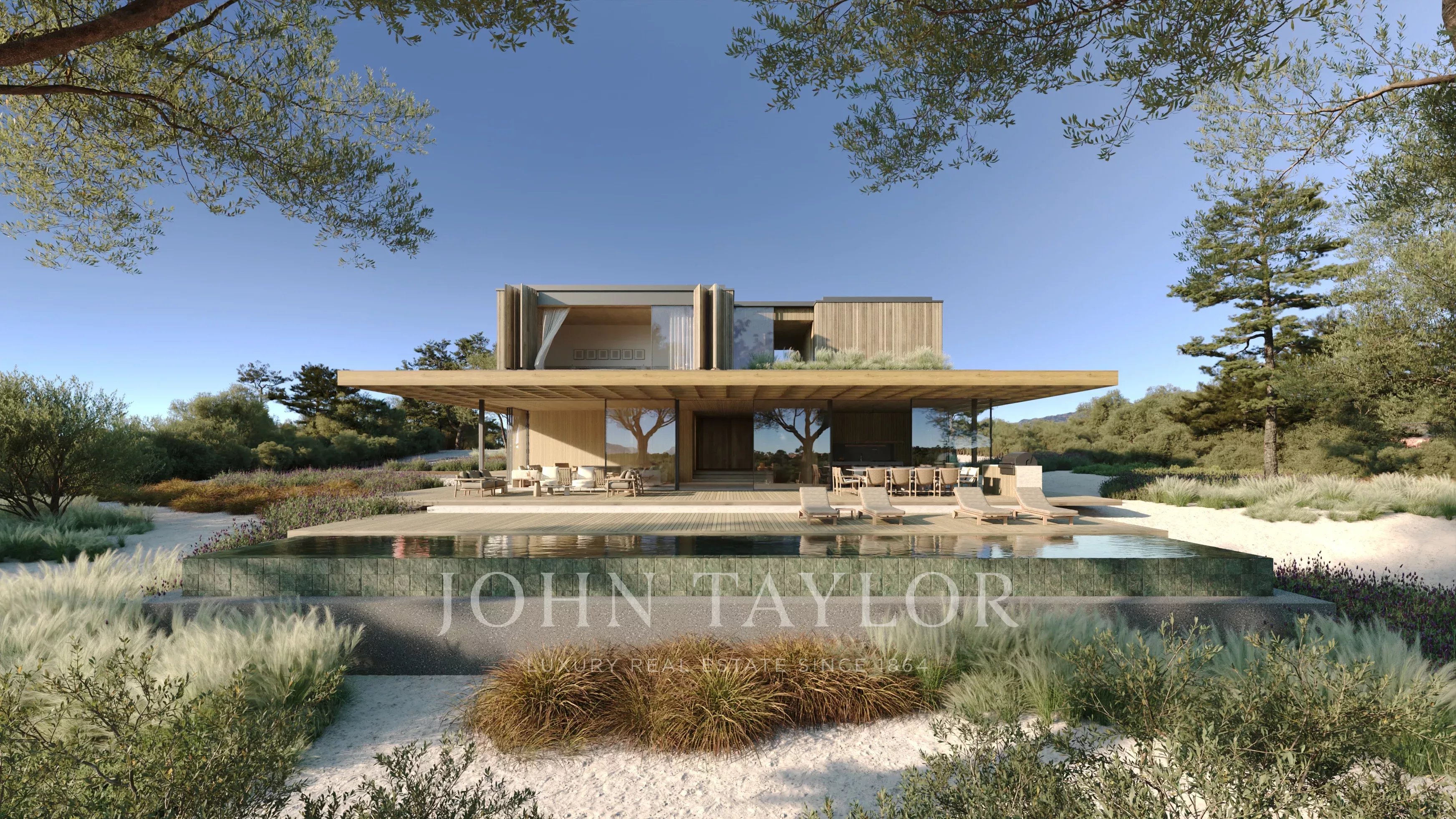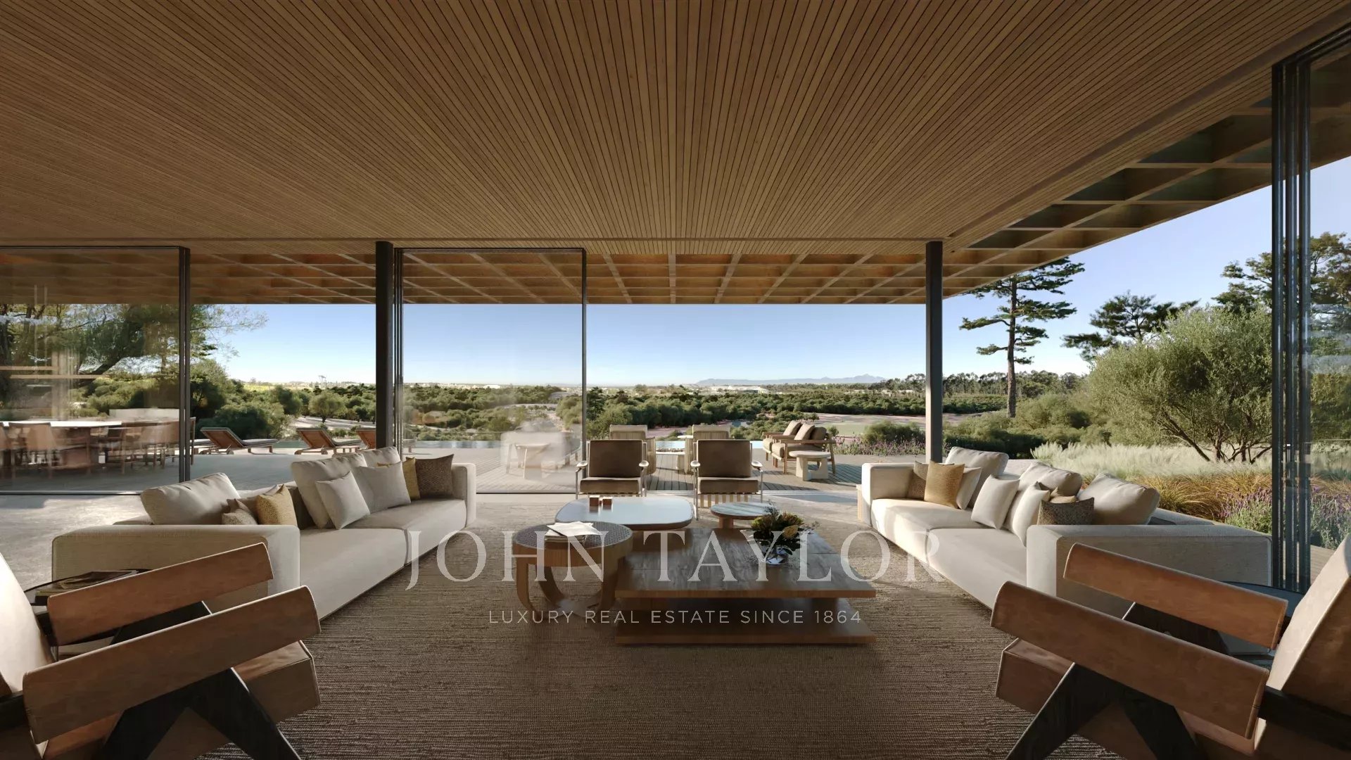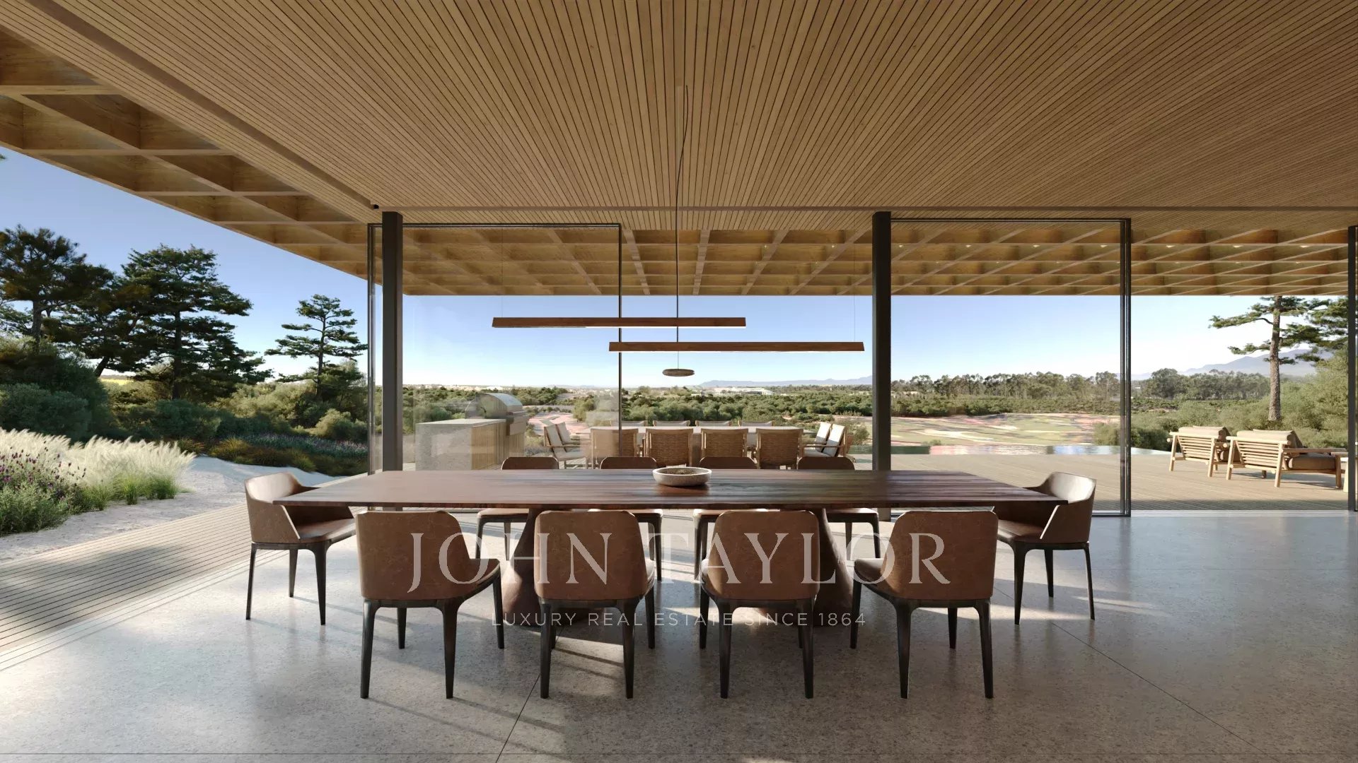 Gli spazi esterni comprendono 220 m² di terrazze e ponti scoperti, oltre a una piscina privata con vista sul campo da golf.