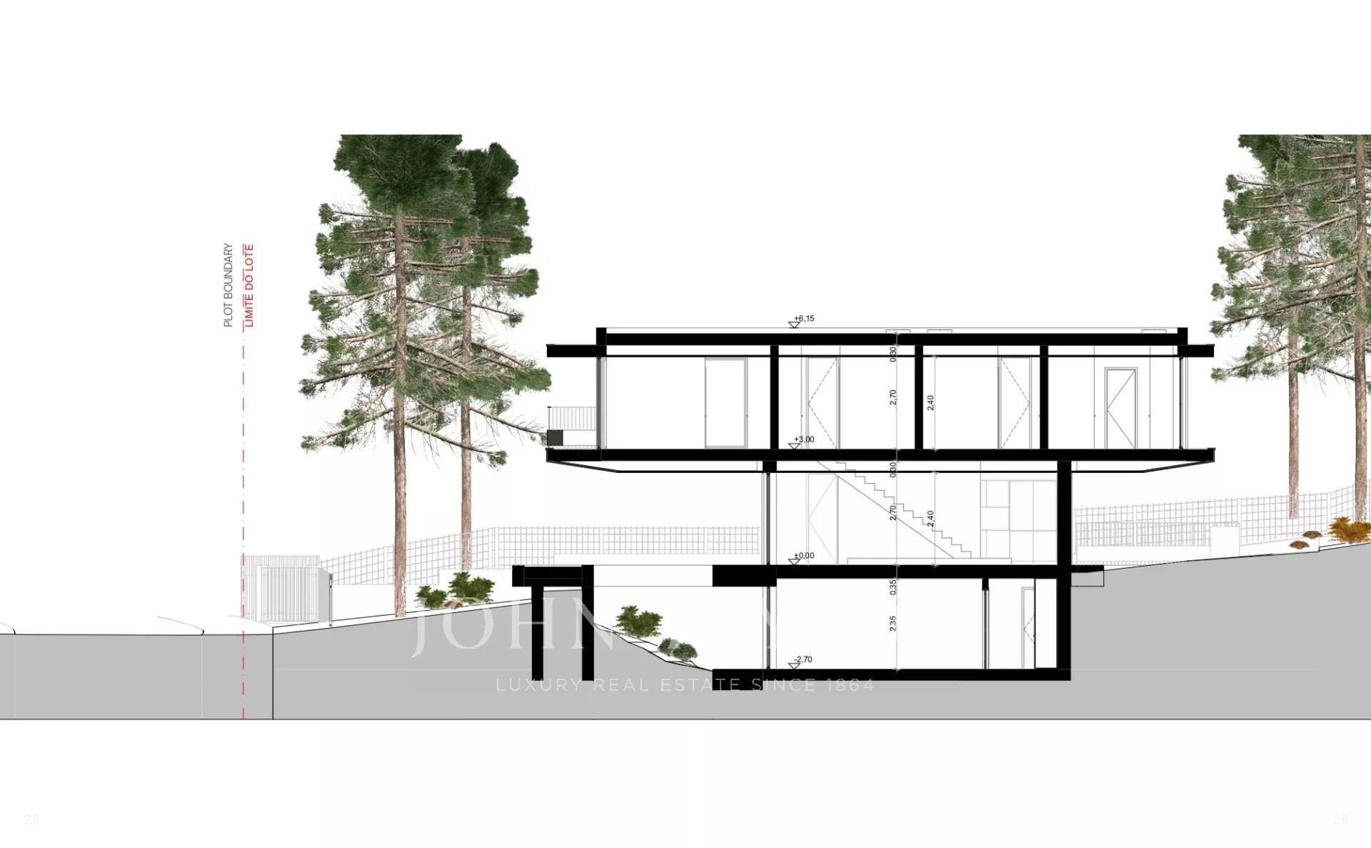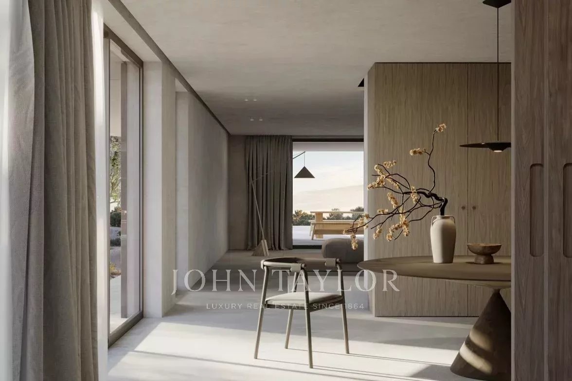 Il piano terra comprende un ingresso di 9 m², un bagno per gli ospiti (4 m²), una cucina (21 m²), una sala da pranzo (29 m²) e un ampio soggiorno di 54 m², tutti progettati per massimizzare la luce naturale e l'accesso diretto alle terrazze esterne e alla piscina di 50 m². La disposizione favorisce una circolazione fluida e una transizione senza soluzione di continuità verso le zone giorno esterne.