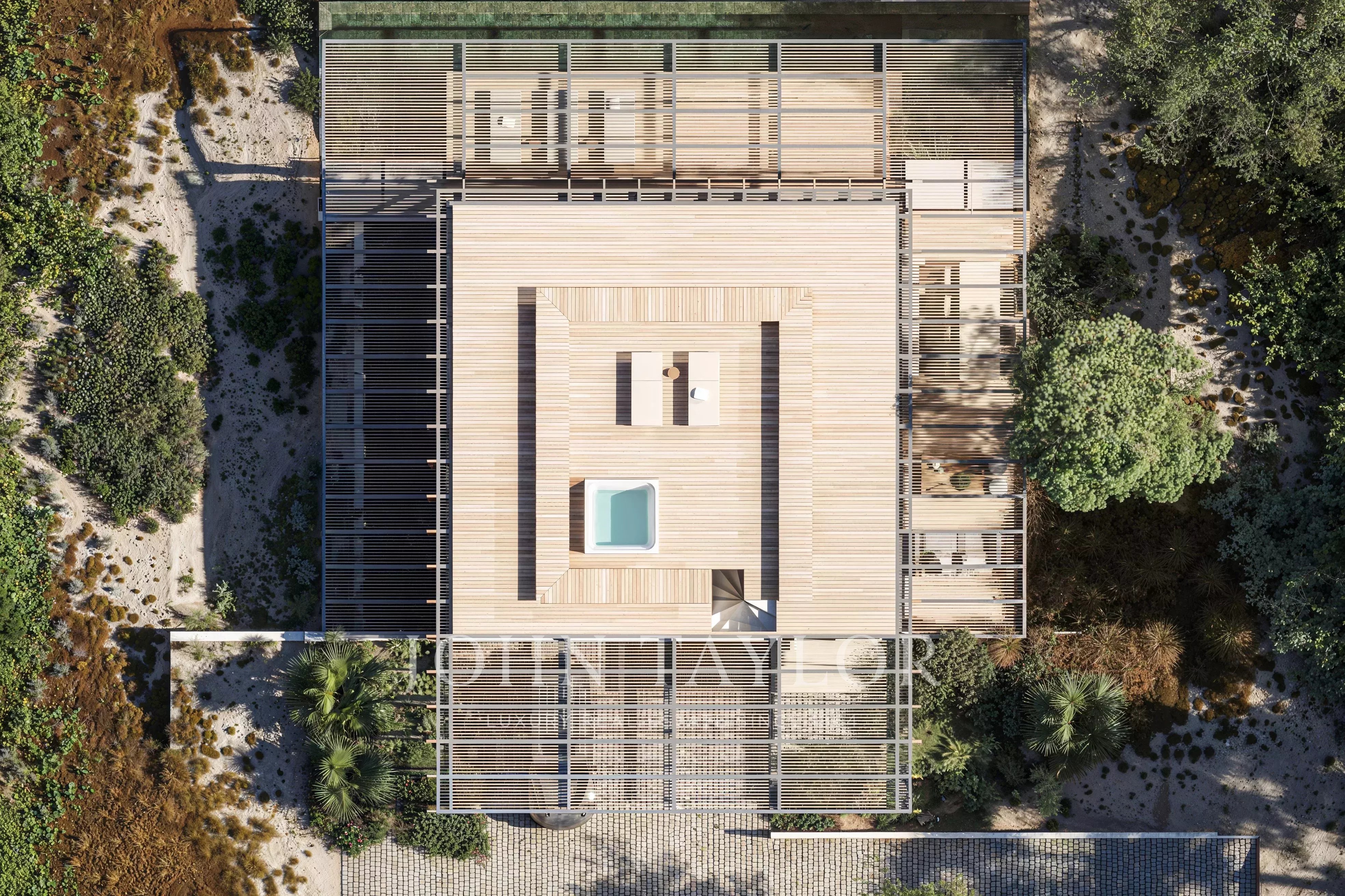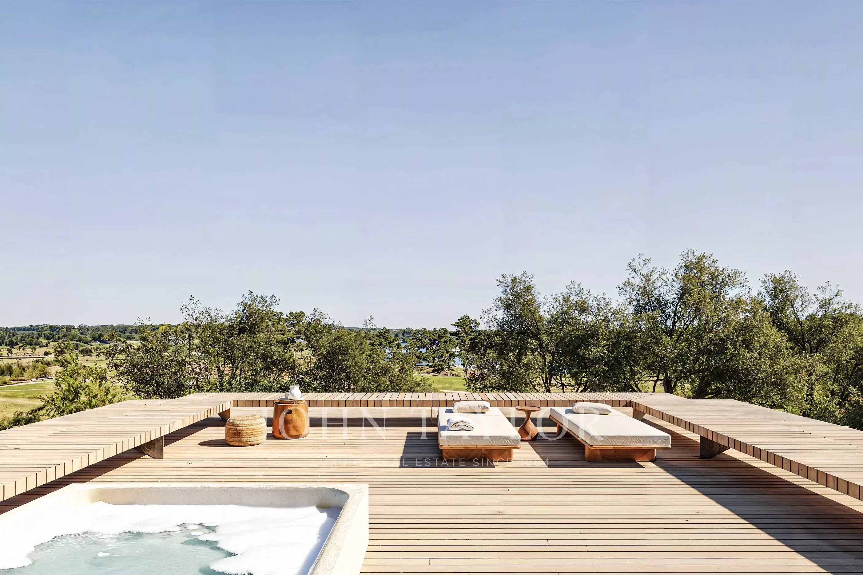 Una terrazza panoramica sul tetto di 39 m² con vasca idromassaggio corona la proprietà, offrendo uno spazio elevato per la contemplazione e una vista ininterrotta sul campo da golf e sulla natura circostante.