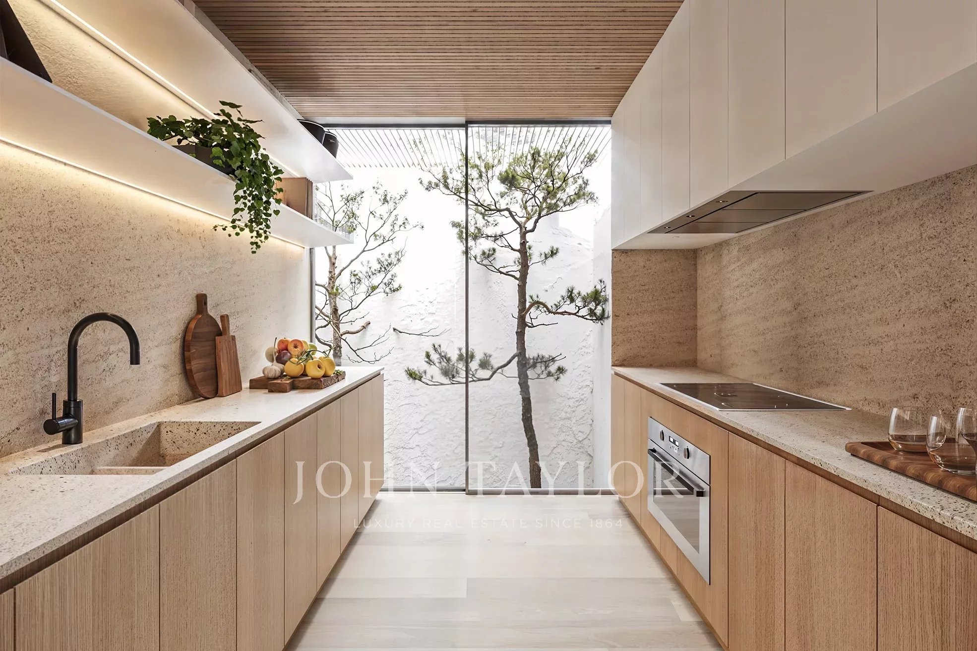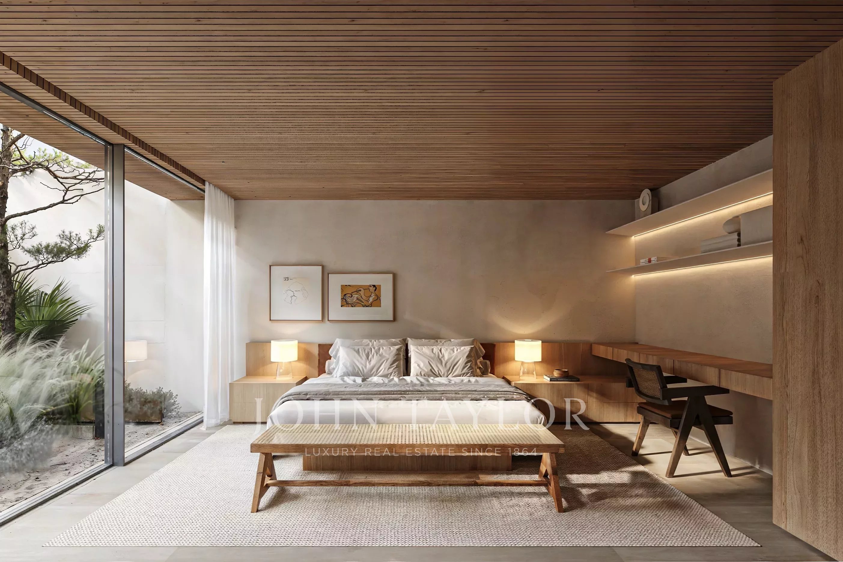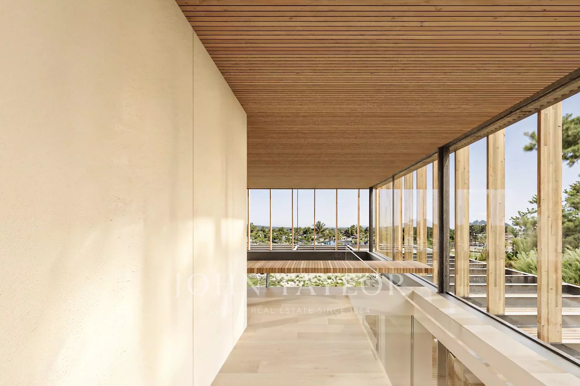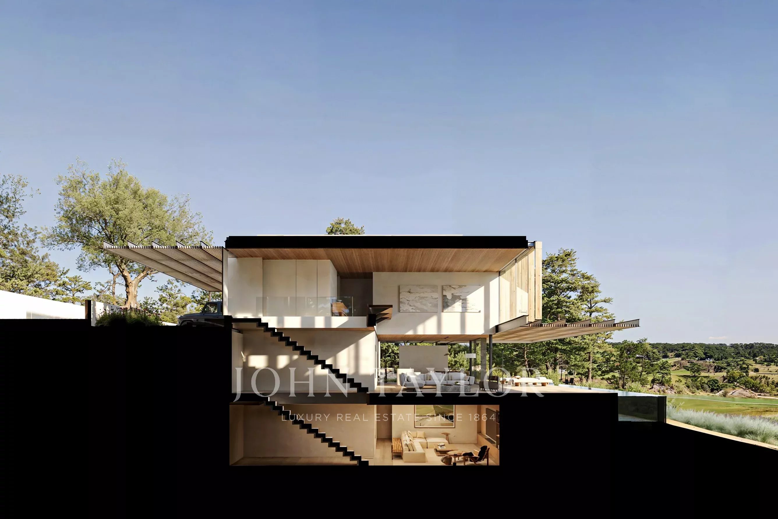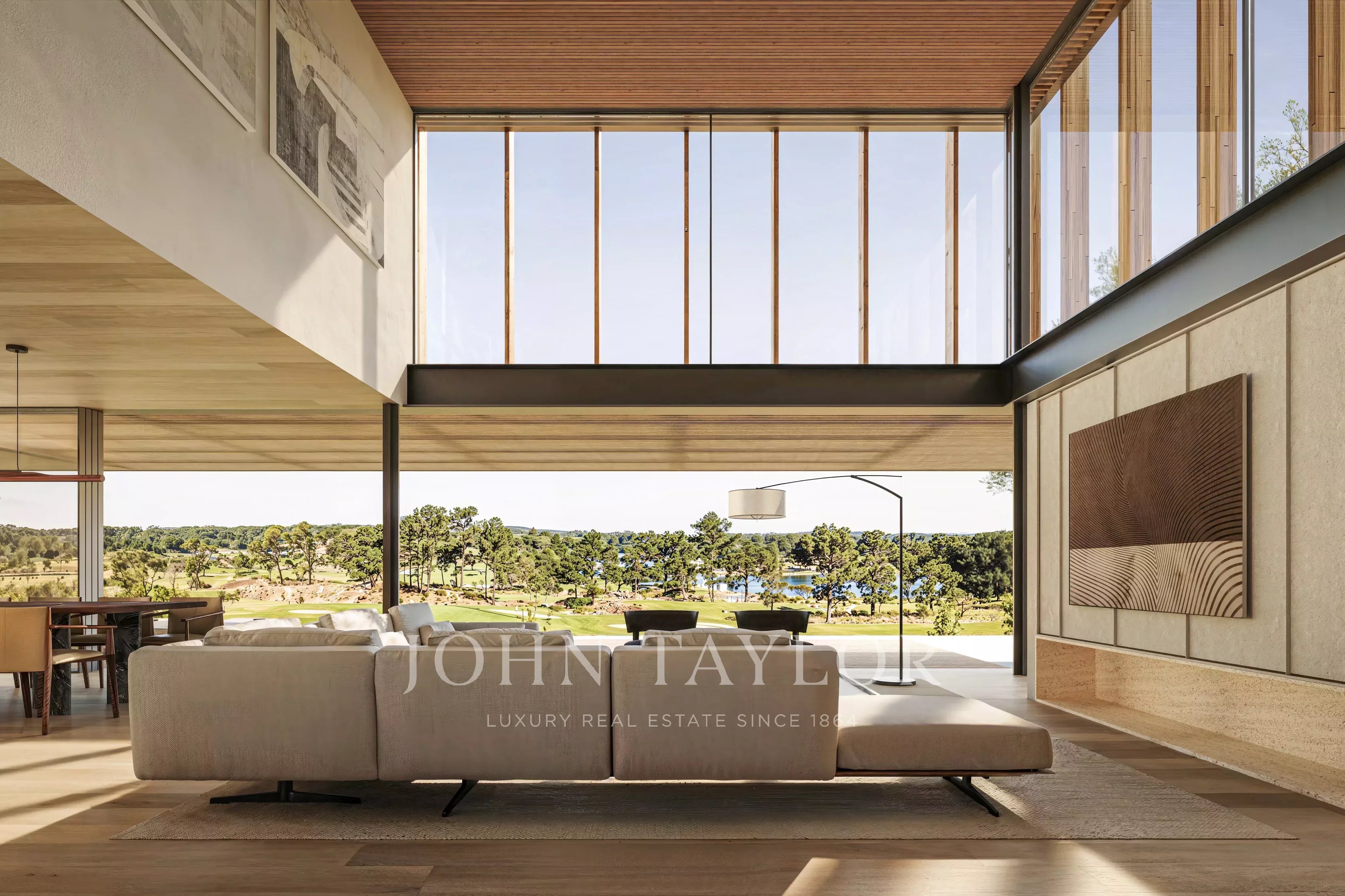Al piano terra si trovano un soggiorno a doppia altezza di 33 m², una sala da pranzo di 39 m², una cucina di 15 m² e una camera da letto con bagno privato (15 m²), che si aprono su generosi spazi esterni, tra cui un ponte di 22 m², un ponte per la piscina di 40 m² e una piscina di 68 m² affacciata sul campo da golf.