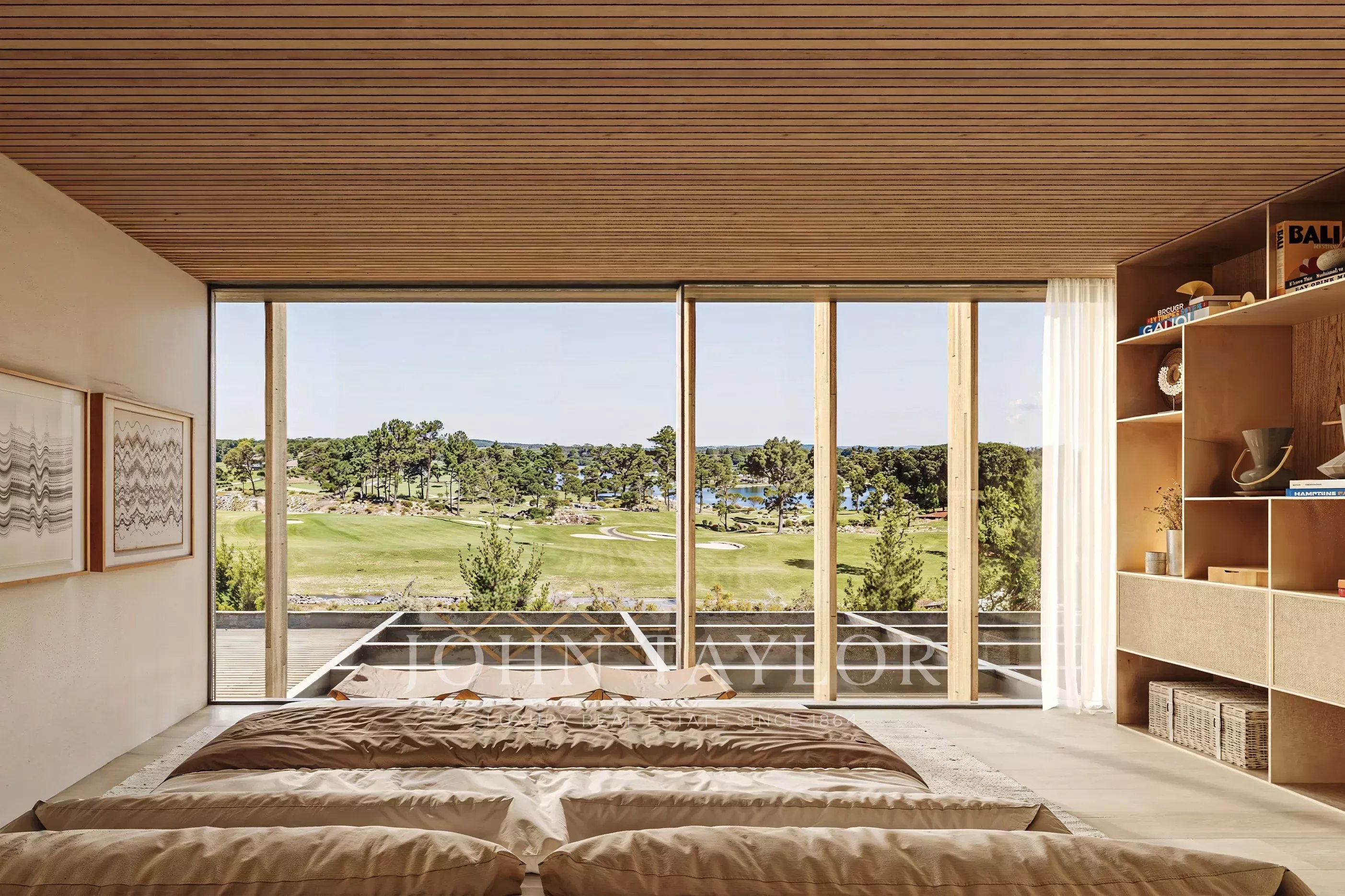 Il piano superiore comprende la suite principale di 24 m² con un bagno di 17 m², un'ulteriore camera da letto con bagno di 19 m² e l'accesso al garage di 47 m². La disposizione mantiene la privacy e incornicia viste elevate sui fairway e sulla pineta.