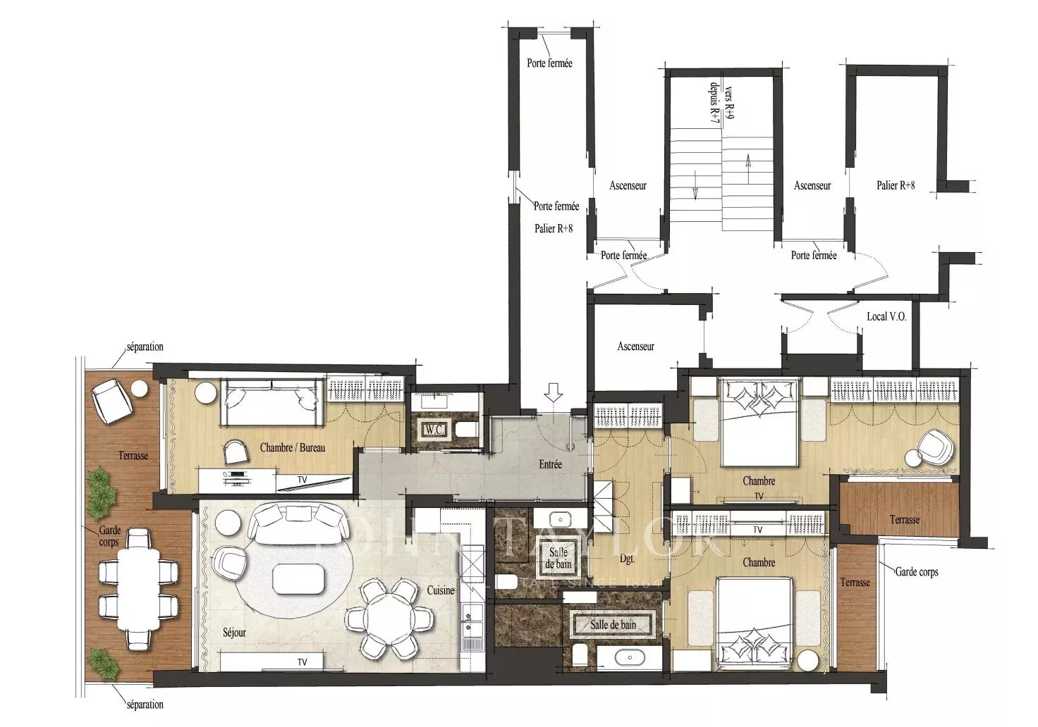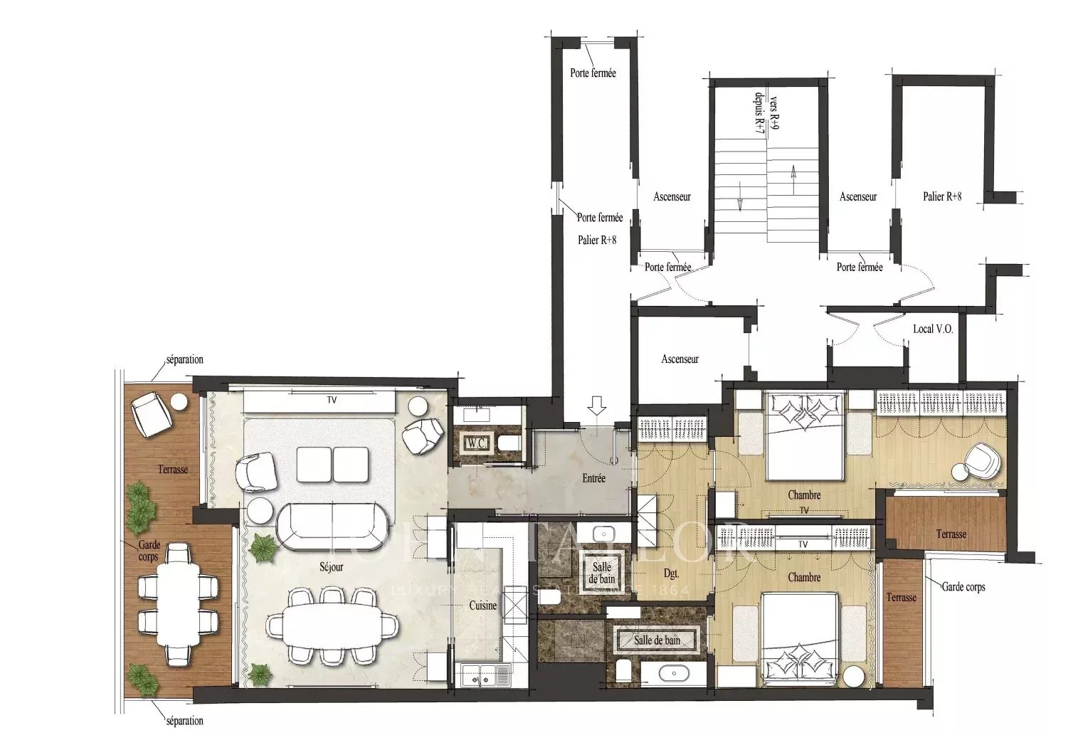 È composto da un ampio soggiorno, una cucina e una camera da letto sul davanti, che beneficiano di una splendida vista sul mare senza ostacoli, che porta luce e chiarezza.
