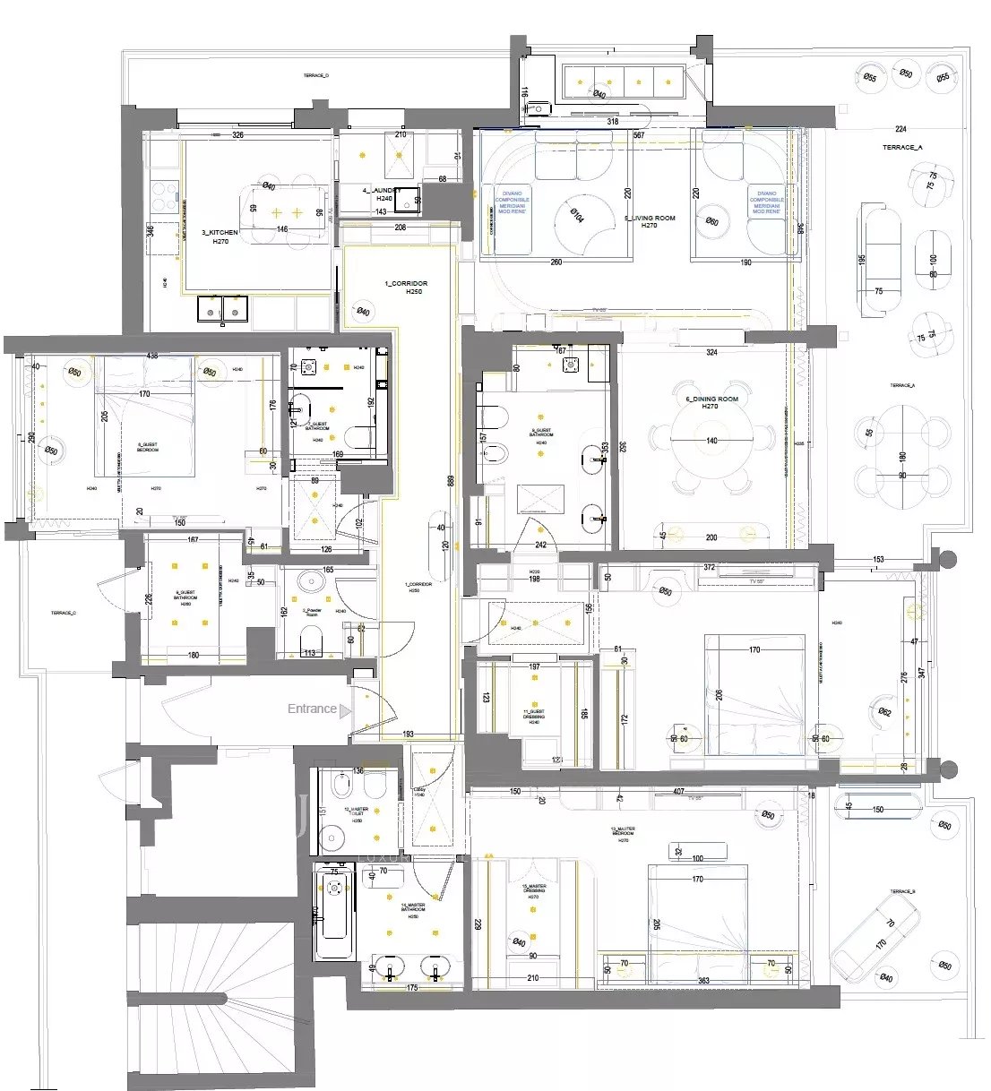L'appartamento è composto da tre spaziose camere da letto con bagno privato e spogliatoi attrezzati, oltre a un luminoso doppio soggiorno che si estende su un'ampia terrazza con zona bar, ideale per godersi la vista panoramica. La cucina indipendente completamente attrezzata è dotata di un ripostiglio adiacente, mentre una stanza per la cameriera e un bagno per gli ospiti completano la dotazione.