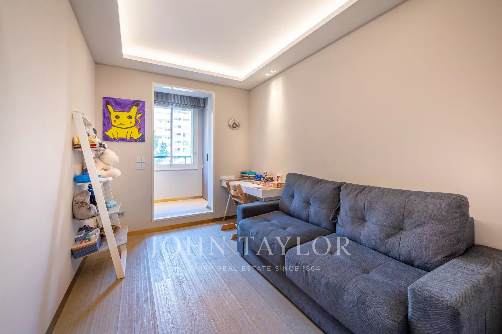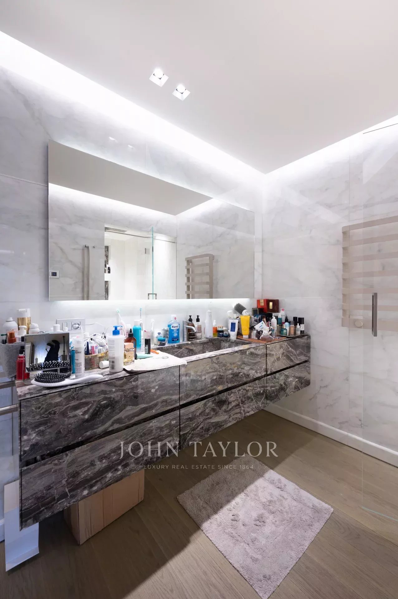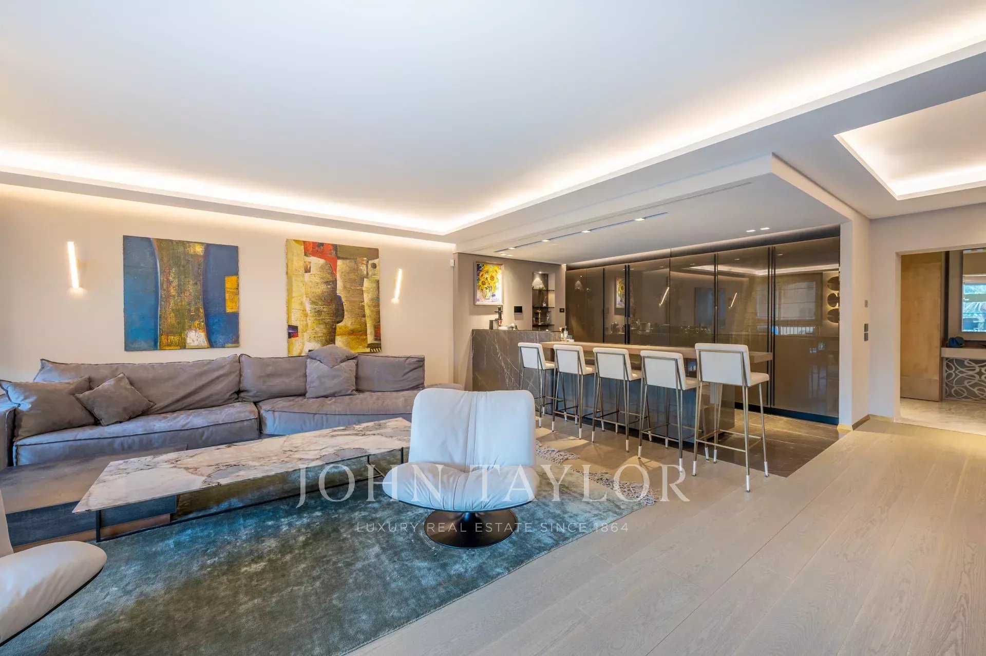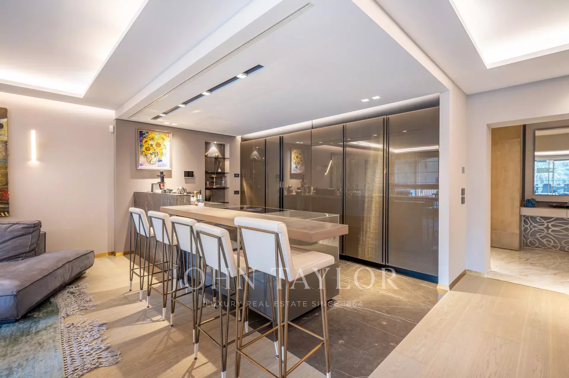 Con una superficie di 245 mq, esposto a sud, questo elegante appartamento, completamente ristrutturato in un lussuoso stile contemporaneo, è molto luminoso e soleggiato.