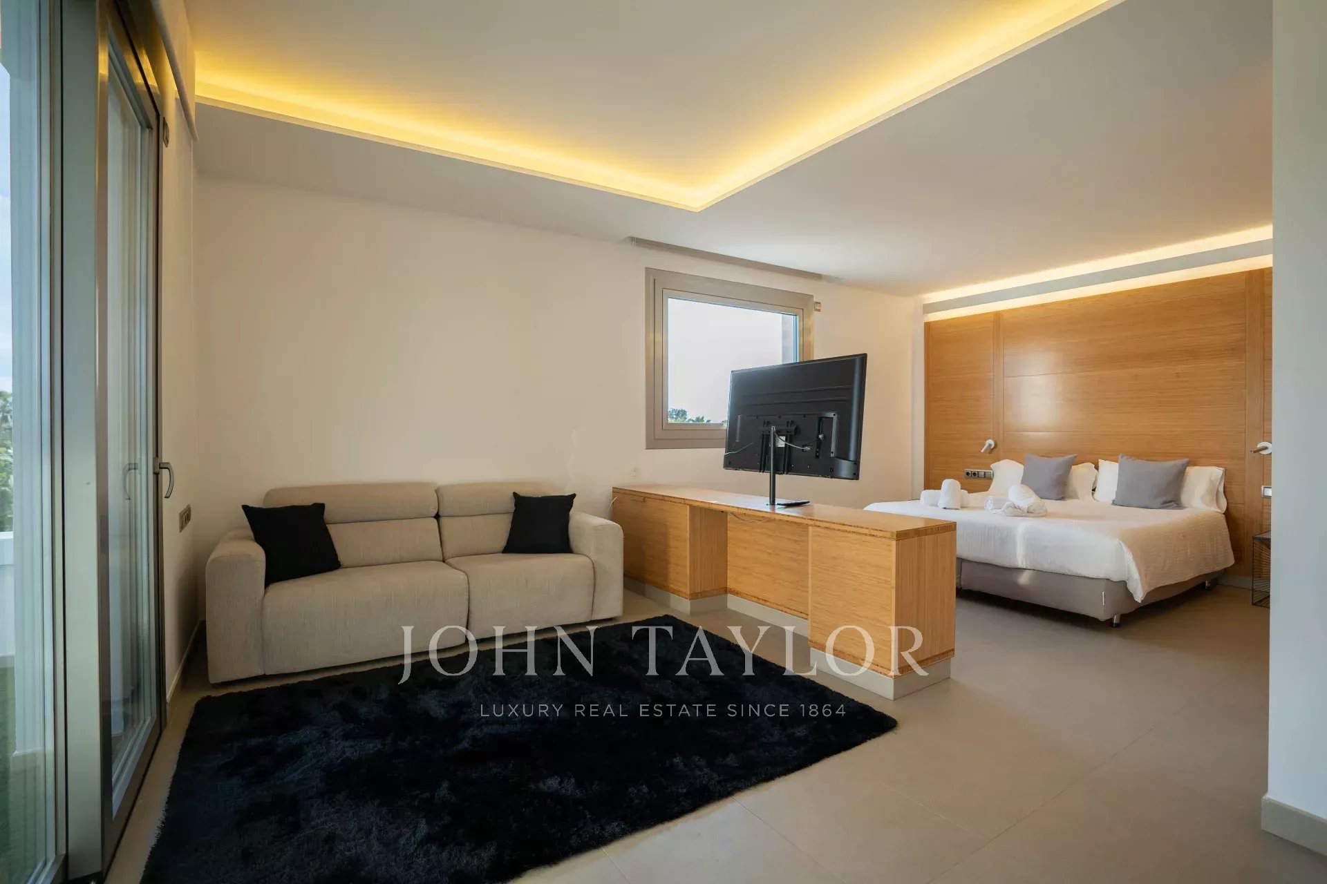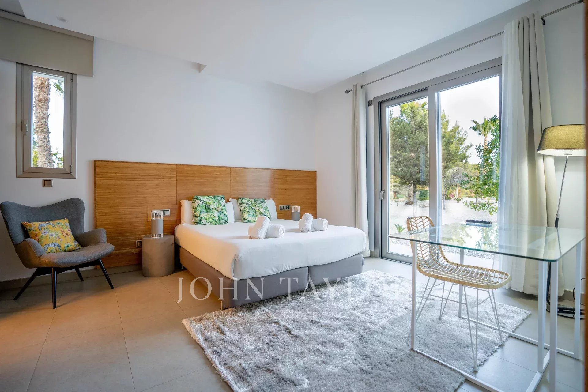 All'interno, la villa può ospitare fino a 14 persone. Nella casa principale ci sono sei camere da letto distribuite su due piani: tre al piano terra e altre tre al primo piano, cinque delle quali hanno il proprio bagno. Inoltre, al piano superiore, si trova una camera matrimoniale con vasca idromassaggio e terrazza privata. Inoltre, l'appartamento adiacente, con accesso privato, dispone di altre due camere da letto, bagni, cucina completamente attrezzata e soggiorno.