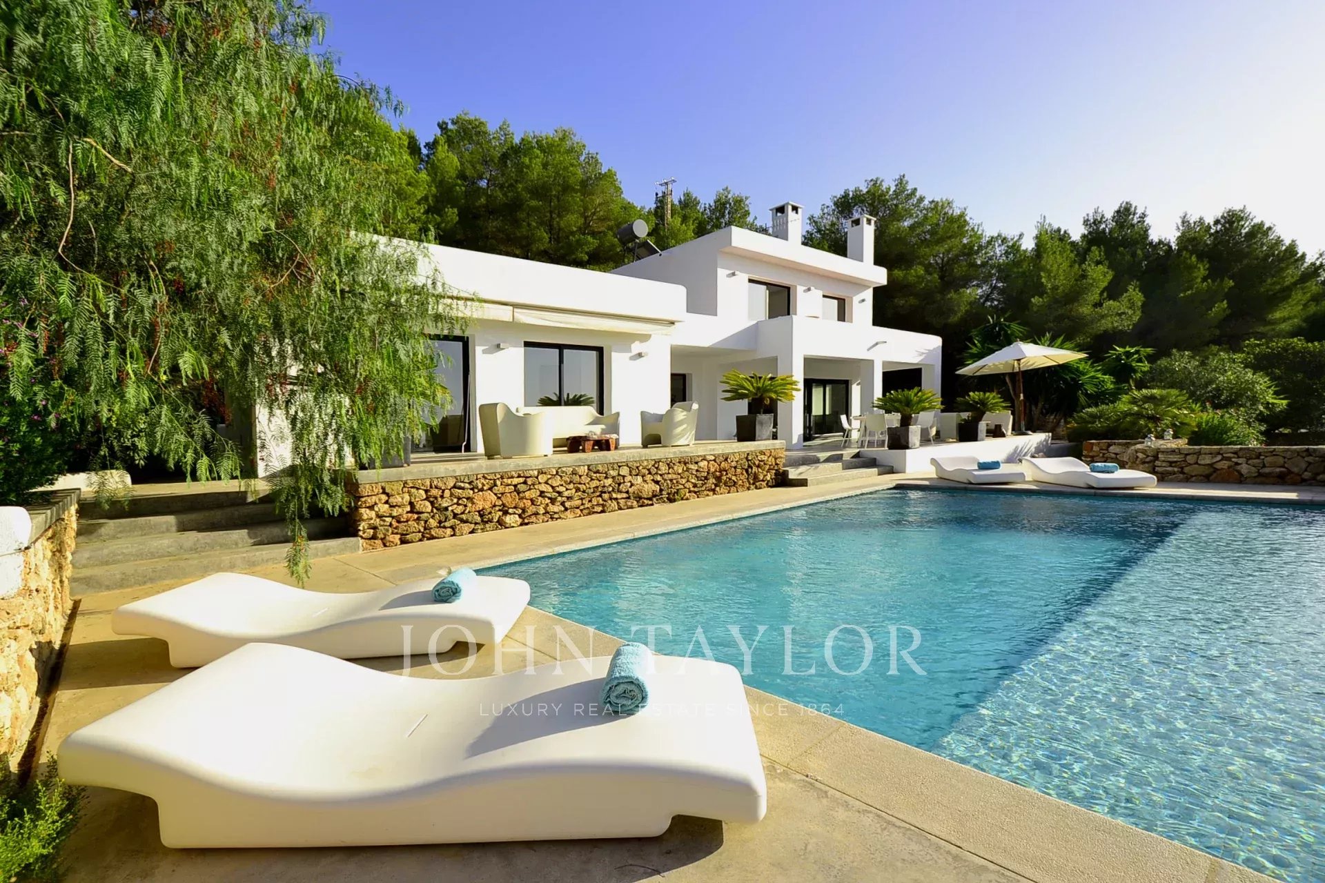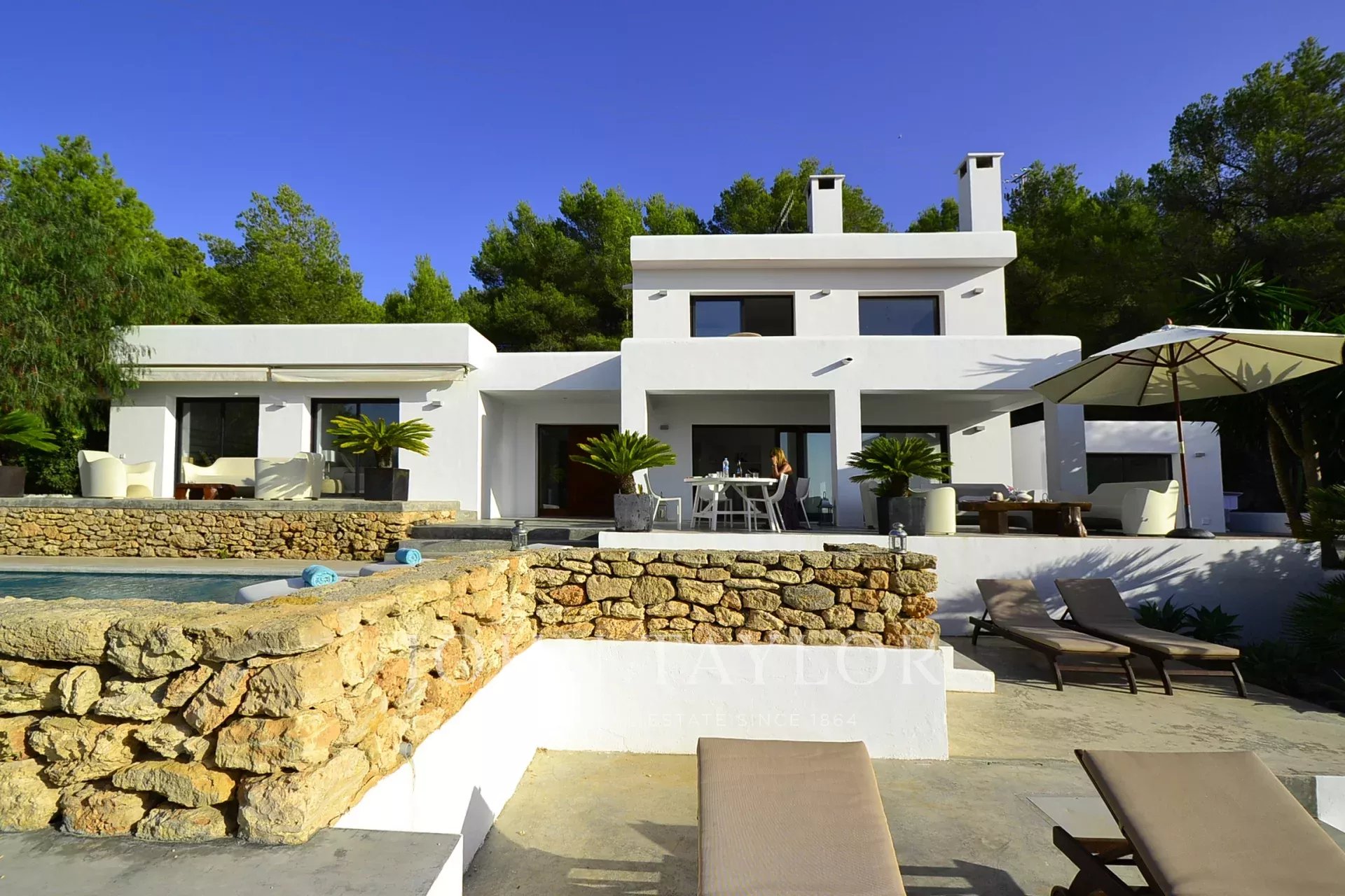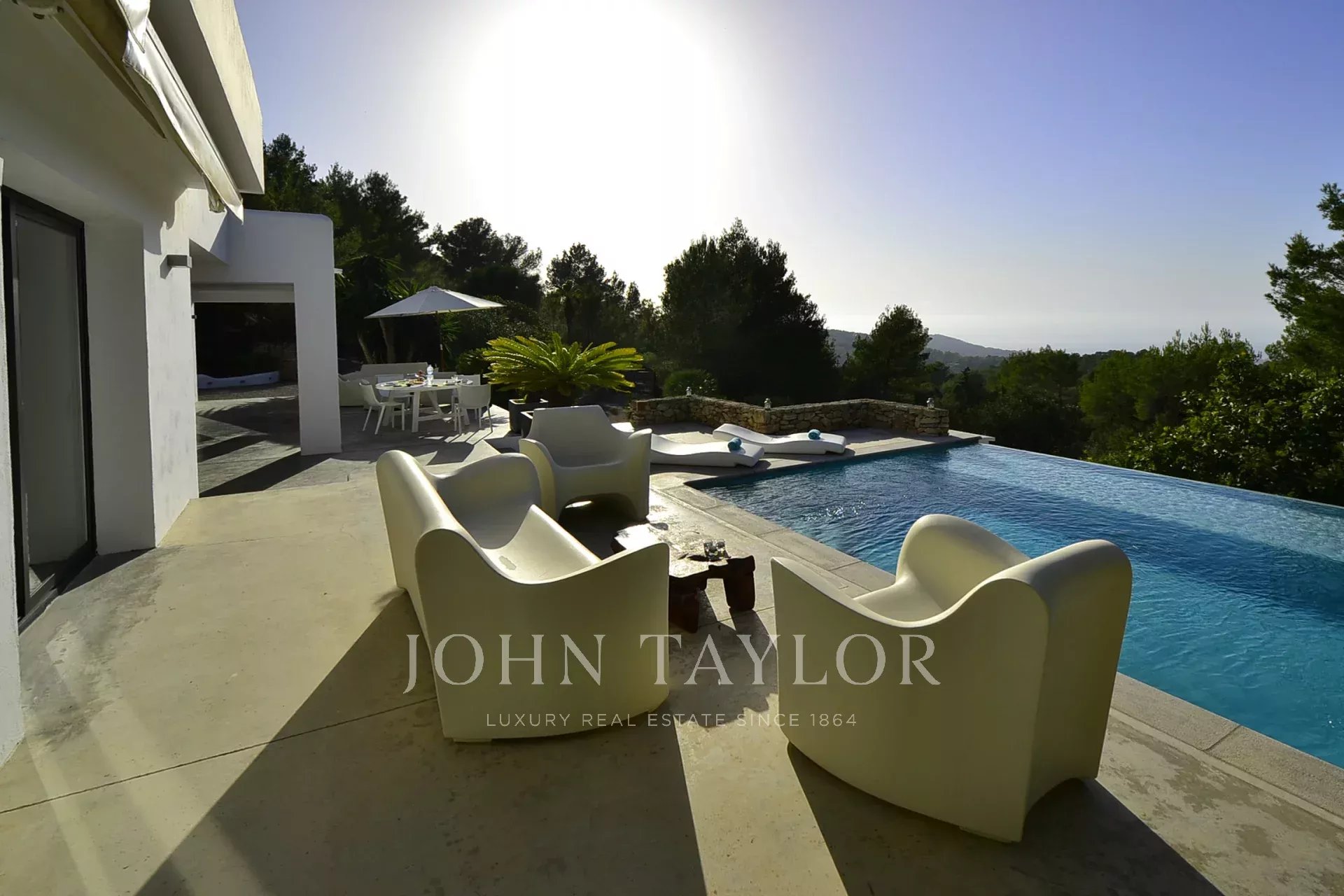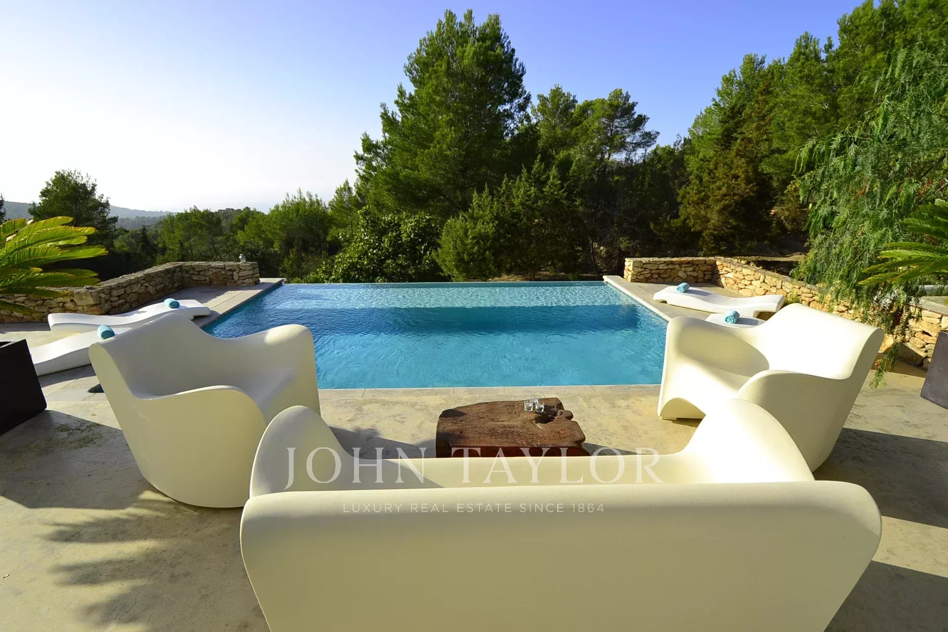 L'esterno è un vero paradiso, dove troverai una spettacolare piscina a sfioro di 10 x 6 metri, perfetta per rinfrescarsi e godersi il sole. L'area poco profonda è ideale per i bambini, e le comode zone relax ti invitano a rilassarti e goderti i magici tramonti ibizentini. L'area pranzo all'aperto, attrezzata con barbecue e un tavolo per dodici, è perfetta per condividere cene indimenticabili all’aperto.