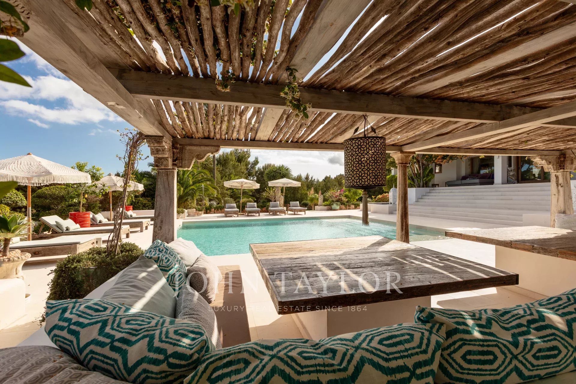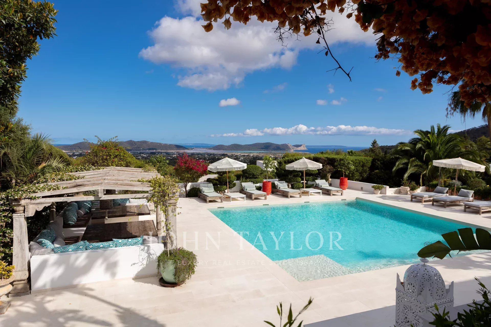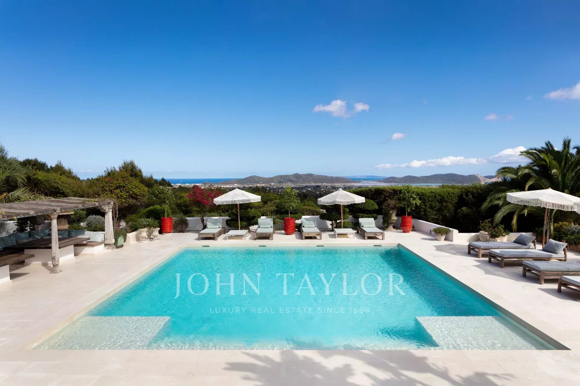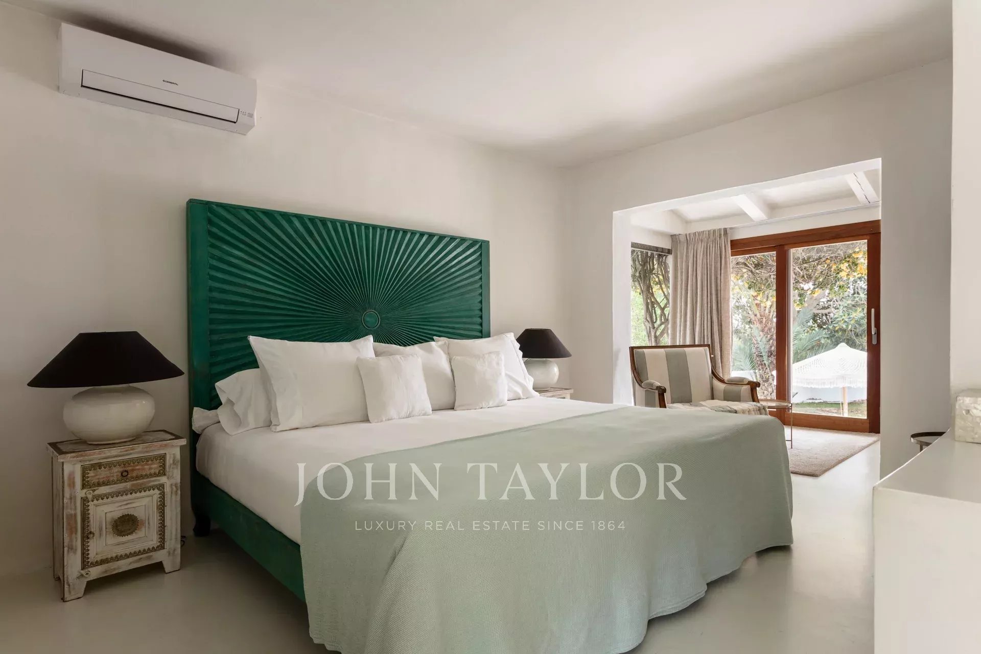 Immersa tra il villaggio di Sant Josep e la città di Ibiza, questa squisita proprietà a Sant Jordi offre una combinazione impareggiabile di lusso, comfort e bellezza naturale spettacolare. Situata tra ampi giardini curati meticolosamente, la proprietà orientata a sud gode di viste panoramiche su verdi campi agricoli, il tranquillo Parco Naturale di Ses Salines e le coste lontane di Formentera.