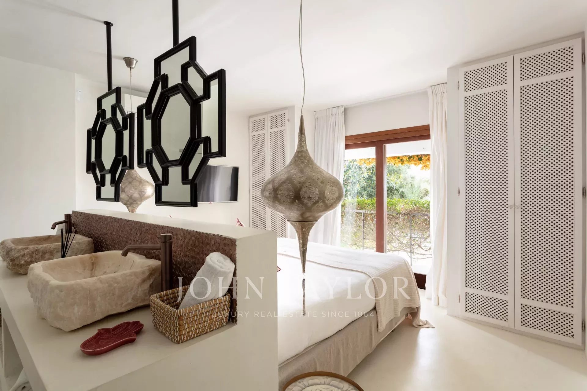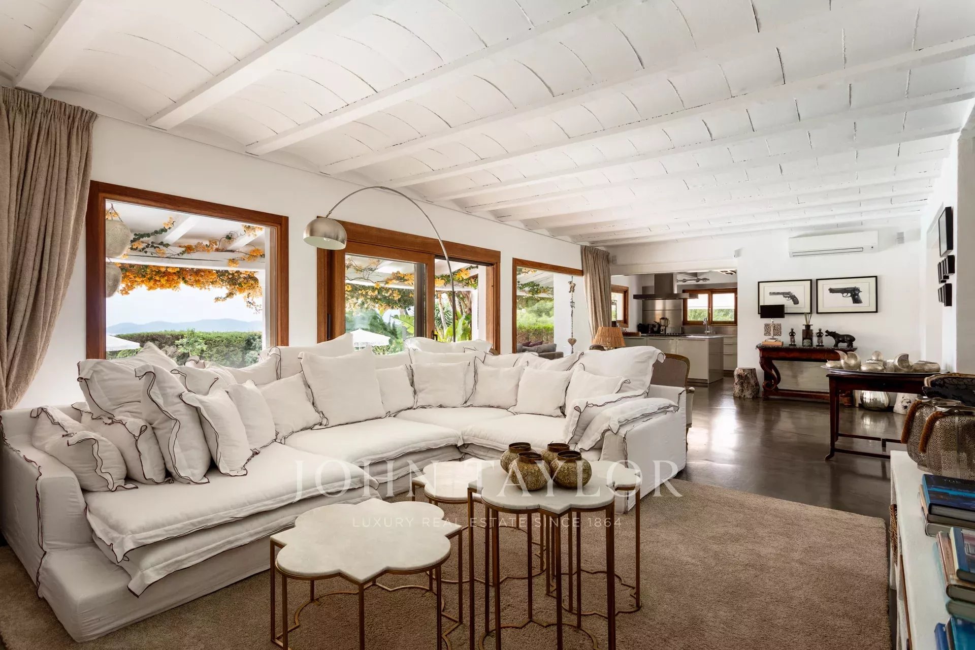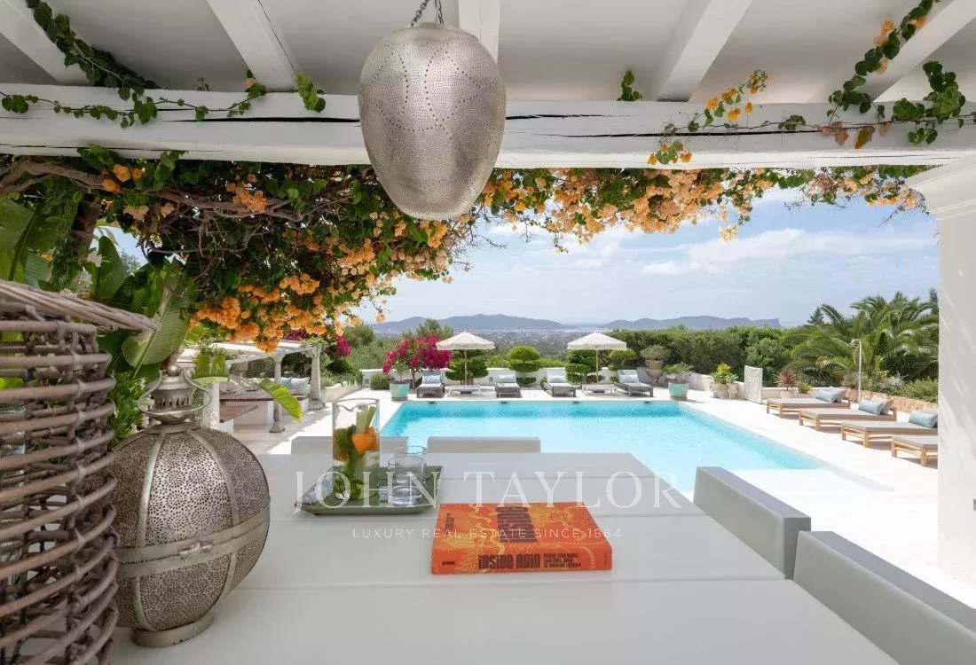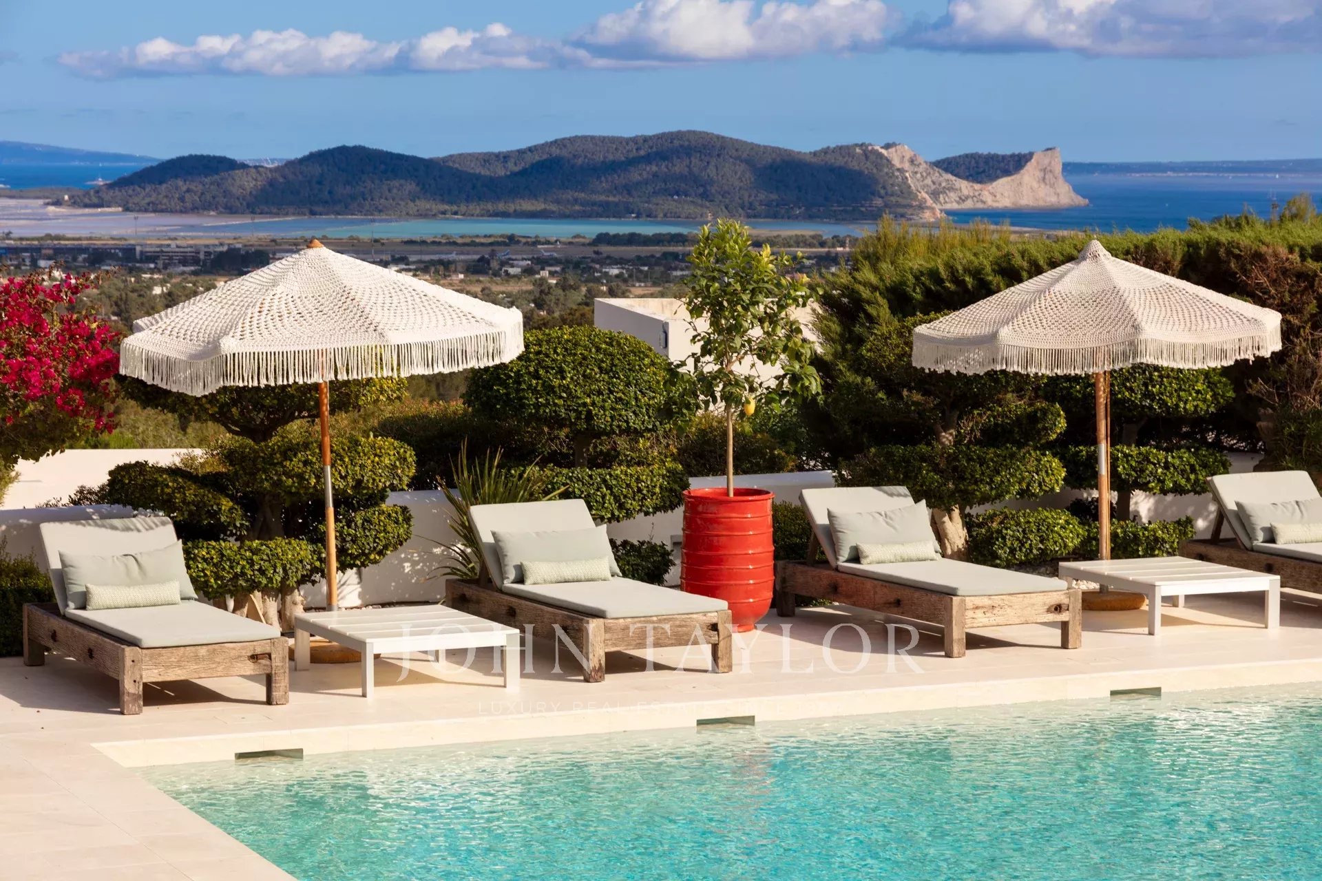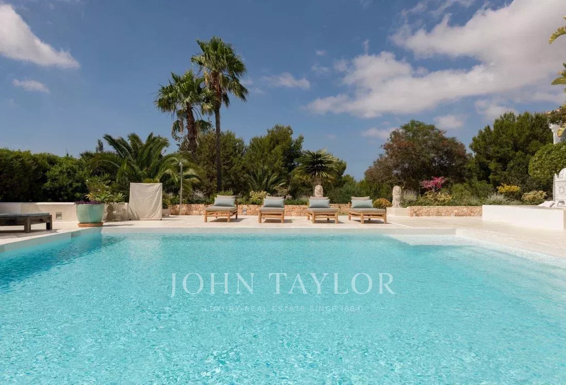 Immersa tra il villaggio di Sant Josep e la città di Ibiza, questa squisita proprietà a Sant Jordi offre una combinazione impareggiabile di lusso, comfort e bellezza naturale spettacolare. Situata tra ampi giardini curati meticolosamente, la proprietà orientata a sud gode di viste panoramiche su verdi campi agricoli, il tranquillo Parco Naturale di Ses Salines e le coste lontane di Formentera.