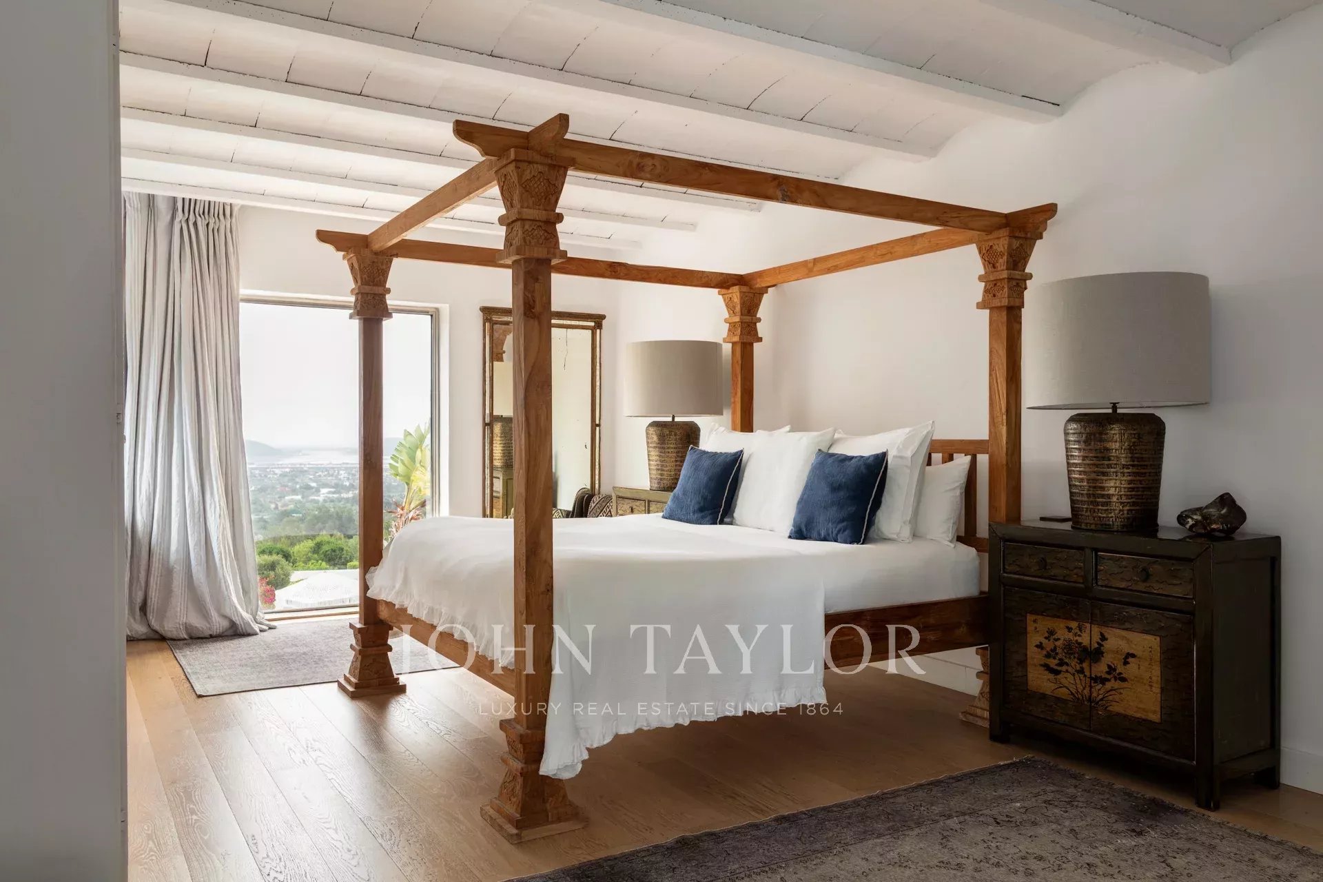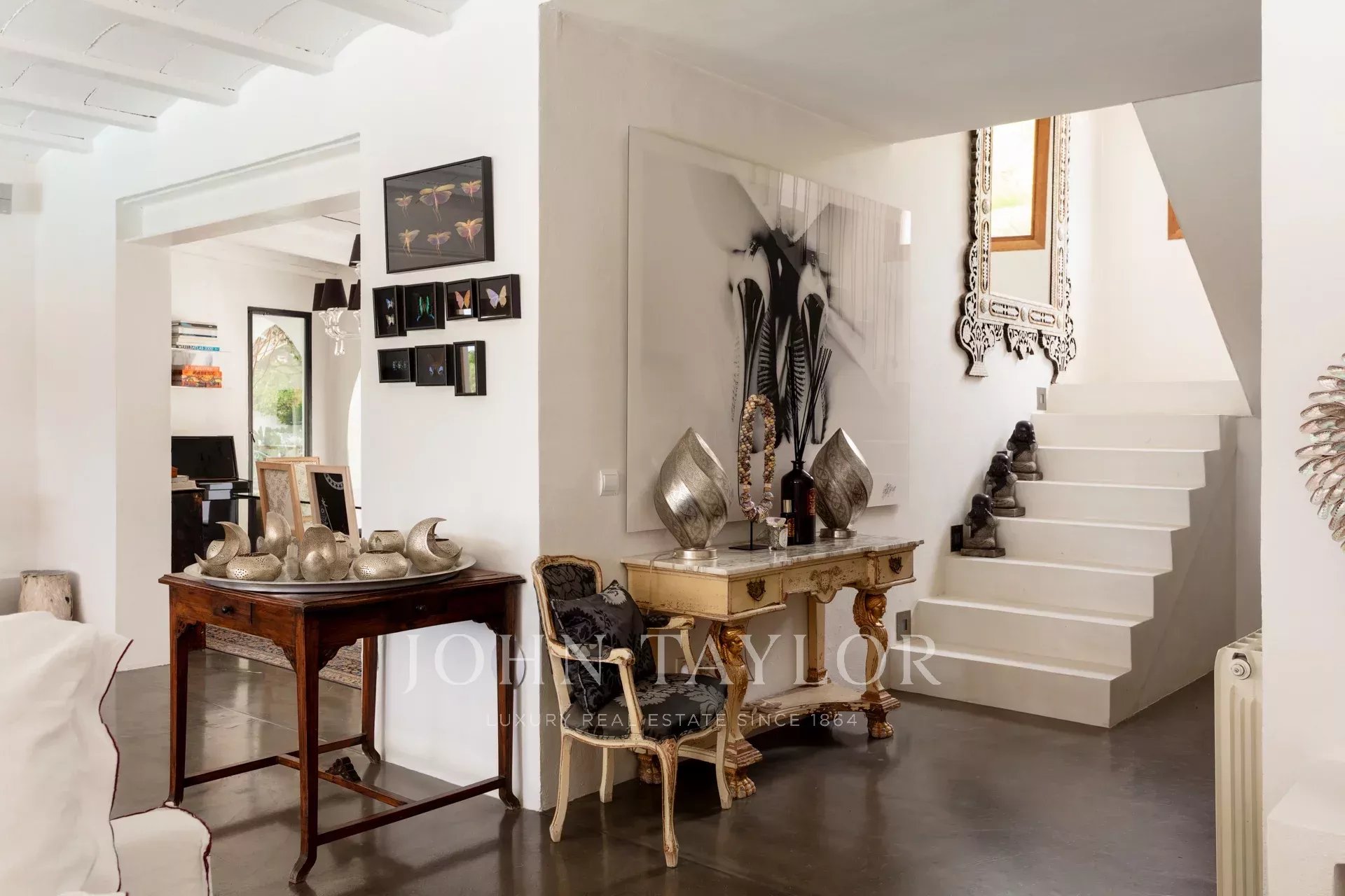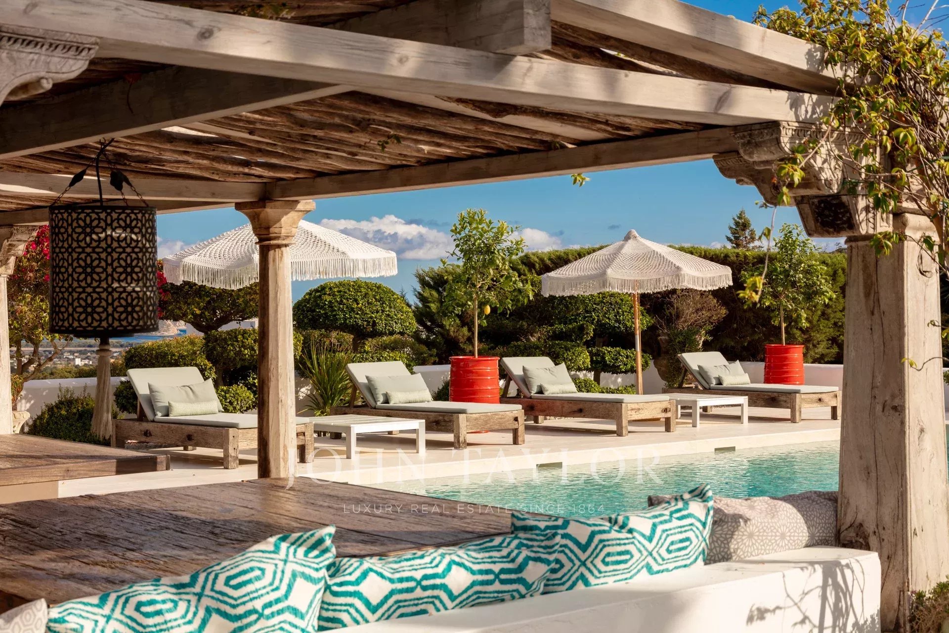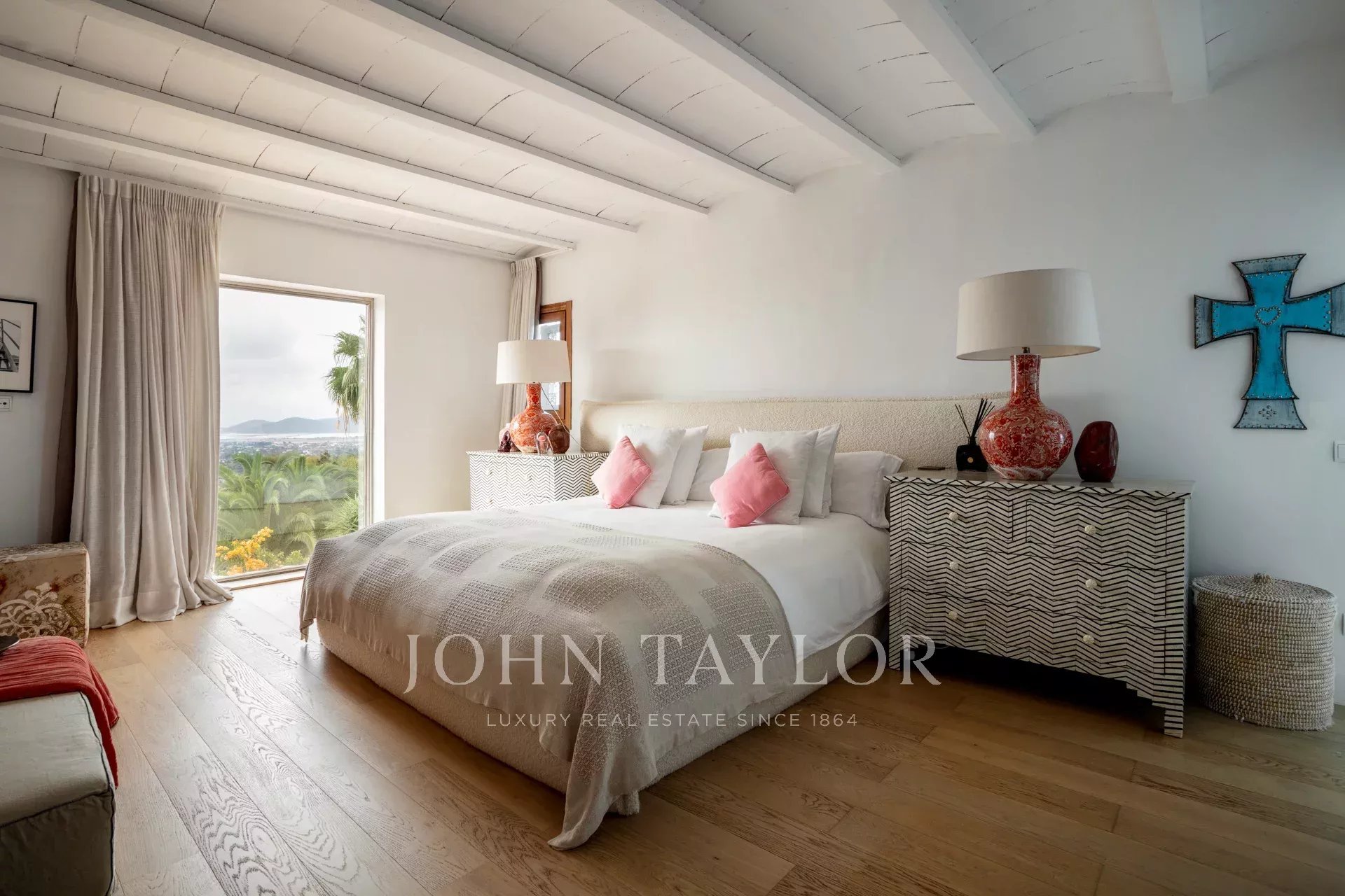 Immersa tra il villaggio di Sant Josep e la città di Ibiza, questa squisita proprietà a Sant Jordi offre una combinazione impareggiabile di lusso, comfort e bellezza naturale spettacolare. Situata tra ampi giardini curati meticolosamente, la proprietà orientata a sud gode di viste panoramiche su verdi campi agricoli, il tranquillo Parco Naturale di Ses Salines e le coste lontane di Formentera.
