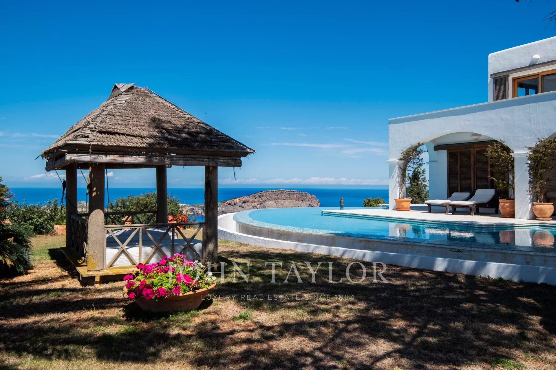 La villa di lusso offre 2 piscine (una a sfioro con vista mozzafiato) e 10 terrazze con un panorama a 360 gradi sul Mediterraneo e sull'isola.