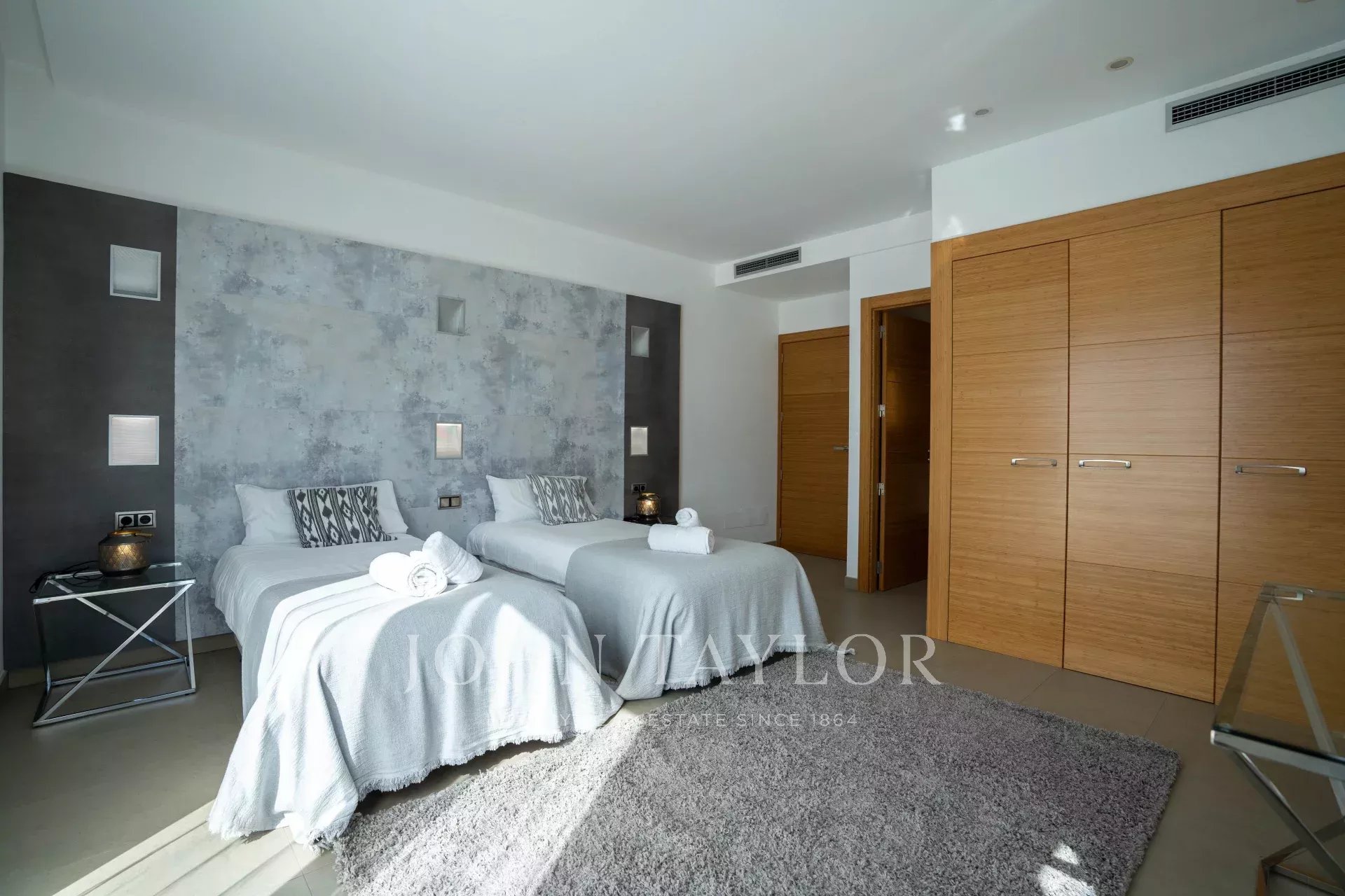 All'interno, la villa può ospitare comodamente fino a 14 persone. L'edificio principale è composto da cinque confortevoli camere da letto, mentre l'appartamento adiacente, con accesso privato, ospita un moderno soggiorno, una cucina completamente attrezzata e due camere da letto con bagno privato. La villa è arredata in modo impeccabile con mobili moderni e un'estetica minimalista di buon gusto, in cui predominano i toni neutri, che creano un ambiente sofisticato.
