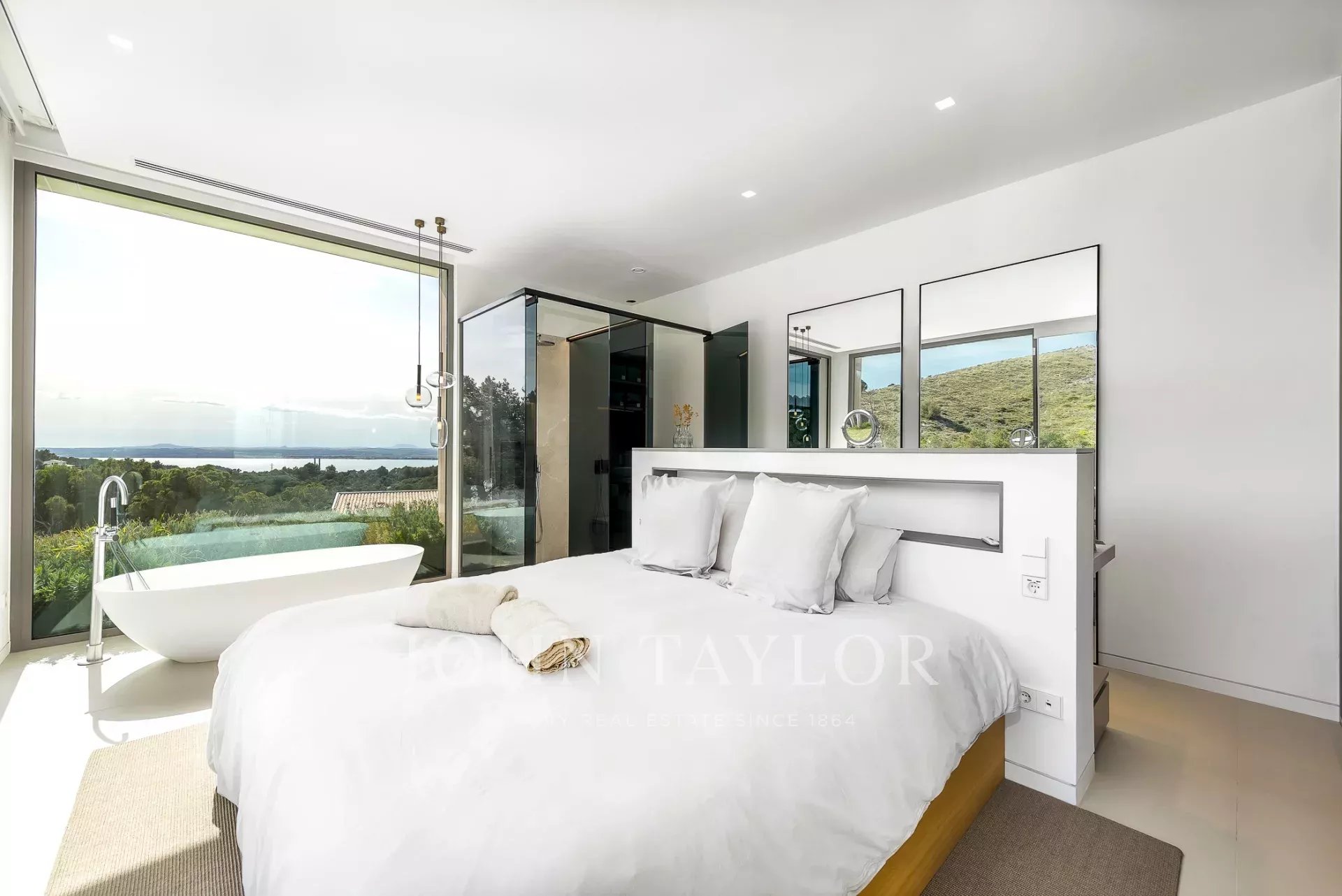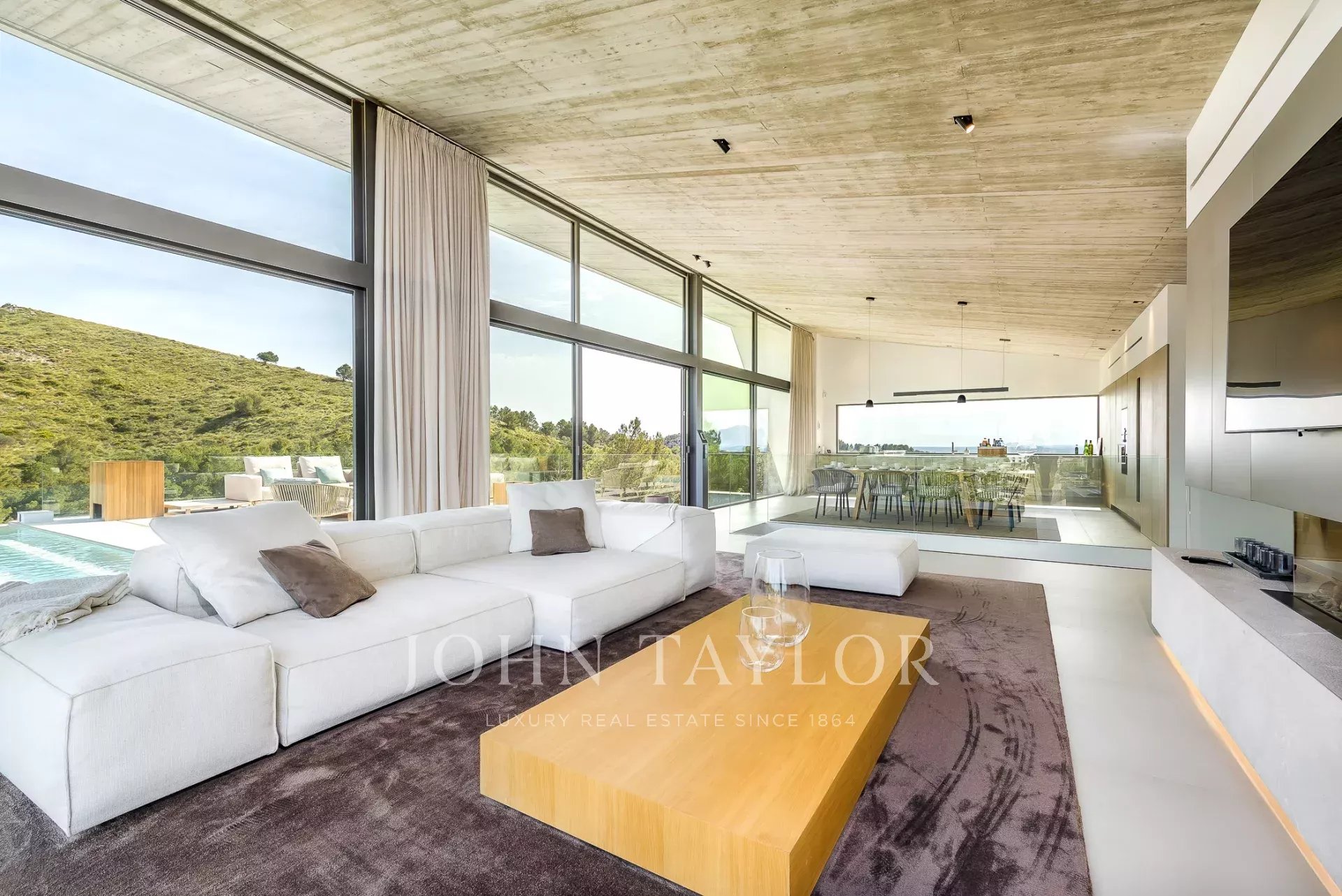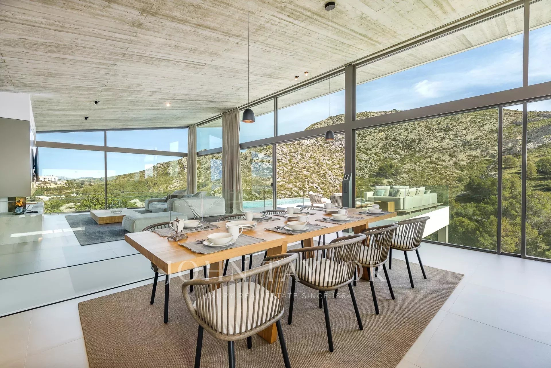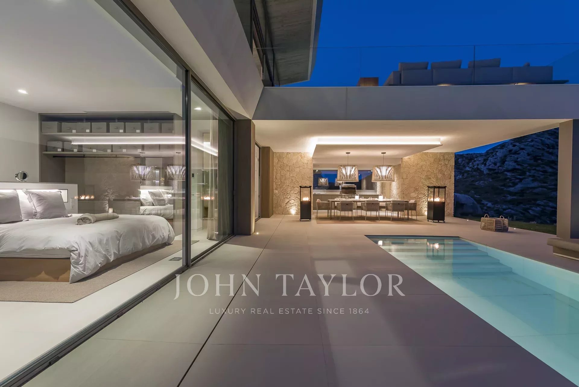 La casa è moderna e arredata con uno standard elevato. I colori e i materiali caldi offrono agli ospiti un'atmosfera speciale. Le 4 camere da letto matrimoniali si trovano al piano terra, mentre all'esterno si ha accesso a un'ampia terrazza con cucina esterna completamente attrezzata e a una delle due piscine. Al piano superiore si trovano la cucina/soggiorno a pianta aperta con finestre panoramiche, l'accogliente zona giorno con camino a gas e un'altra terrazza con piscina idromassaggio.