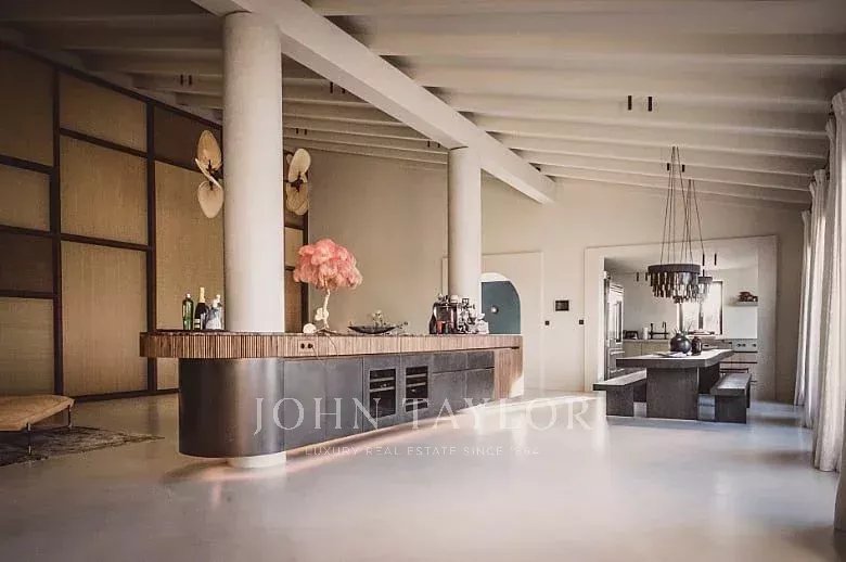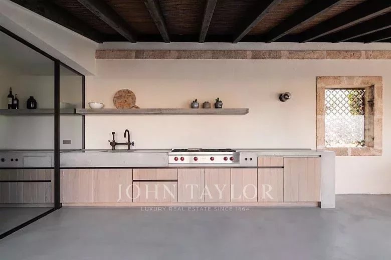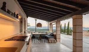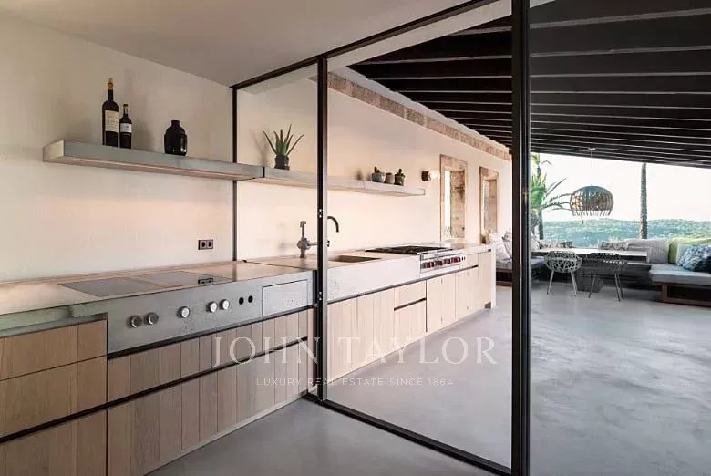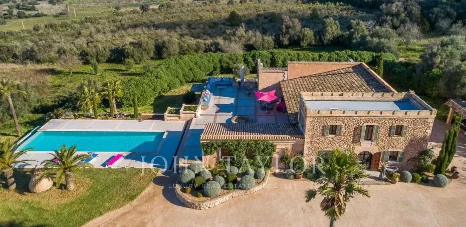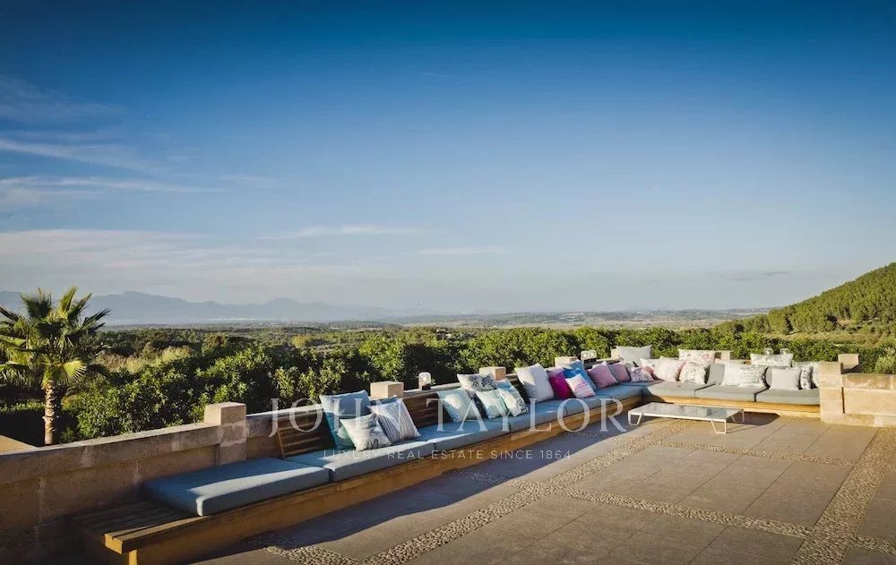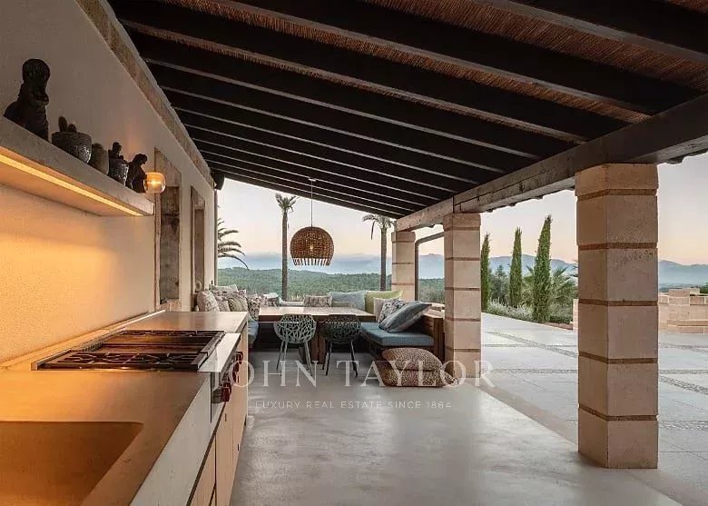 Eccezionale finca di lusso su un terreno di 33.000 m2. La casa offre spazio per un massimo di 10 persone. 4 camere da letto, di cui 3 con bagno en-suite e una con bagno separato, si trovano nella casa principale. Un'altra camera da letto con bagno en-suite si trova nella casa degli ospiti separata e non climatizzata. Gli elementi di una finca tradizionale incontrano materiali di alta qualità e mobili di design. Un punto di forza particolare è l'ampio soggiorno, con pareti eccezionalmente alte e lunghe 5,5 m. Il tavolo da pranzo, un grande bancone da bar e l'illuminazione indiretta creano un ambiente molto particolare. La grande cucina di design all'interno della casa confluisce in una cucina esterna coperta. Anche l'area esterna offre diversi servizi che renderanno il vostro soggiorno un'esperienza davvero speciale. Godetevi una vista panoramica mozzafiato e senza ostacoli sul paesaggio di Maiorca e sull'intera catena montuosa di Tramnuntana. Diverse sezioni della terrazza, coperte e scoperte, con aree relax e mobili da salotto, offrono spazio sufficiente per gustare un bicchiere di vino in completa privacy in mezzo alla natura. La piscina a sfioro di 5 x 16 m è riscaldata e può essere utilizzata tutto l'anno. Vi aspetta anche una grande sauna con una magnifica vista. Per gli amanti del fitness è disponibile anche una sala fitness. L'impianto di osmosi della casa fornisce acqua potabile a tutta la casa.