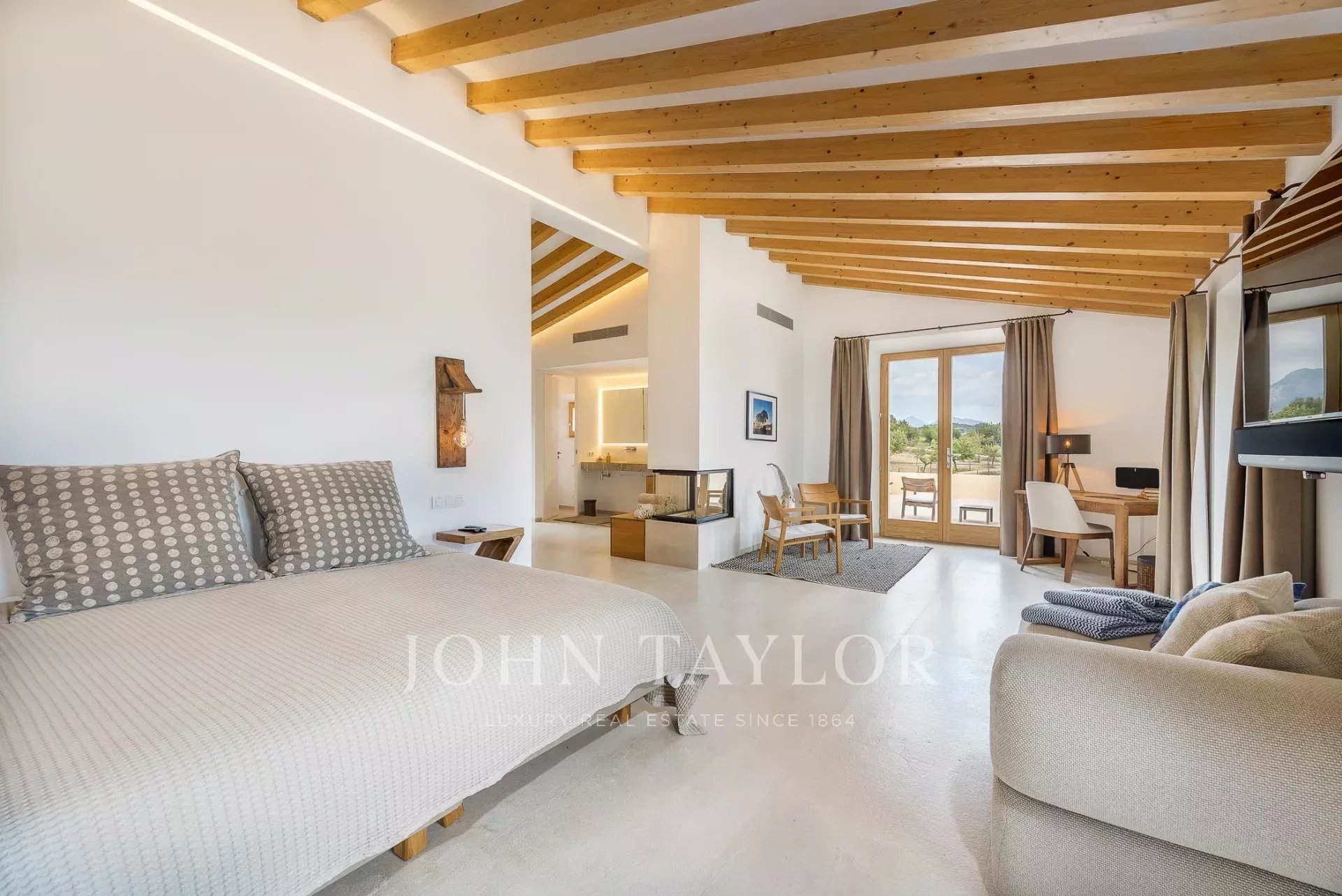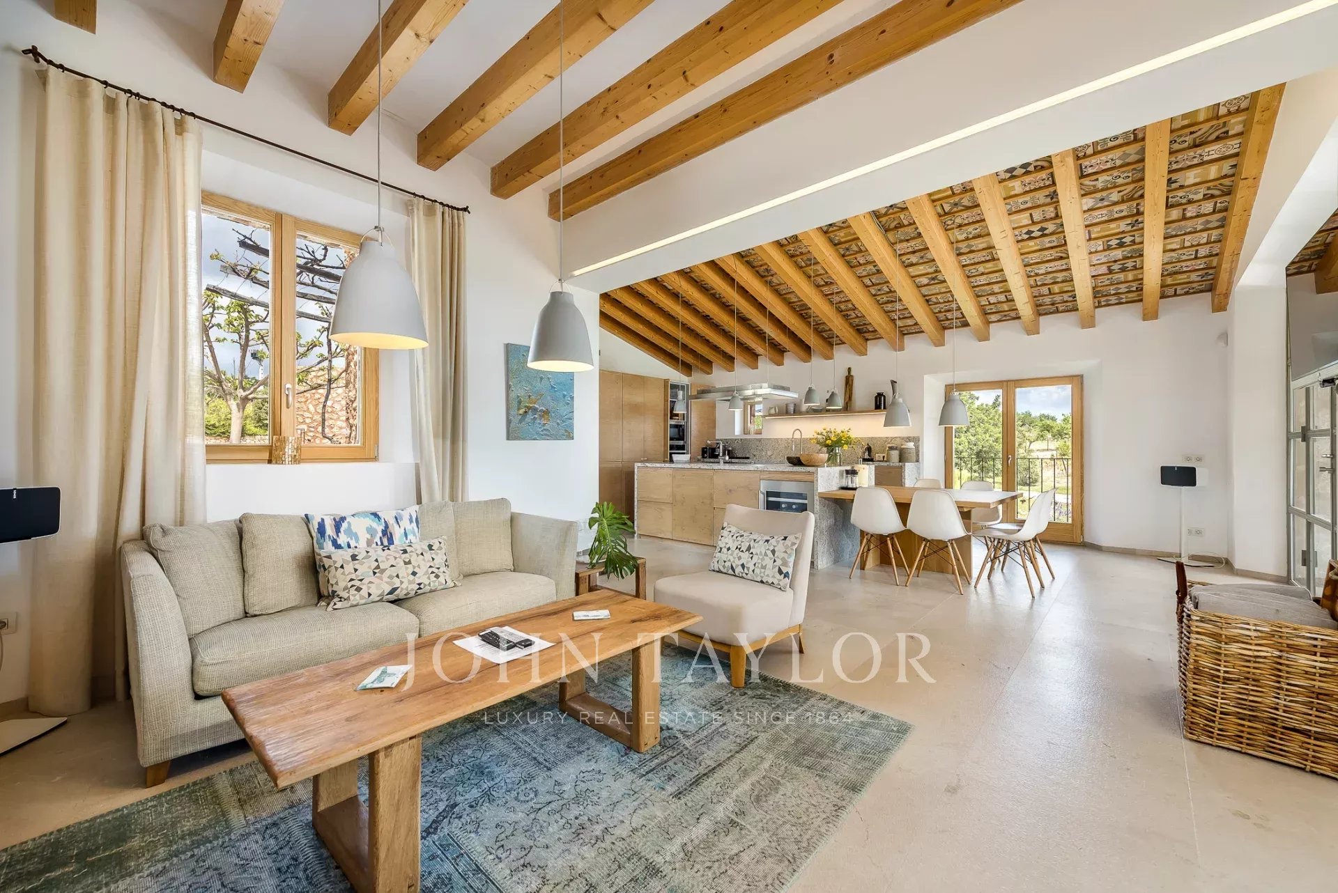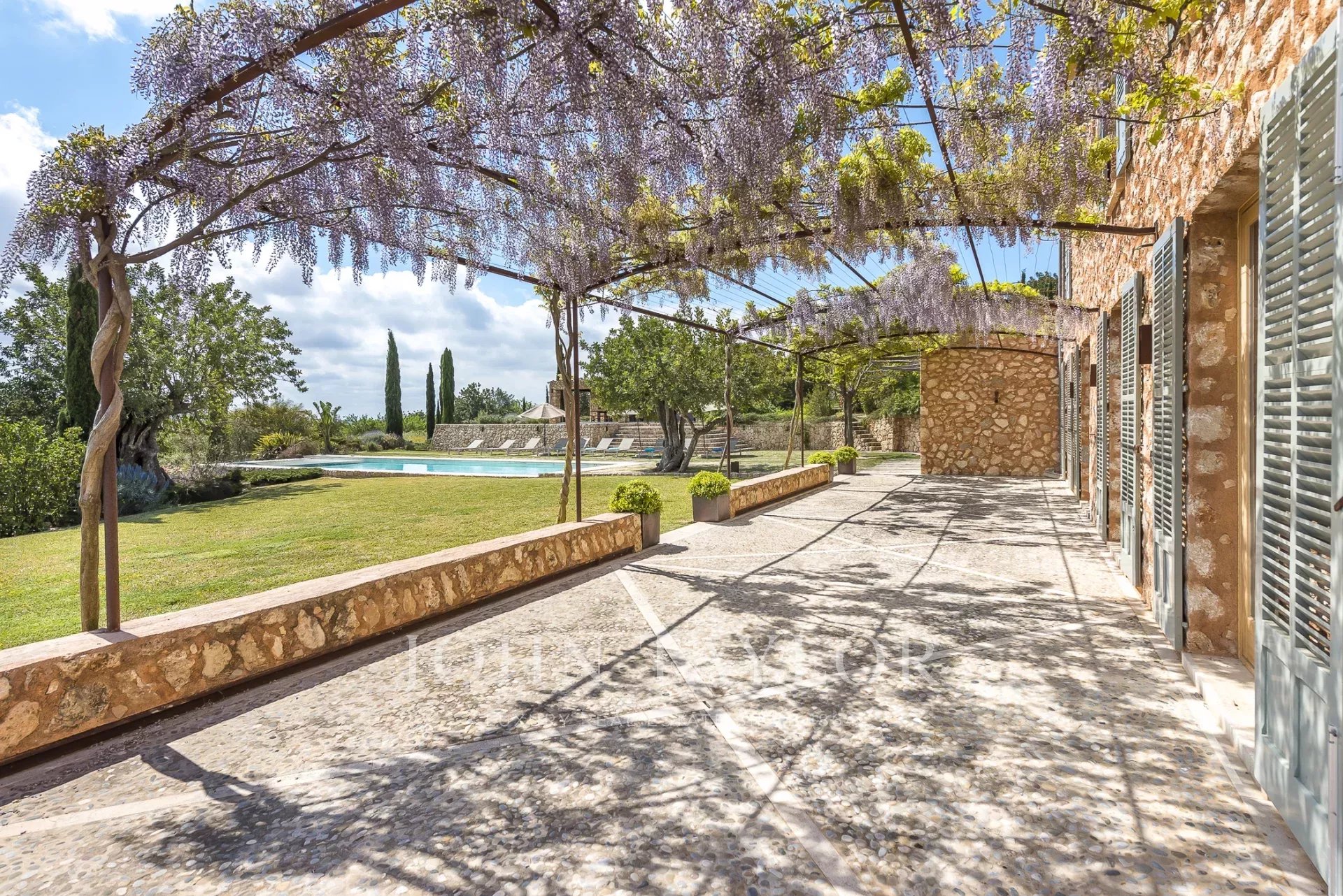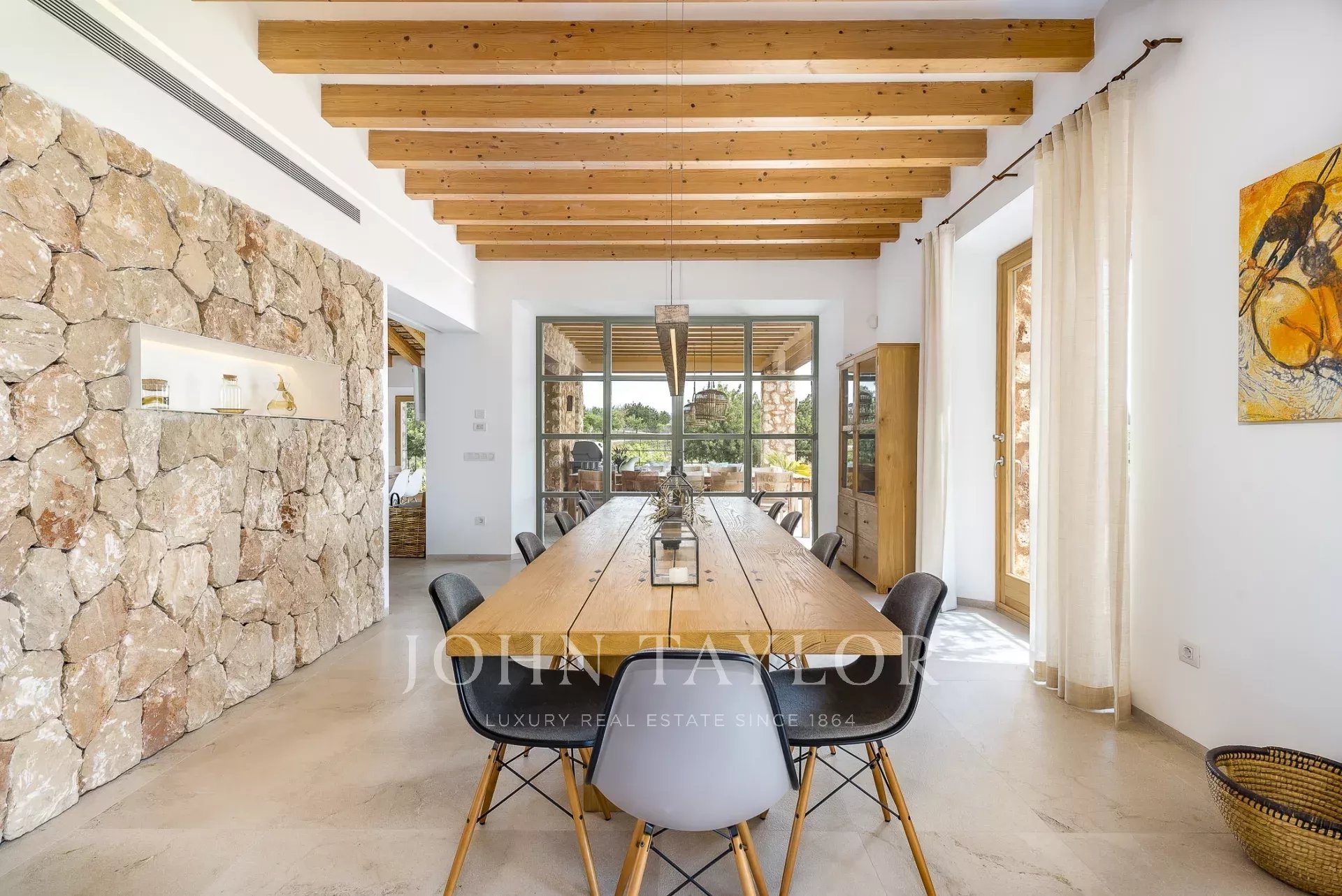 Questa affascinante finca in pietra naturale si trova alla periferia di Santa Maria. Circondata da un giardino mediterraneo e da diverse vigne con vista sullo splendido paesaggio, questa finca affascina per la sua costruzione autentica. Di recente costruzione e ultramoderna senza perdere il carattere tipico e accogliente della finca, si trova su un terreno di circa 4 ettari. Le 4 camere da letto offrono spazio per un massimo di 8 persone e sono distribuite su 3 piani. Le grandi finestre esposte a sud forniscono molta luce e garantiscono una magnifica vista sulla vegetazione tipica del paese con ulivi, mandorli e carrubi. Diverse terrazze coperte e scoperte con zone relax e una grande piscina offrono spazio sufficiente per godere della pace e dell'idillio dei dintorni. La casa è arredata in stile moderno con colori e materiali caldi, che conferiscono un'atmosfera speciale di benessere. La cucina è moderna e completamente attrezzata. Gli ospiti hanno inoltre accesso alla sala fitness della struttura.