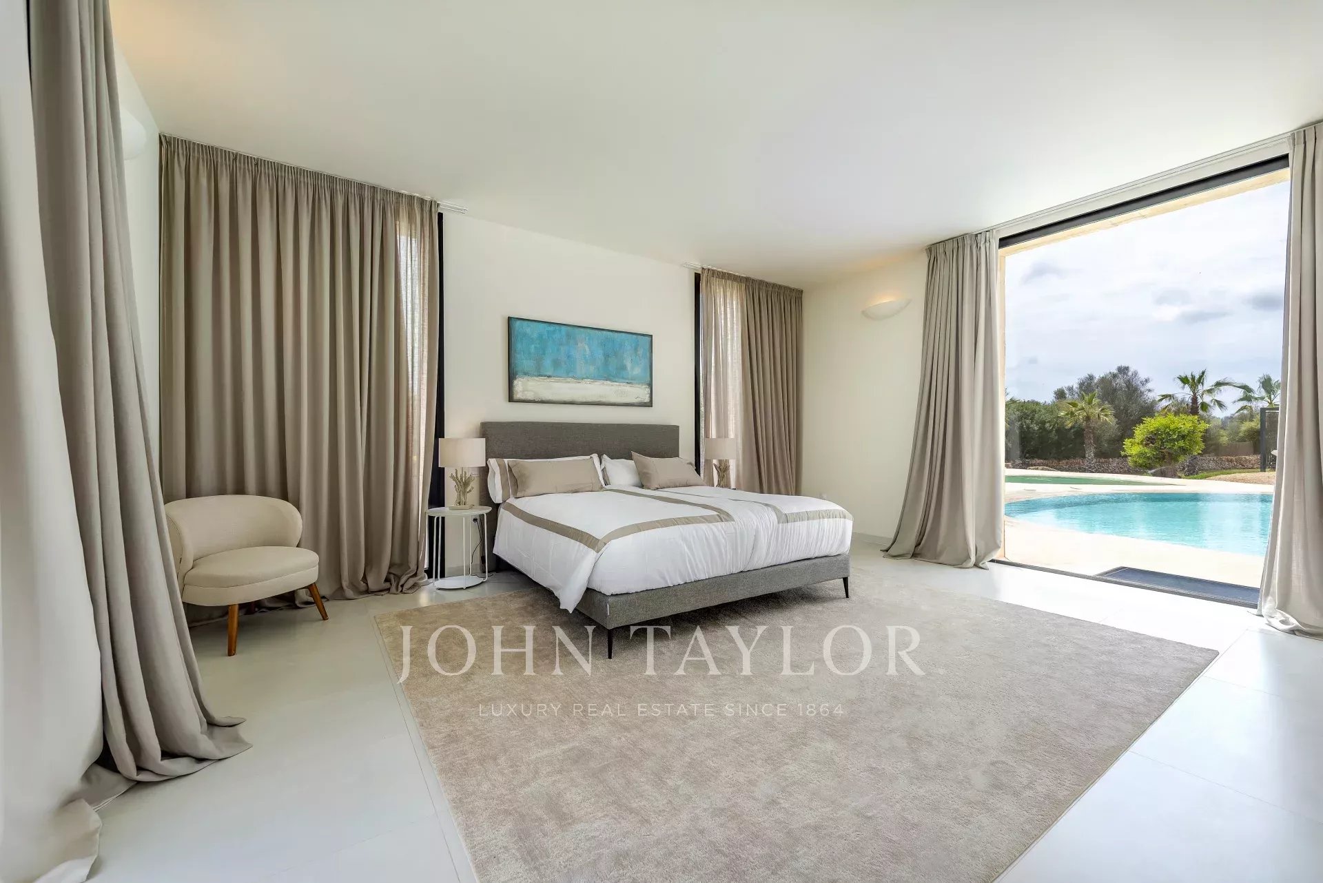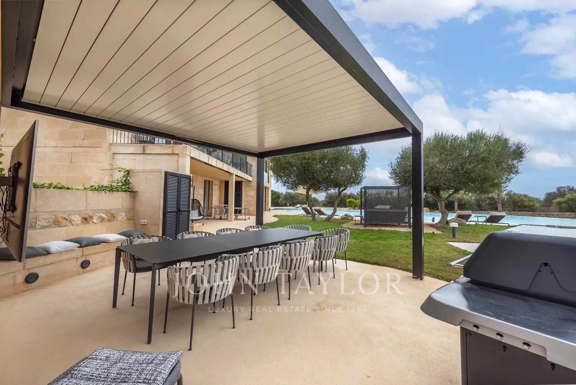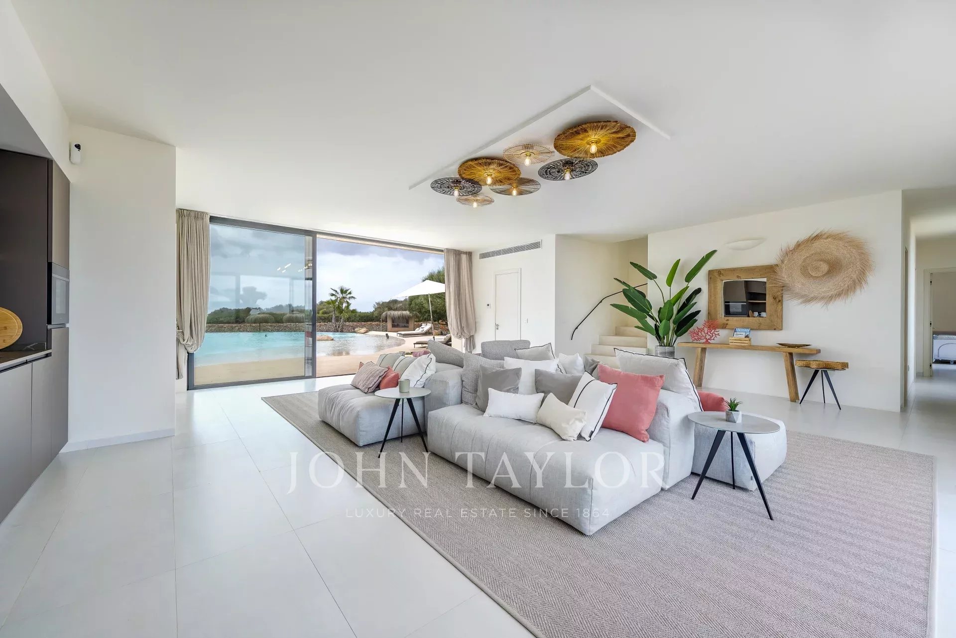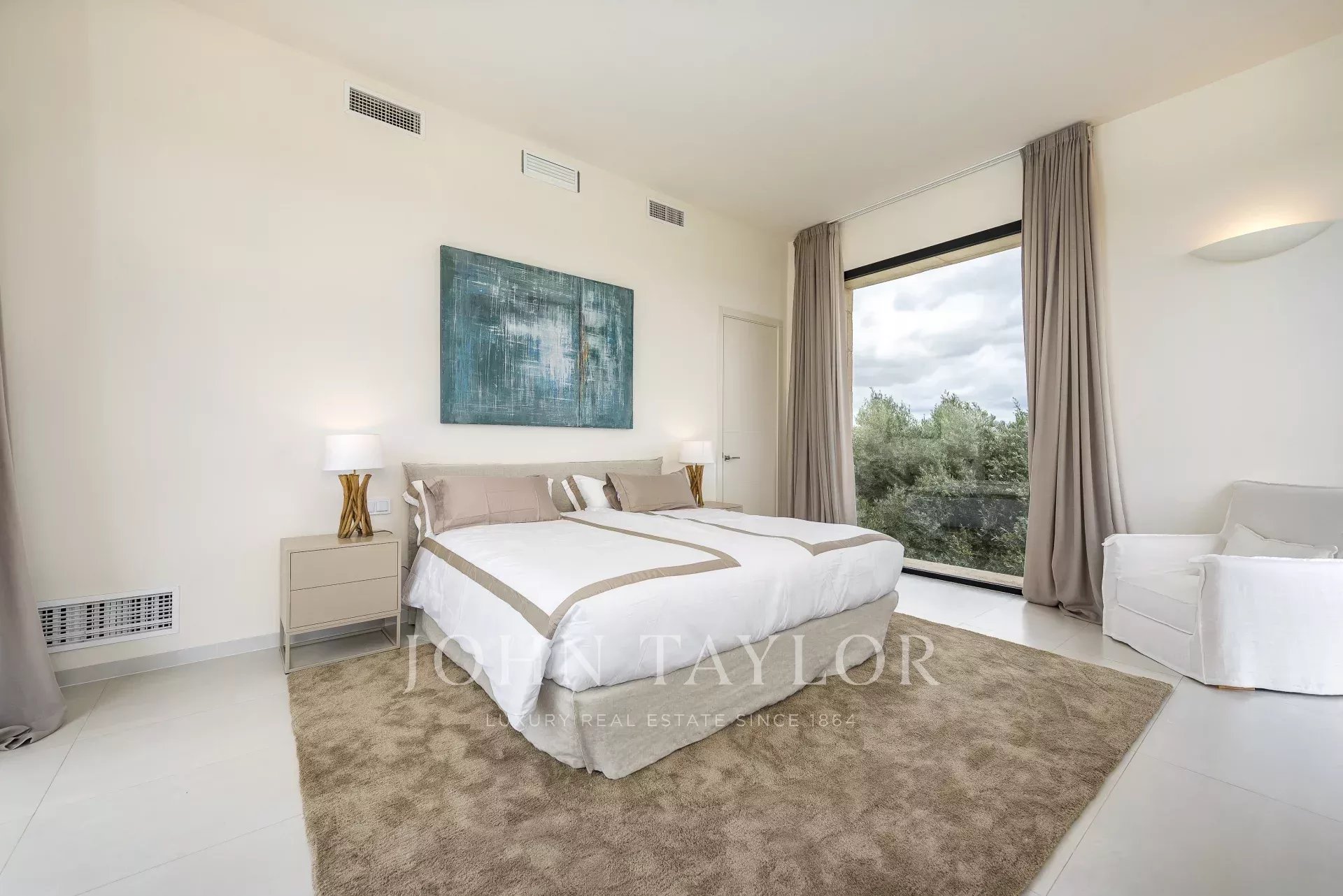 Al piano terra si trova un soggiorno con un'accogliente area lounge e una cucina di design con frigorifero per vini. Una scala in marmo naturale conduce al piano superiore. Qui si trova un'altra spaziosa cucina di design completamente attrezzata con un'isola di cottura, due grandi frigo-congelatori ed elettrodomestici da incasso di alta qualità del marchio di lusso SMEG. Dalla cucina si accede direttamente a una terrazza con una zona pranzo che può ospitare fino a 10 persone. La vista mozzafiato sulla piscina e sulla piccola isola di Cabrera crea un ambiente speciale. La villa dispone anche di 5 camere da letto doppie con bagno privato adiacente, tutte dotate di armadi a muro esclusivi di Poliform, casseforti private e smart TV. Per gli amanti dello sport, nel seminterrato si trova una sala fitness completamente attrezzata con attrezzature per l'allenamento di alta qualità. Su un prato di 5.000 metri quadrati, le possibilità di praticare sport, rilassarsi o divertirsi sono praticamente infinite. Oltre al campo di sabbia di 13 x 25 metri per gli amanti del beach volley, del tennis o del calcio, è possibile giocare a ping-pong e a bocce, meditare nella natura o praticare lo yoga mattutino nel bel mezzo di questa piccola oasi. I bambini hanno a disposizione un parco giochi illuminato con struttura per arrampicata, scivolo e altalena. L'area barbecue è dotata di un doppio frigorifero, una tenda da sole e una TV, oltre a un tavolo da pranzo per dieci persone. Anche gli amanti del benessere troveranno pane per i loro denti: la struttura dispone di una minipiscina riscaldata con sistema controcorrente e di una sauna esterna con doccia.