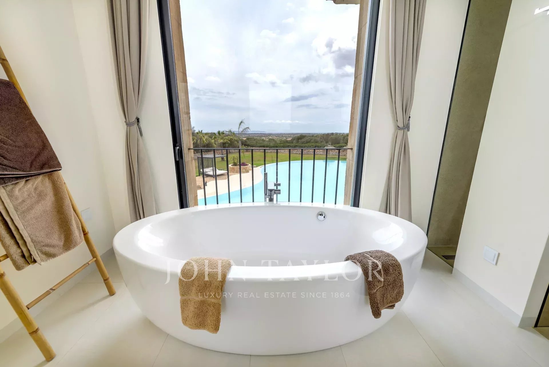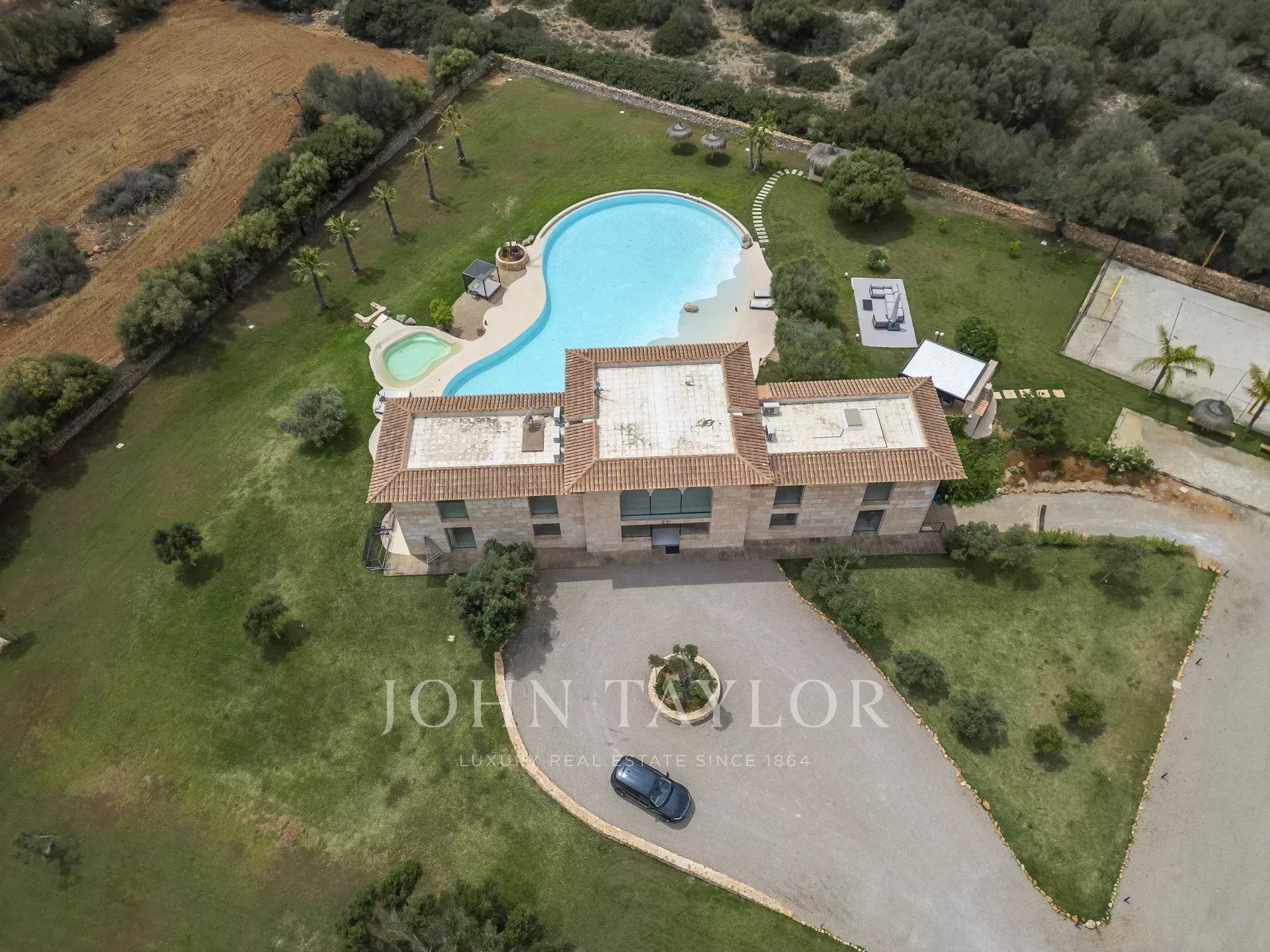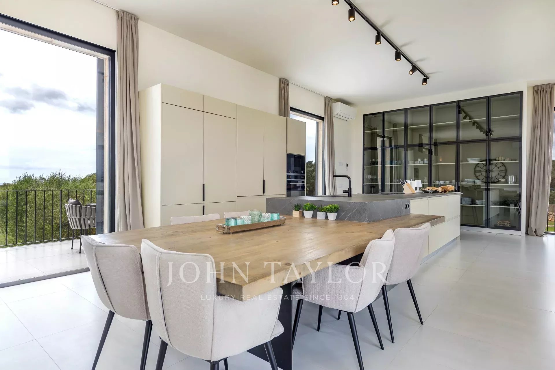 Al piano terra si trova un soggiorno con un'accogliente area lounge e una cucina di design con frigorifero per vini. Una scala in marmo naturale conduce al piano superiore. Qui si trova un'altra spaziosa cucina di design completamente attrezzata con un'isola di cottura, due grandi frigo-congelatori ed elettrodomestici da incasso di alta qualità del marchio di lusso SMEG. Dalla cucina si accede direttamente a una terrazza con una zona pranzo che può ospitare fino a 10 persone. La vista mozzafiato sulla piscina e sulla piccola isola di Cabrera crea un ambiente speciale. La villa dispone anche di 5 camere da letto doppie con bagno privato adiacente, tutte dotate di armadi a muro esclusivi di Poliform, casseforti private e smart TV. Per gli amanti dello sport, nel seminterrato si trova una sala fitness completamente attrezzata con attrezzature per l'allenamento di alta qualità. Su un prato di 5.000 metri quadrati, le possibilità di praticare sport, rilassarsi o divertirsi sono praticamente infinite. Oltre al campo di sabbia di 13 x 25 metri per gli amanti del beach volley, del tennis o del calcio, è possibile giocare a ping-pong e a bocce, meditare nella natura o praticare lo yoga mattutino nel bel mezzo di questa piccola oasi. I bambini hanno a disposizione un parco giochi illuminato con struttura per arrampicata, scivolo e altalena. L'area barbecue è dotata di un doppio frigorifero, una tenda da sole e una TV, oltre a un tavolo da pranzo per dieci persone. Anche gli amanti del benessere troveranno pane per i loro denti: la struttura dispone di una minipiscina riscaldata con sistema controcorrente e di una sauna esterna con doccia.