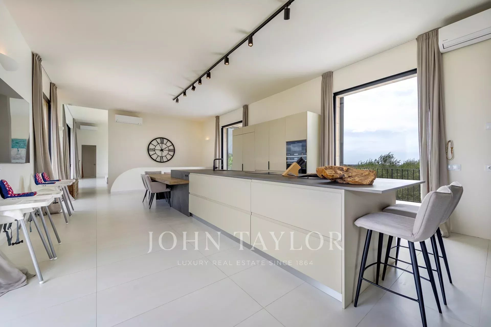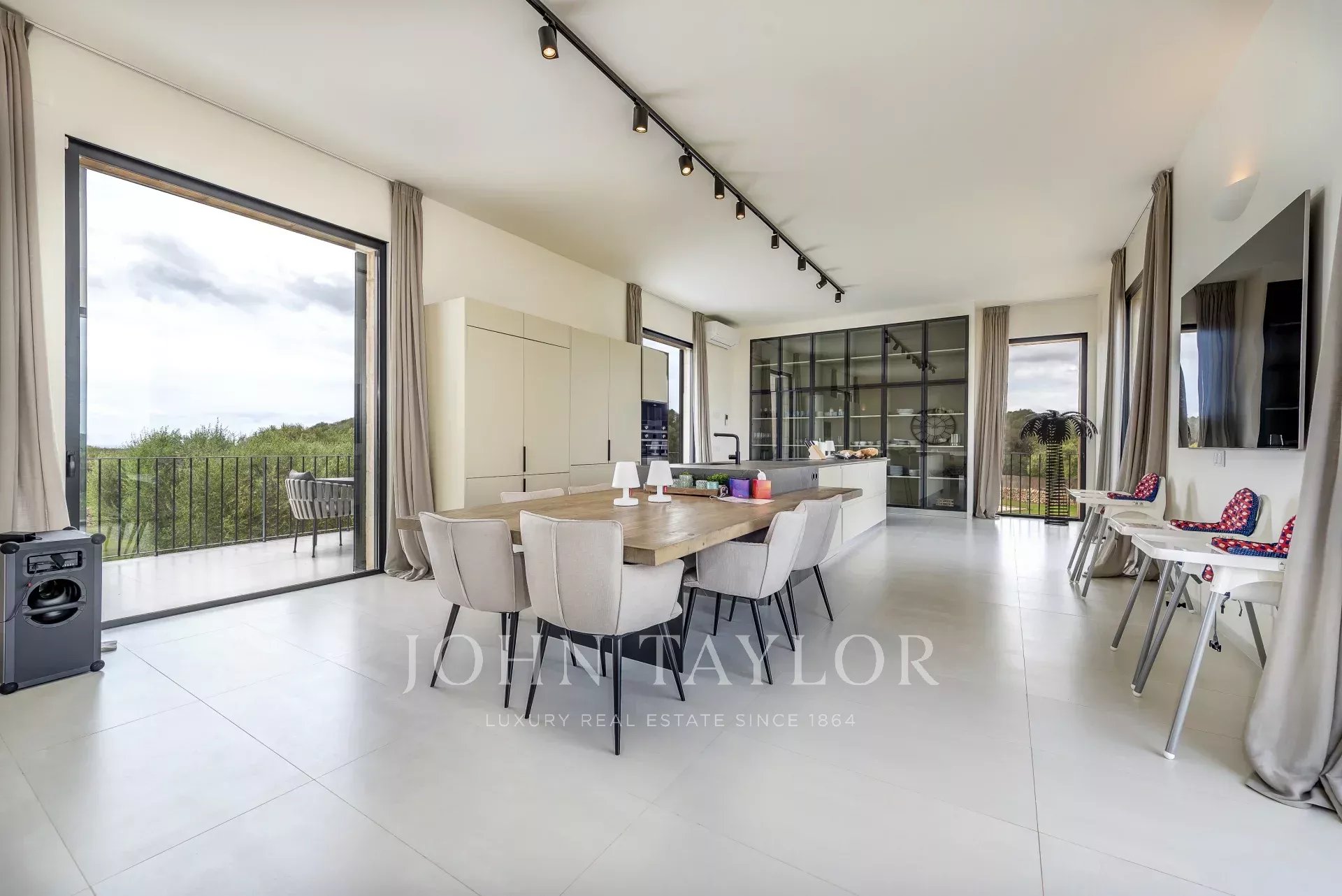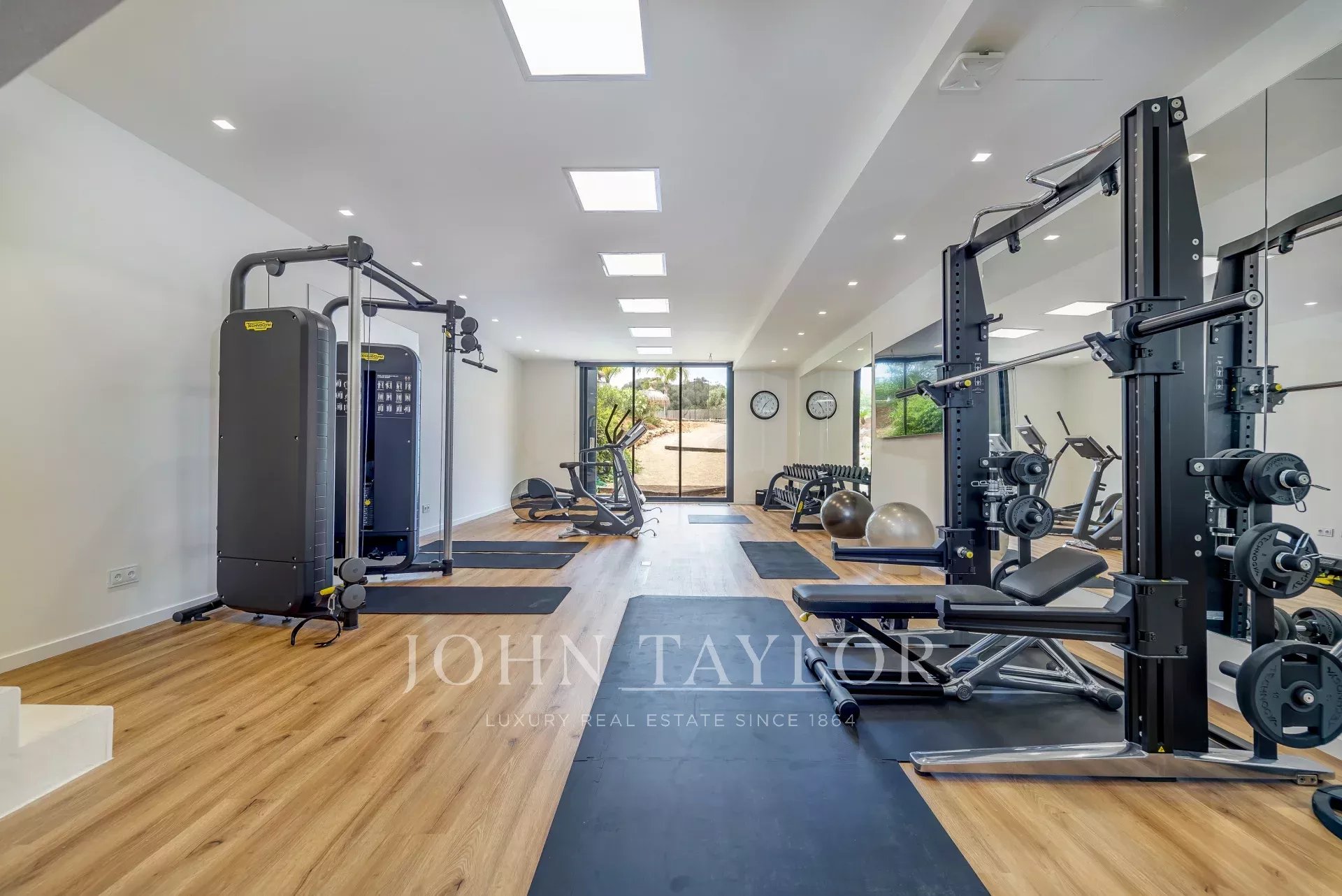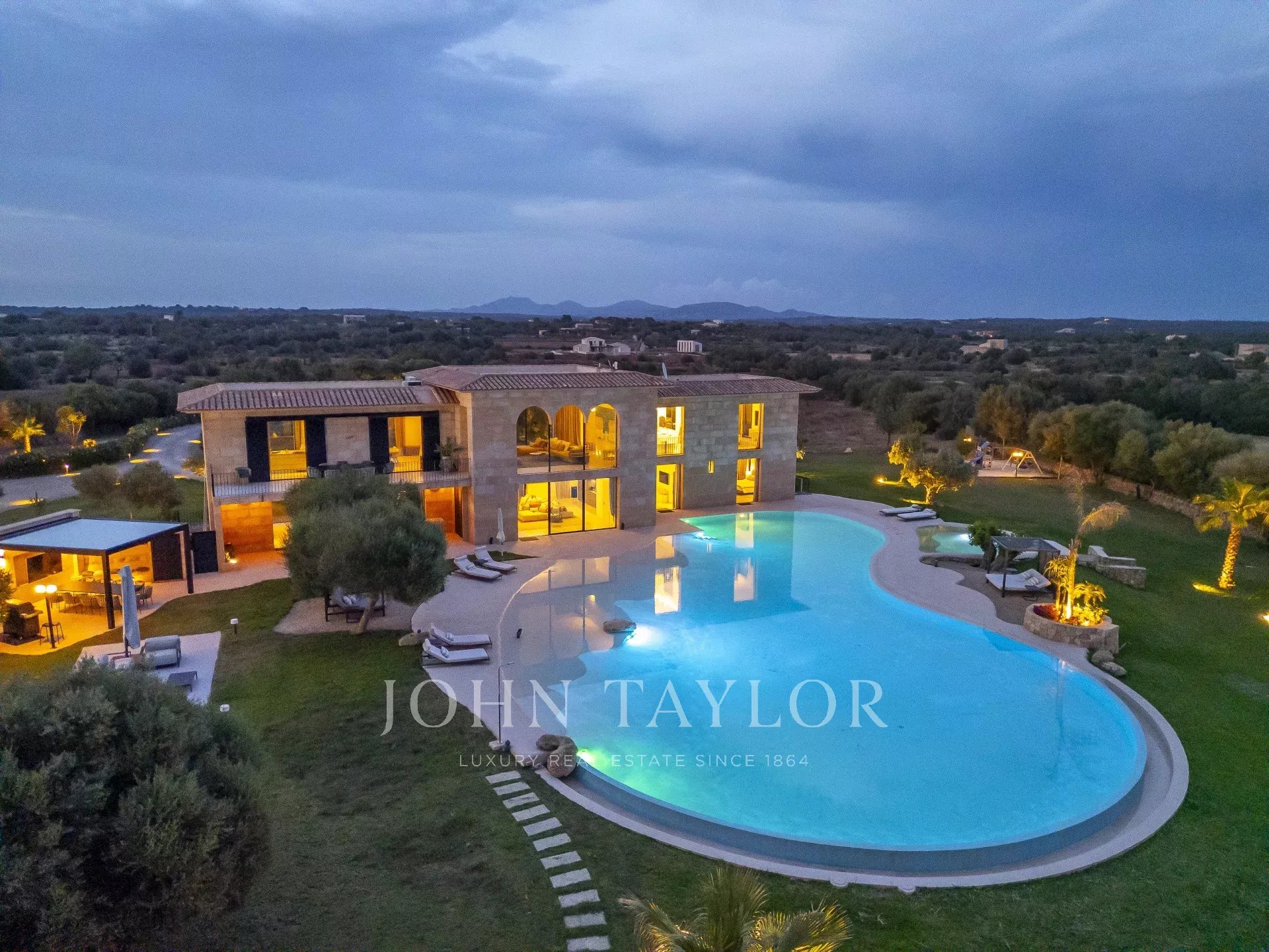 Al piano terra si trova un soggiorno con un'accogliente area lounge e una cucina di design con frigorifero per vini. Una scala in marmo naturale conduce al piano superiore. Qui si trova un'altra spaziosa cucina di design completamente attrezzata con un'isola di cottura, due grandi frigo-congelatori ed elettrodomestici da incasso di alta qualità del marchio di lusso SMEG. Dalla cucina si accede direttamente a una terrazza con una zona pranzo che può ospitare fino a 10 persone. La vista mozzafiato sulla piscina e sulla piccola isola di Cabrera crea un ambiente speciale. La villa dispone anche di 5 camere da letto doppie con bagno privato adiacente, tutte dotate di armadi a muro esclusivi di Poliform, casseforti private e smart TV. Per gli amanti dello sport, nel seminterrato si trova una sala fitness completamente attrezzata con attrezzature per l'allenamento di alta qualità. Su un prato di 5.000 metri quadrati, le possibilità di praticare sport, rilassarsi o divertirsi sono praticamente infinite. Oltre al campo di sabbia di 13 x 25 metri per gli amanti del beach volley, del tennis o del calcio, è possibile giocare a ping-pong e a bocce, meditare nella natura o praticare lo yoga mattutino nel bel mezzo di questa piccola oasi. I bambini hanno a disposizione un parco giochi illuminato con struttura per arrampicata, scivolo e altalena. L'area barbecue è dotata di un doppio frigorifero, una tenda da sole e una TV, oltre a un tavolo da pranzo per dieci persone. Anche gli amanti del benessere troveranno pane per i loro denti: la struttura dispone di una minipiscina riscaldata con sistema controcorrente e di una sauna esterna con doccia.