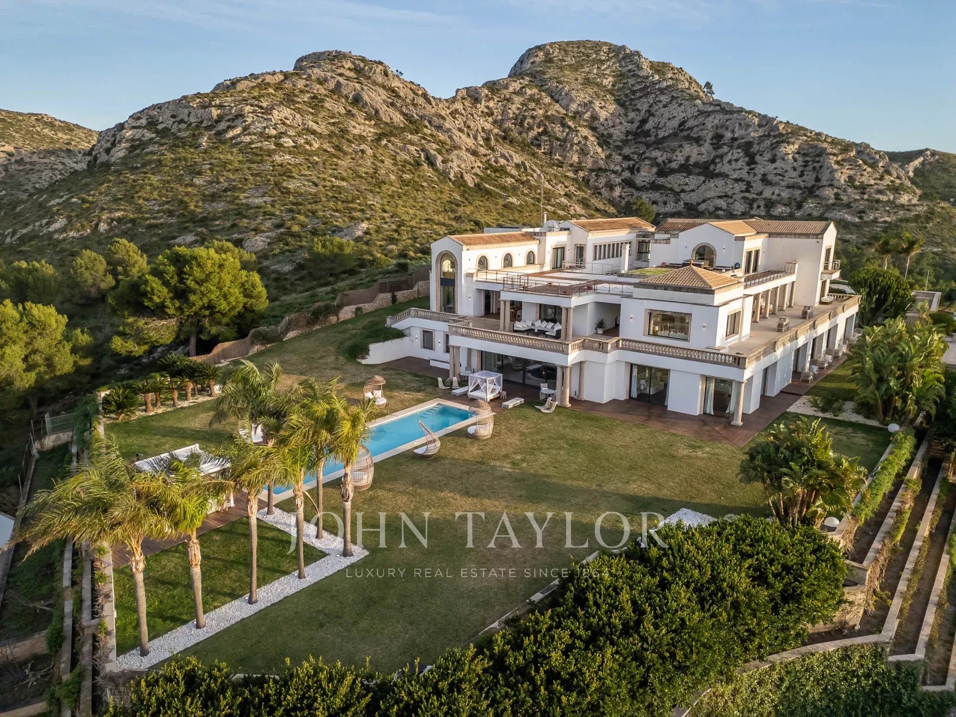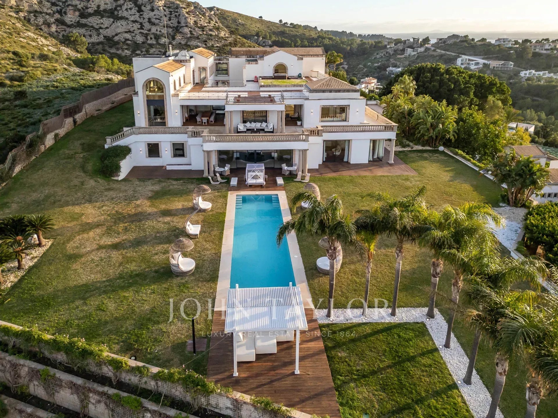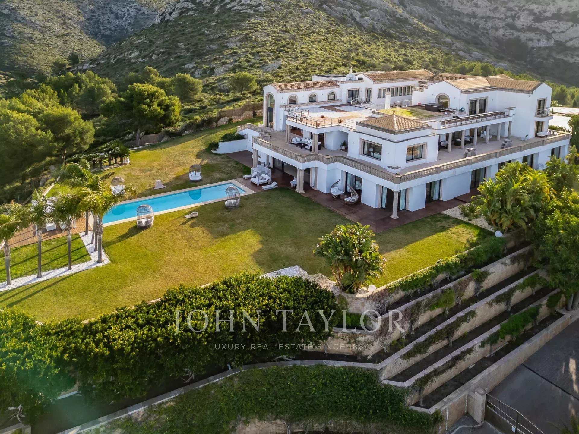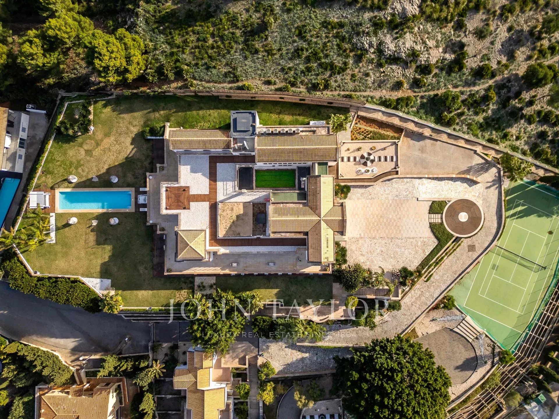 L'esterno della proprietà offre una serie di aree diverse per pranzi e cene all'aperto, per soddisfare gruppi grandi e piccoli, piscina, giardini curati e maturi, campo da tennis, la "serra" e l'eliporto per l'accesso aereo diretto alla proprietà.