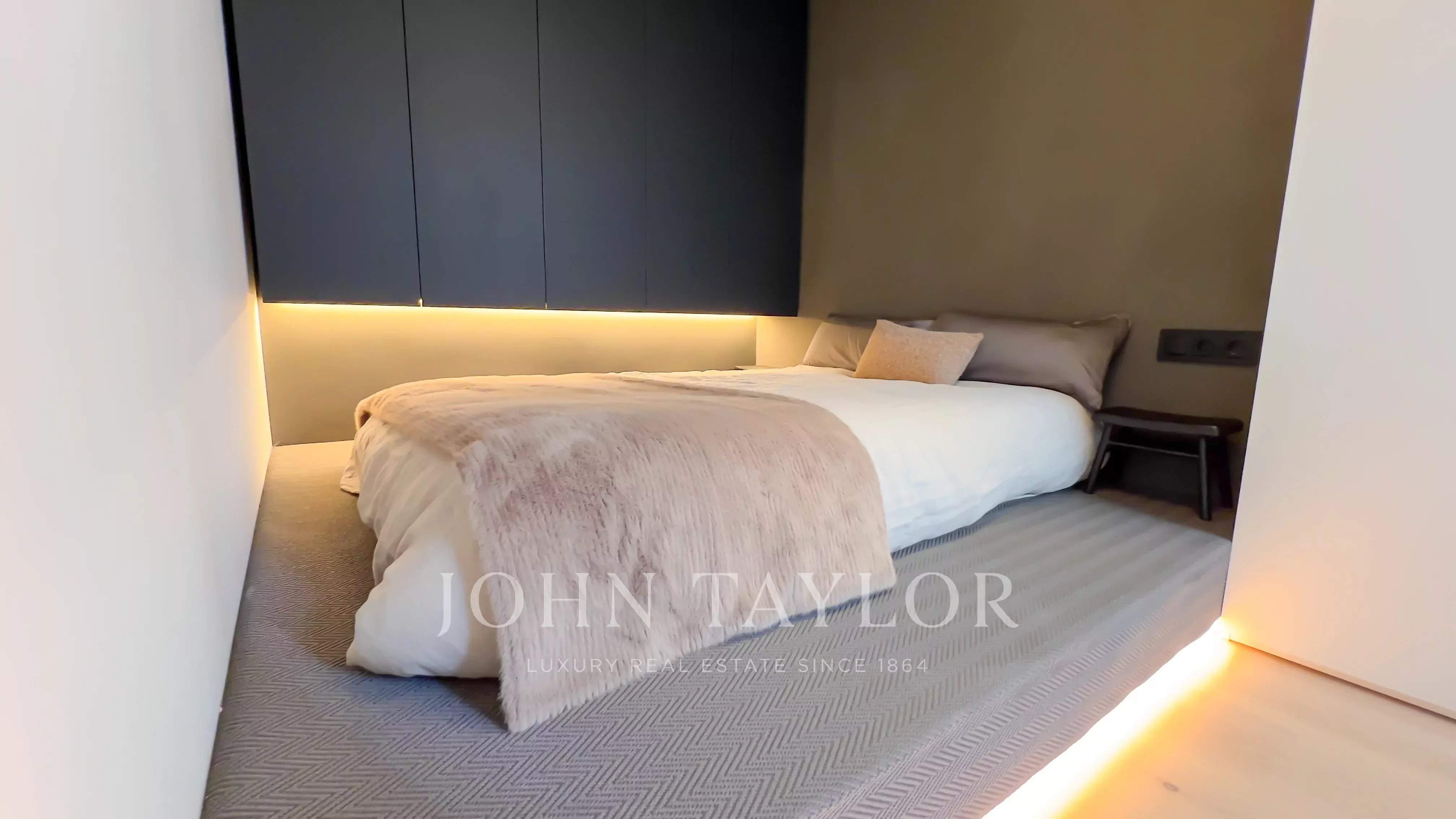 La camera da letto invita al riposo in un ambiente sereno e raffinato, completato da un bagno in stile contemporaneo che riflette eleganza e comfort.