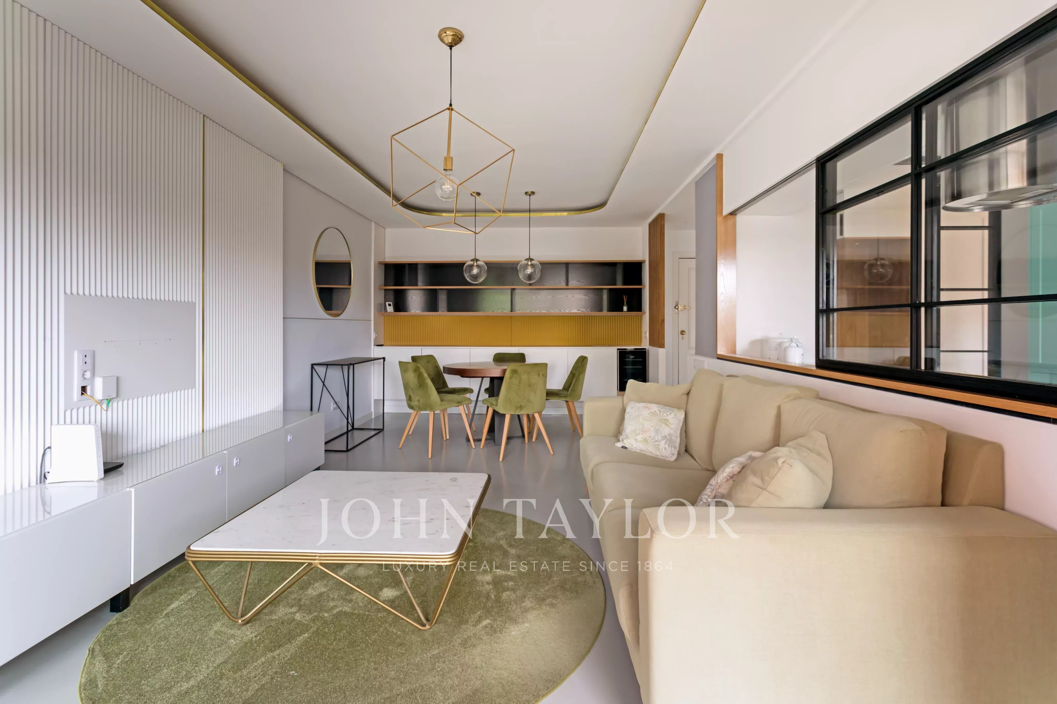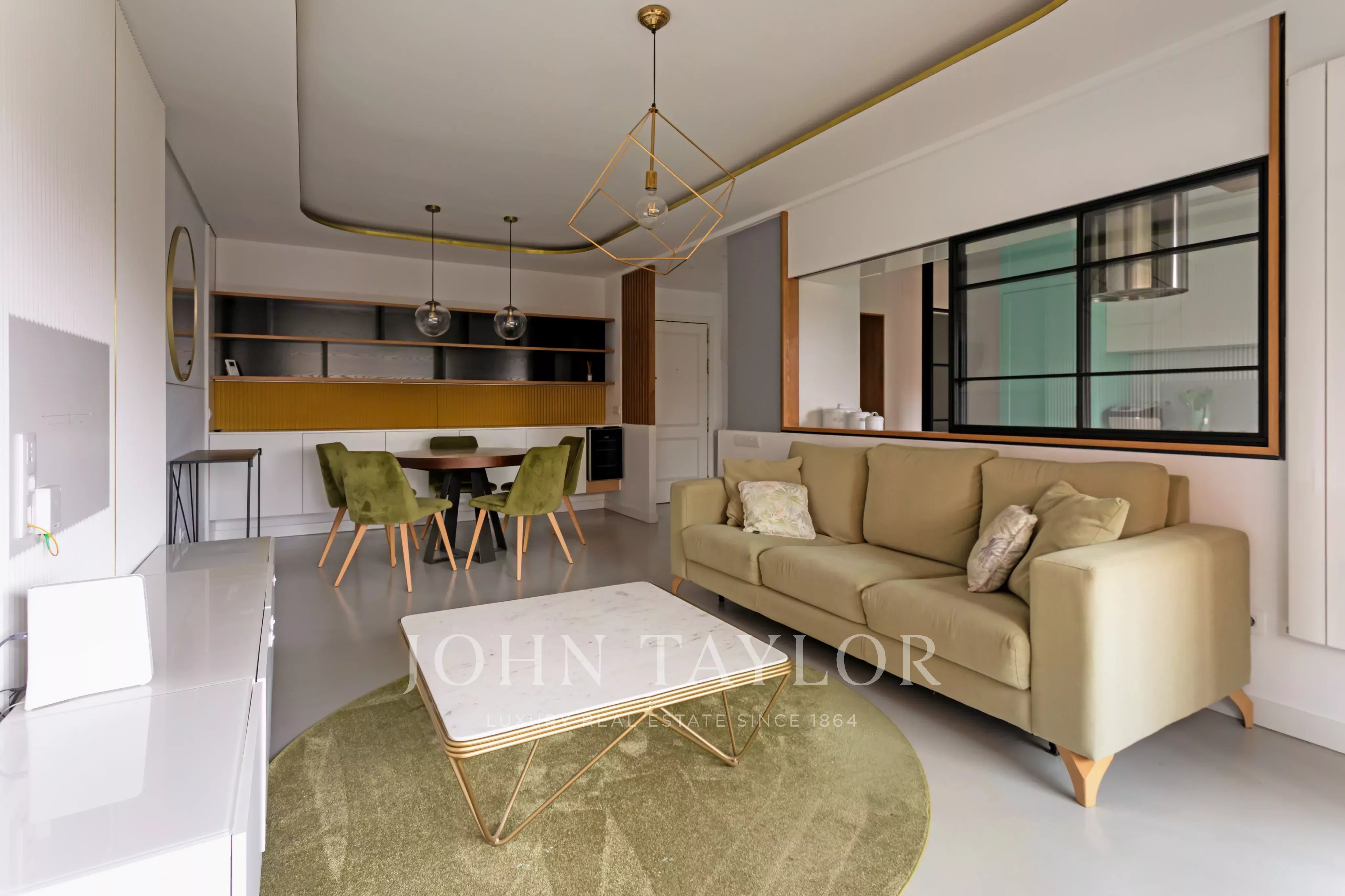 L'ampio e luminoso soggiorno-sala da pranzo ha accesso diretto a una terrazza esposta a est, ideale per godere della luce naturale al mattino.