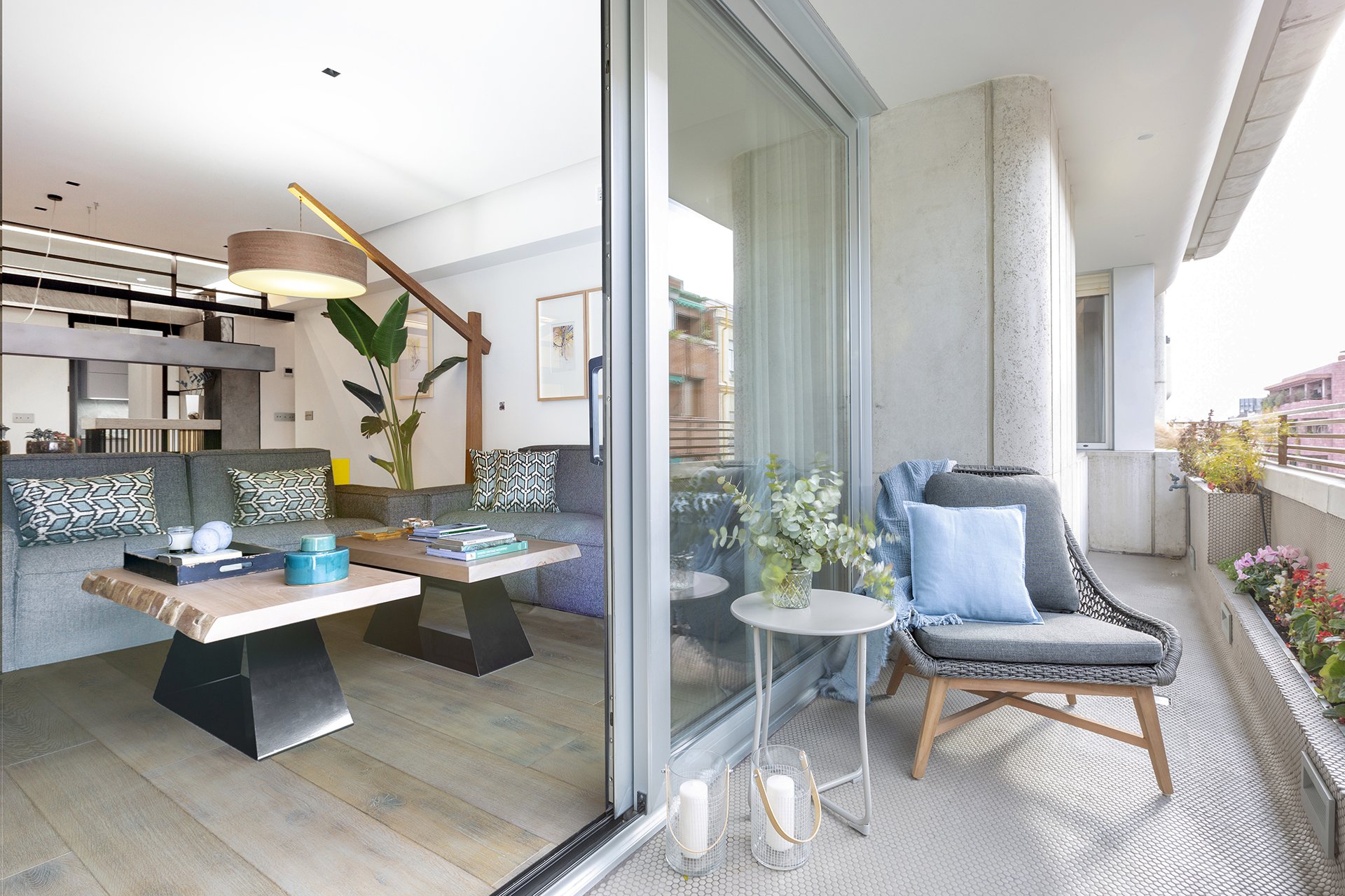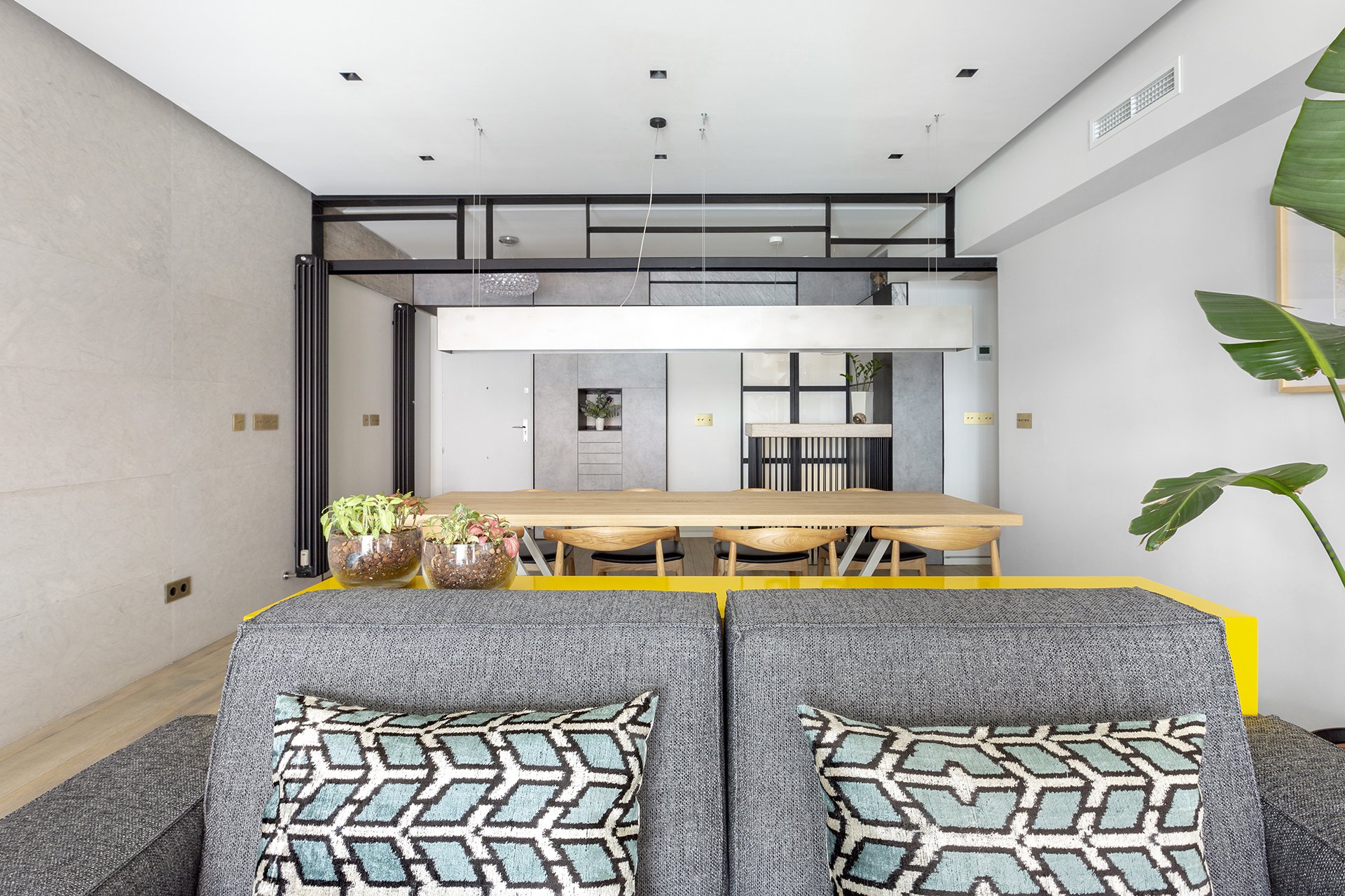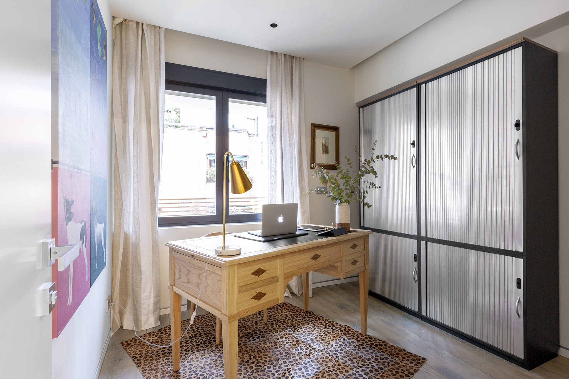 Accanto alla cucina, completamente attrezzata con elettrodomestici di alta qualità, abbiamo una camera di servizio con il proprio bagno e ingresso indipendente. Il soggiorno/pranzo, di grandi dimensioni, può essere separato tramite delle pareti scorrevoli in metallo con lamiera microperforata e ha anche accesso alla terrazza a ovest tramite una grande finestra.
