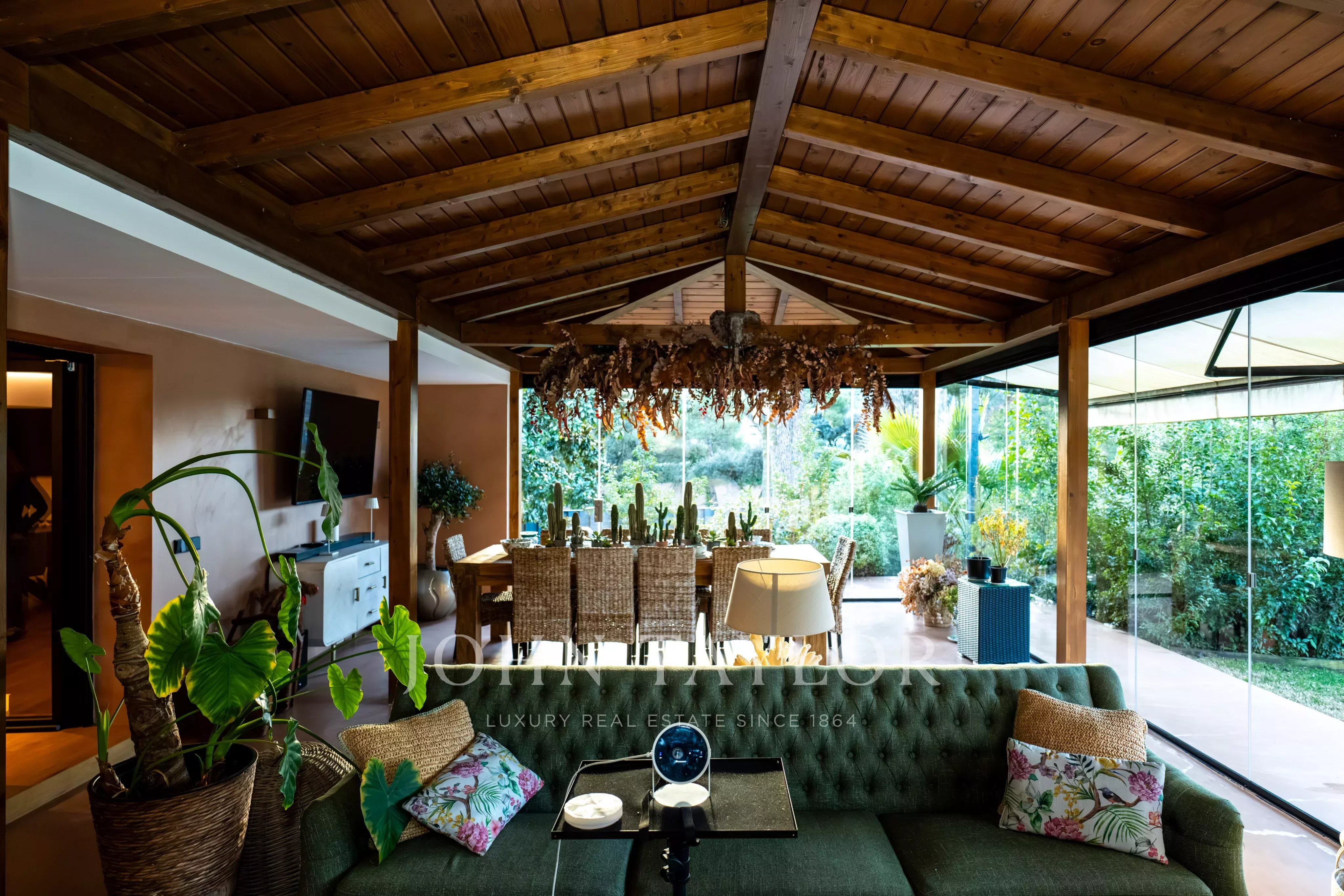 La villa si sviluppa su due livelli e si distingue per le sue generose dimensioni, soffitti alti, abbondante luce naturale e una distribuzione funzionale degli ambienti. La zona giorno comprende un ampio soggiorno con camino e accesso diretto al giardino. La cucina, completamente attrezzata, è spaziosa e perfetta sia per la vita quotidiana sia per ricevere ospiti, ed è completata da una grande area chiusa e climatizzata, ideale per incontri e eventi durante tutto l’anno.
