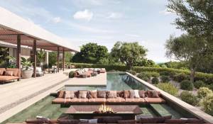 L'ampio soggiorno-sala da pranzo open concept è integrato con gli spazi esterni, tra cui una terrazza con pergolato, un'area lounge con camino esterno e una piscina a sfioro di 46,8 m². Sulla terrazza sul tetto si trova un'impressionante area chill-out con vista panoramica sulla natura circostante e sul mare.