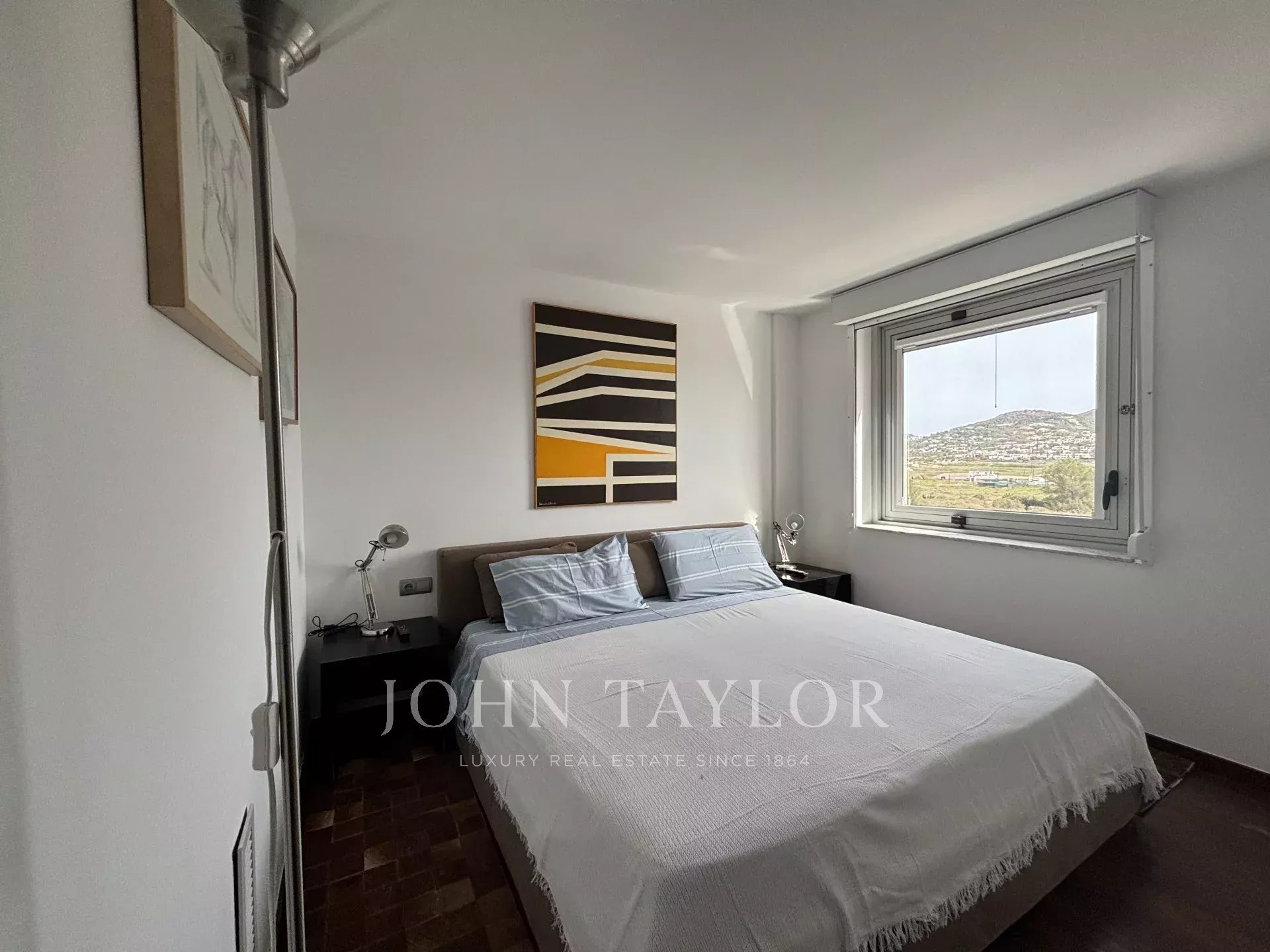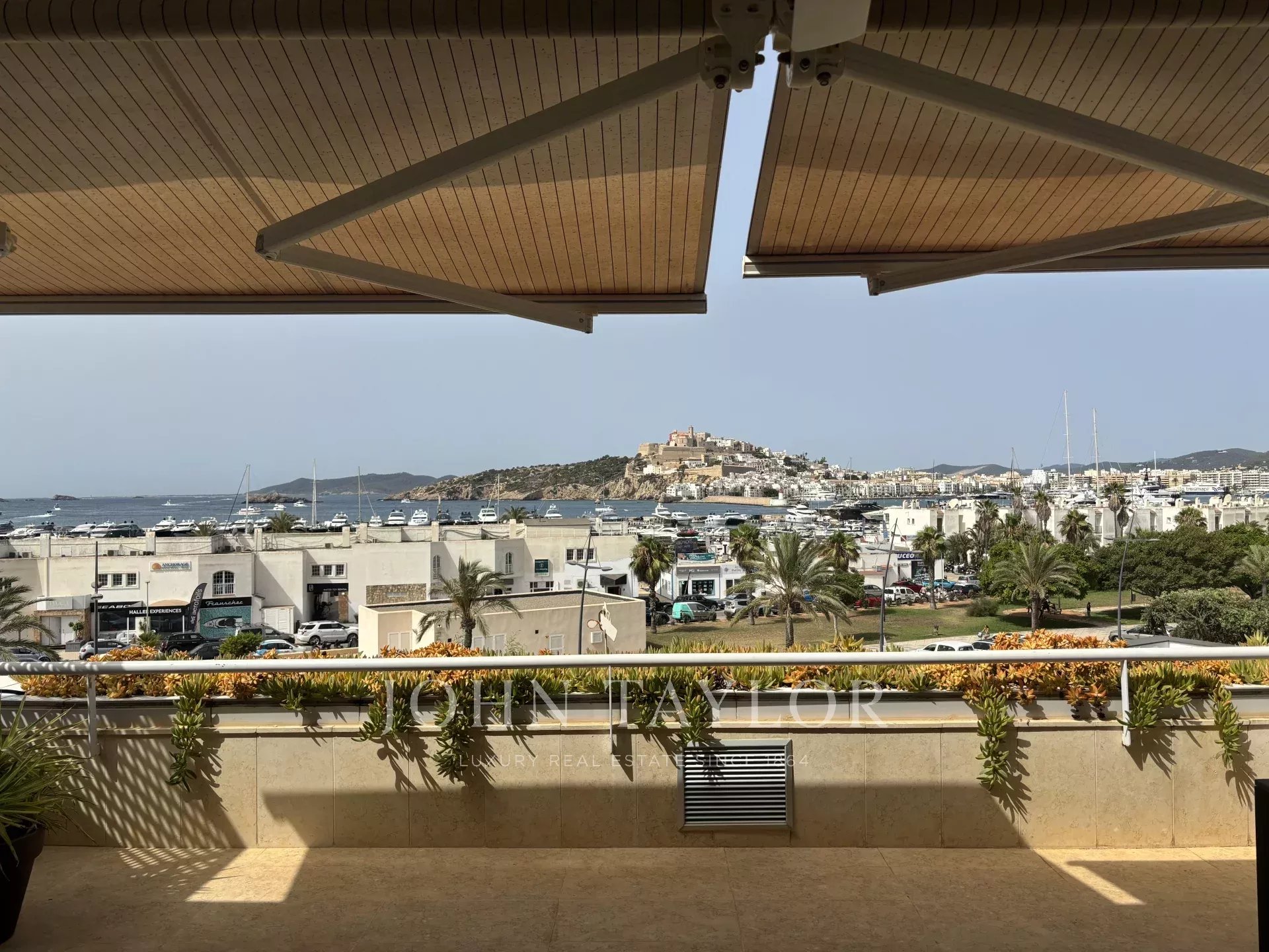 Con una superficie di 150 m², lo spazio comprende due camere da letto matrimoniali splendidamente arredate, di cui una con bagno privato, una camera singola e una cucina a pianta aperta completamente attrezzata che si integra perfettamente con le zone pranzo e soggiorno. Da queste aree si gode di una vista mozzafiato sul porto turistico e sulla storica Dalt Vila, rendendo ogni momento un piacere visivo.