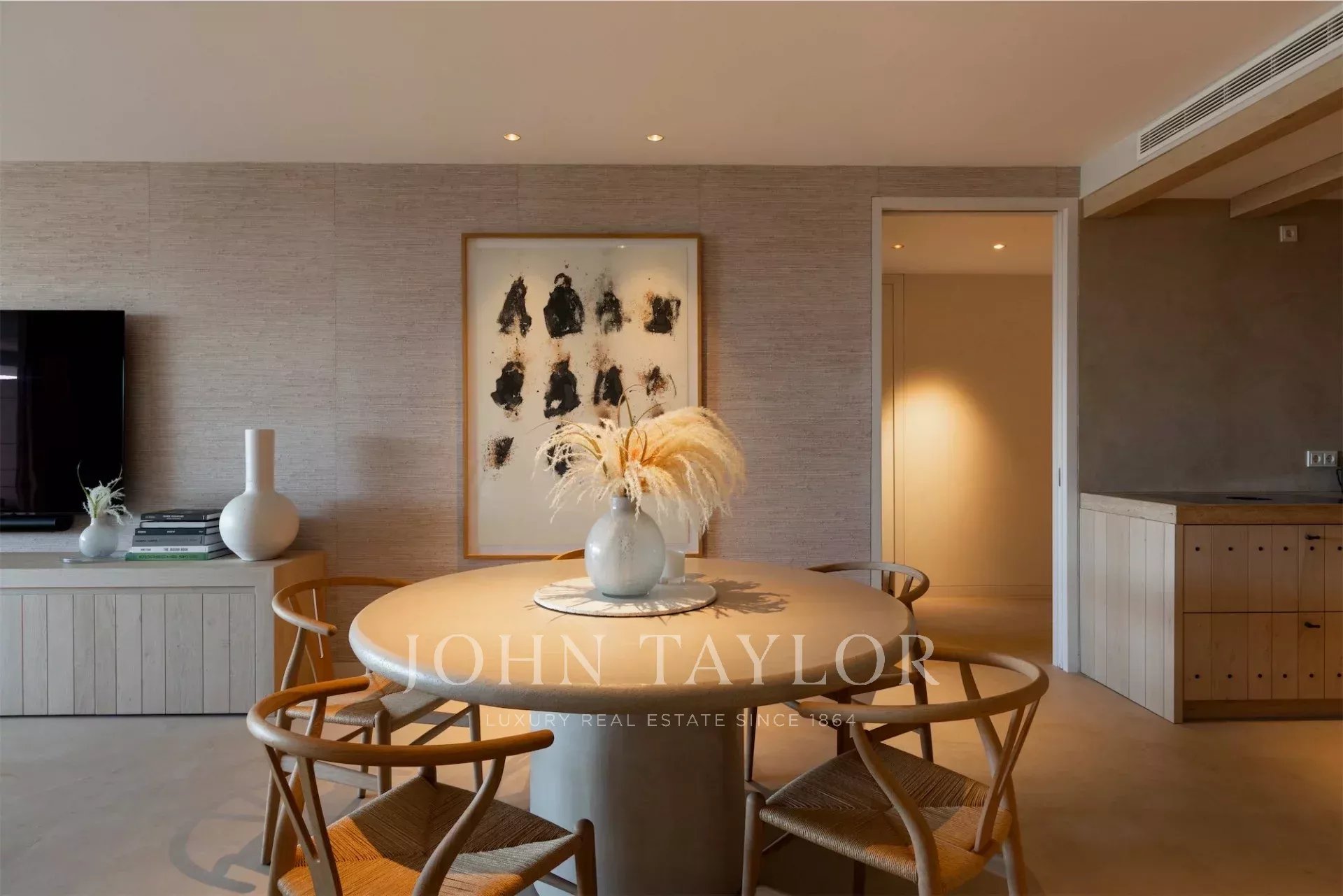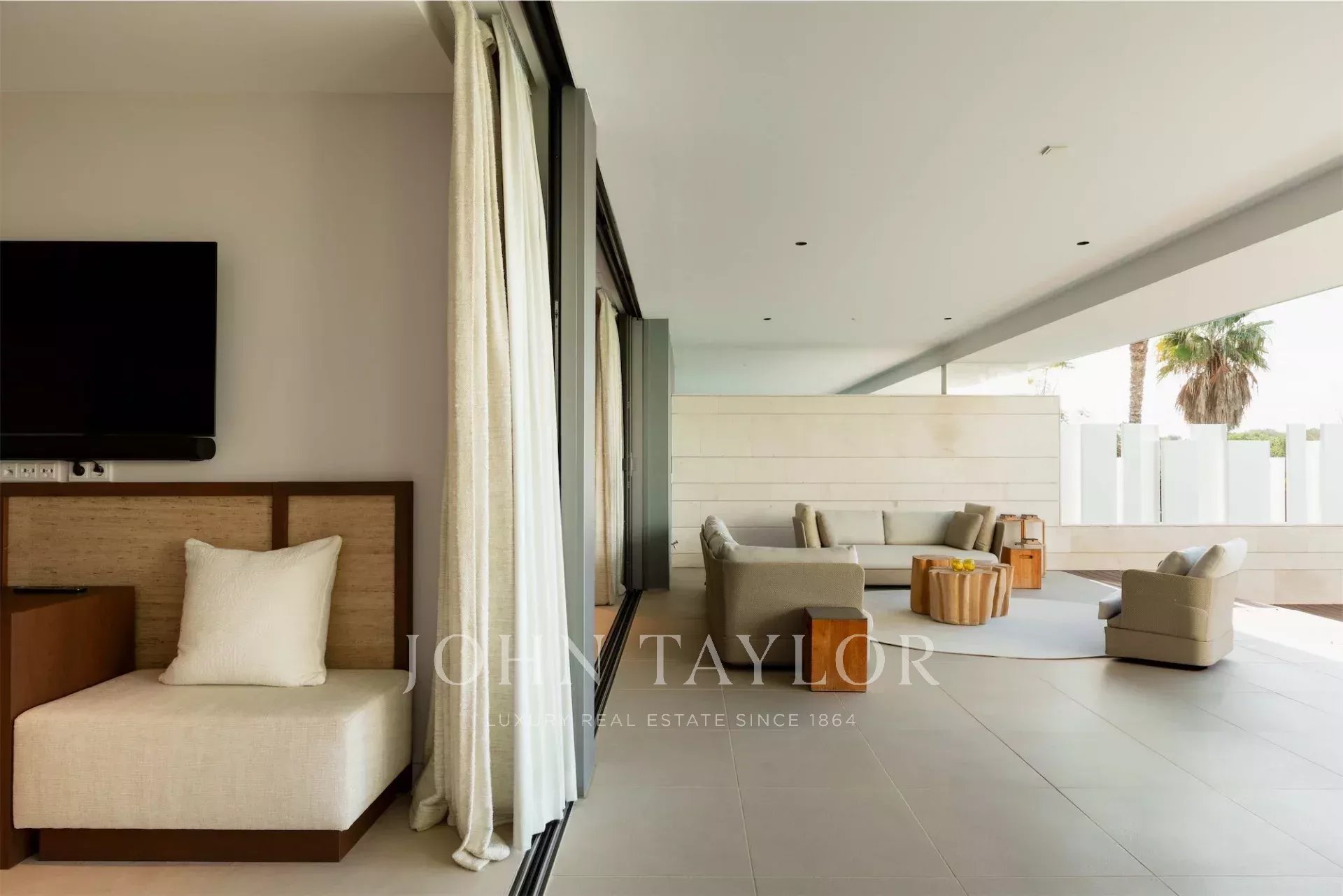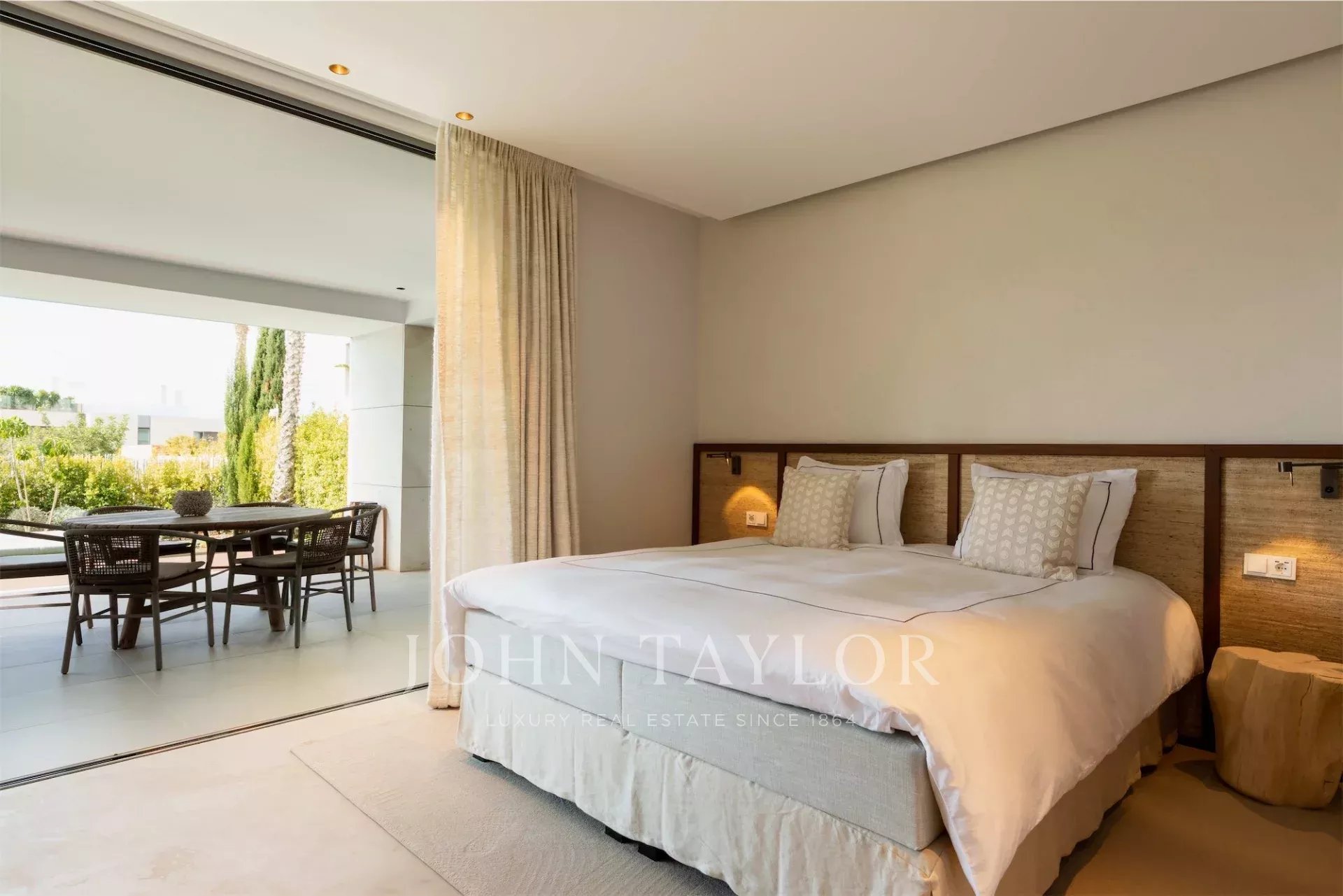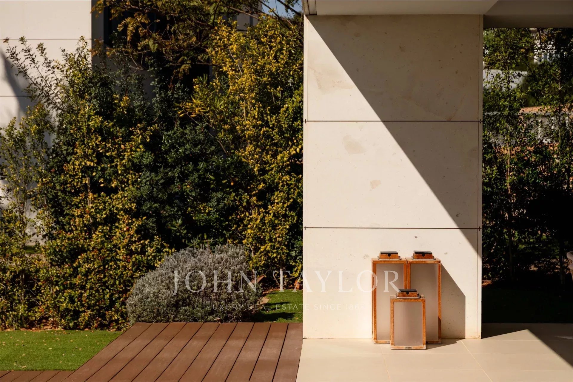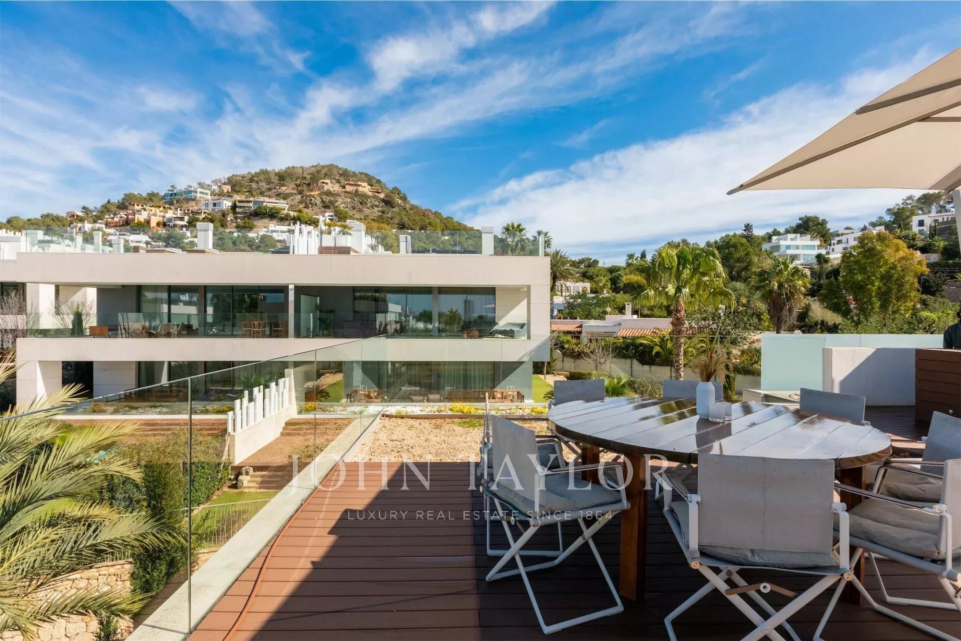 Al livello superiore si sviluppa l’abitazione principale, con soggiorno luminoso e terrazza con vista aperta sul mare e su Dalt Vila. La suite padronale include una cabina armadio, bagno con vasca freestanding, doccia, sauna e un ulteriore bagno di cortesia. Gli interni sono stati curati da un rinomato studio europeo, con materiali di alta qualità e uno stile sobrio e contemporaneo.