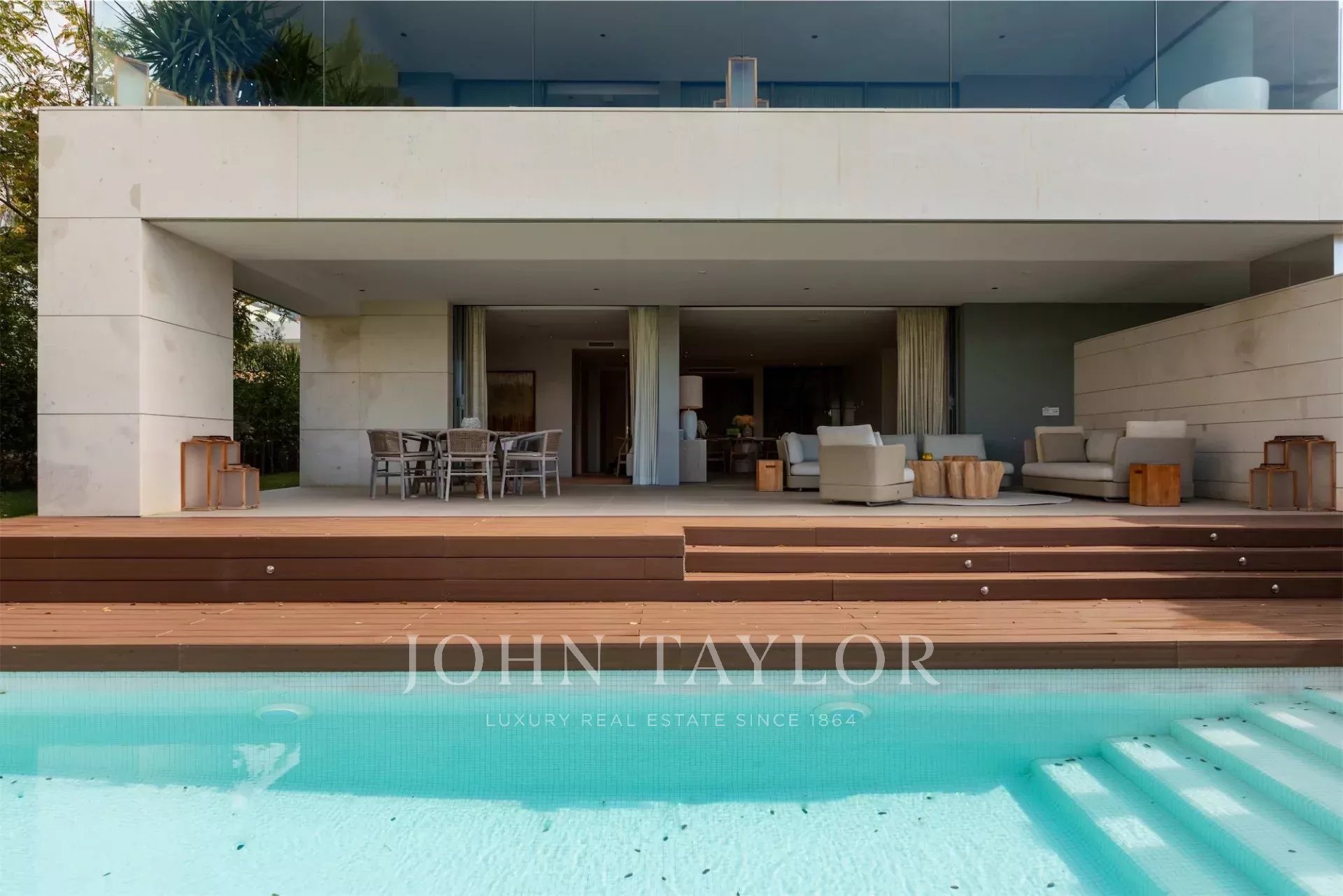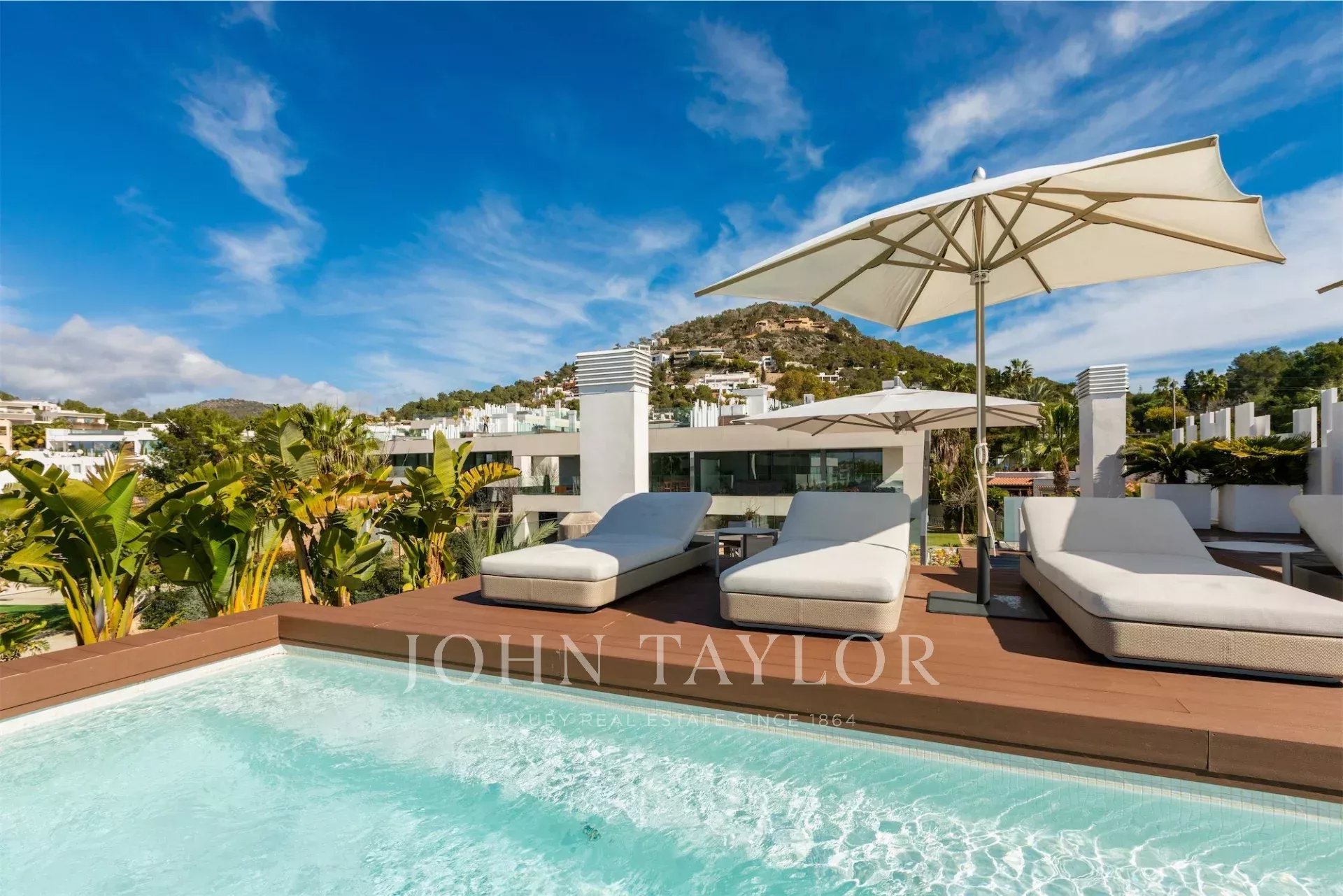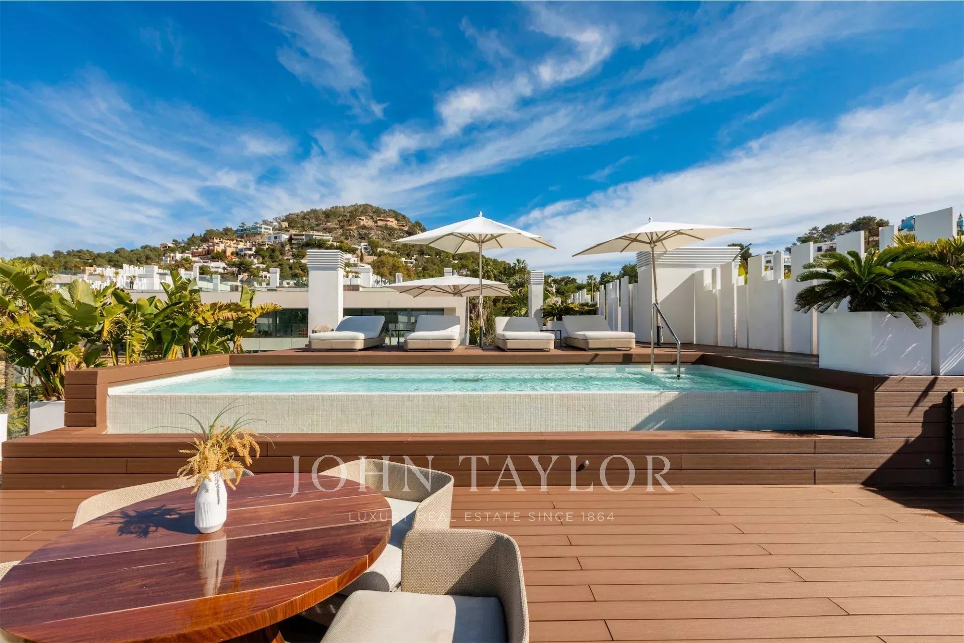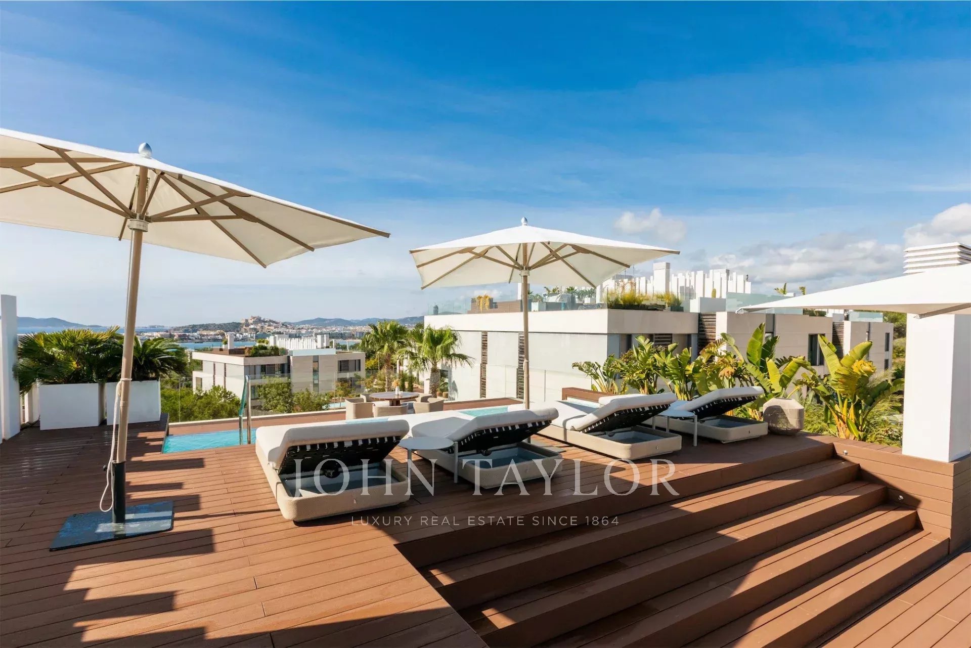 La terrazza sul tetto è uno spazio esclusivo con seconda piscina privata, area relax e vista panoramica. L’esposizione sud-ovest assicura luce naturale per tutto il giorno.