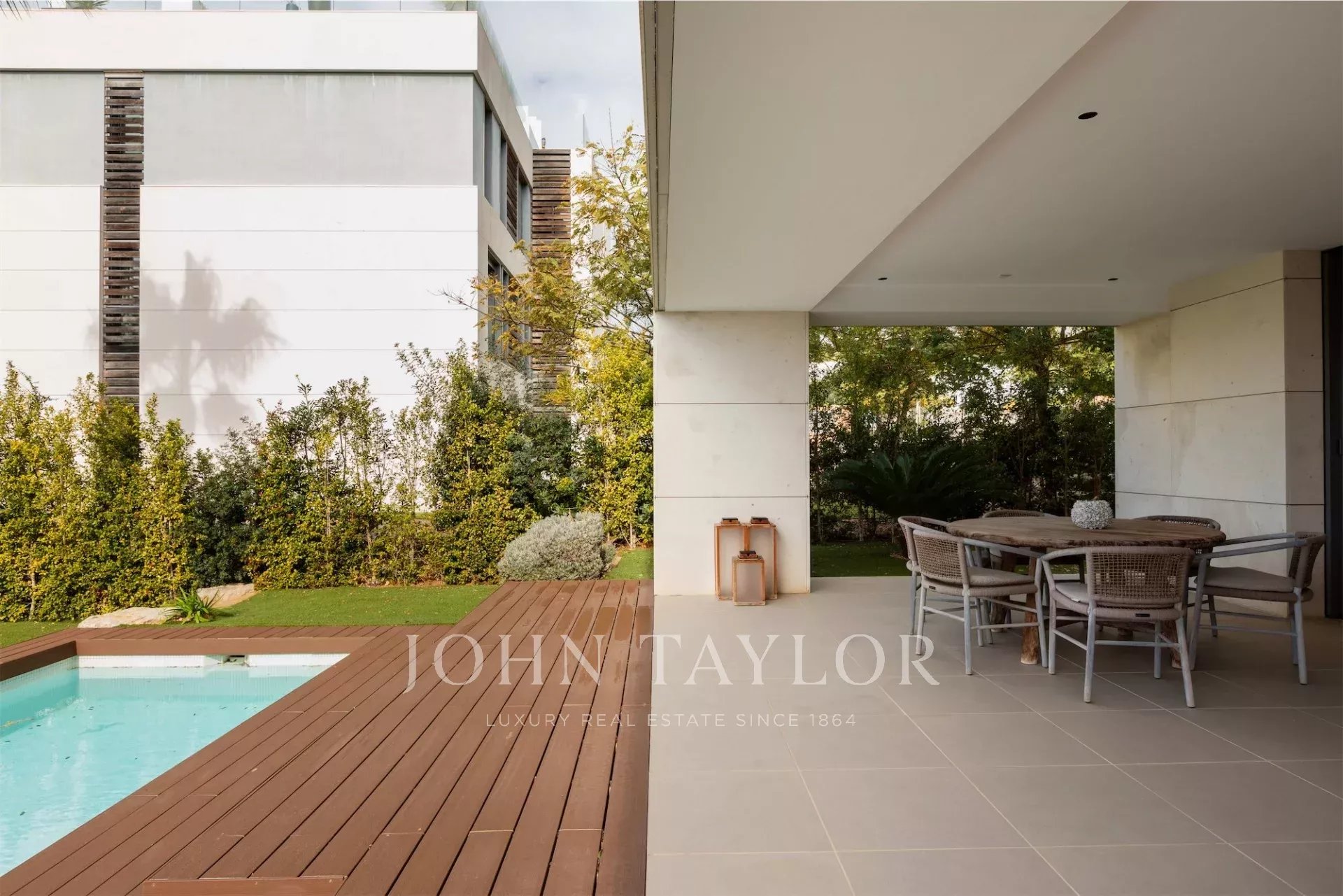Disposta su due piani più una grande terrazza privata sul tetto, la casa dispone di due ingressi indipendenti, perfetti per chi cerca una zona ospiti riservata. Al piano terra troviamo tre camere con bagno privato, zona giorno con cucina a vista, bagno per gli ospiti e accesso diretto a un giardino privato con terrazza coperta e piscina. Questo piano può essere utilizzato come appartamento indipendente.