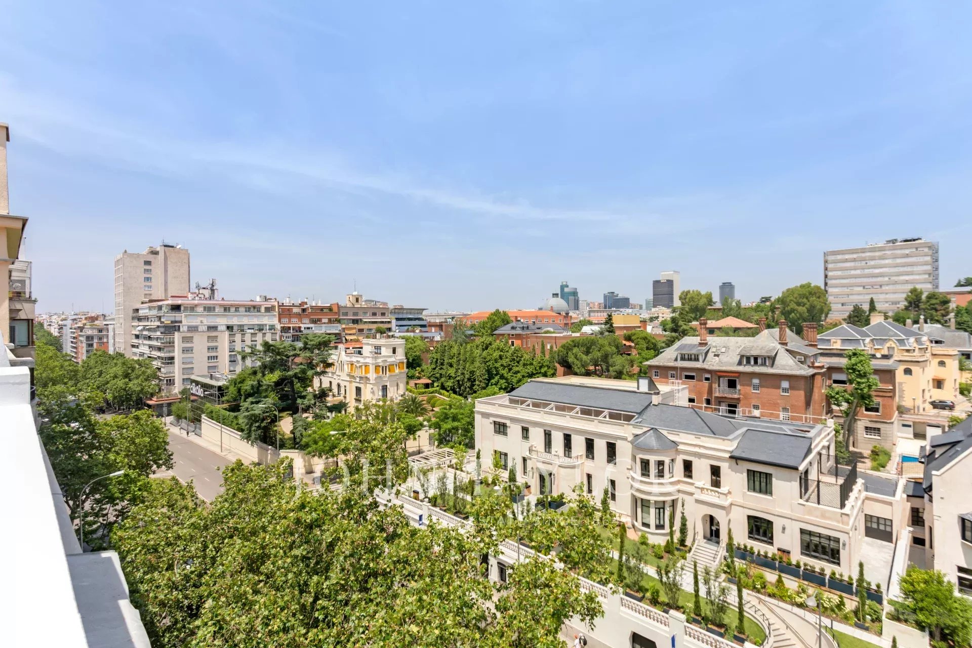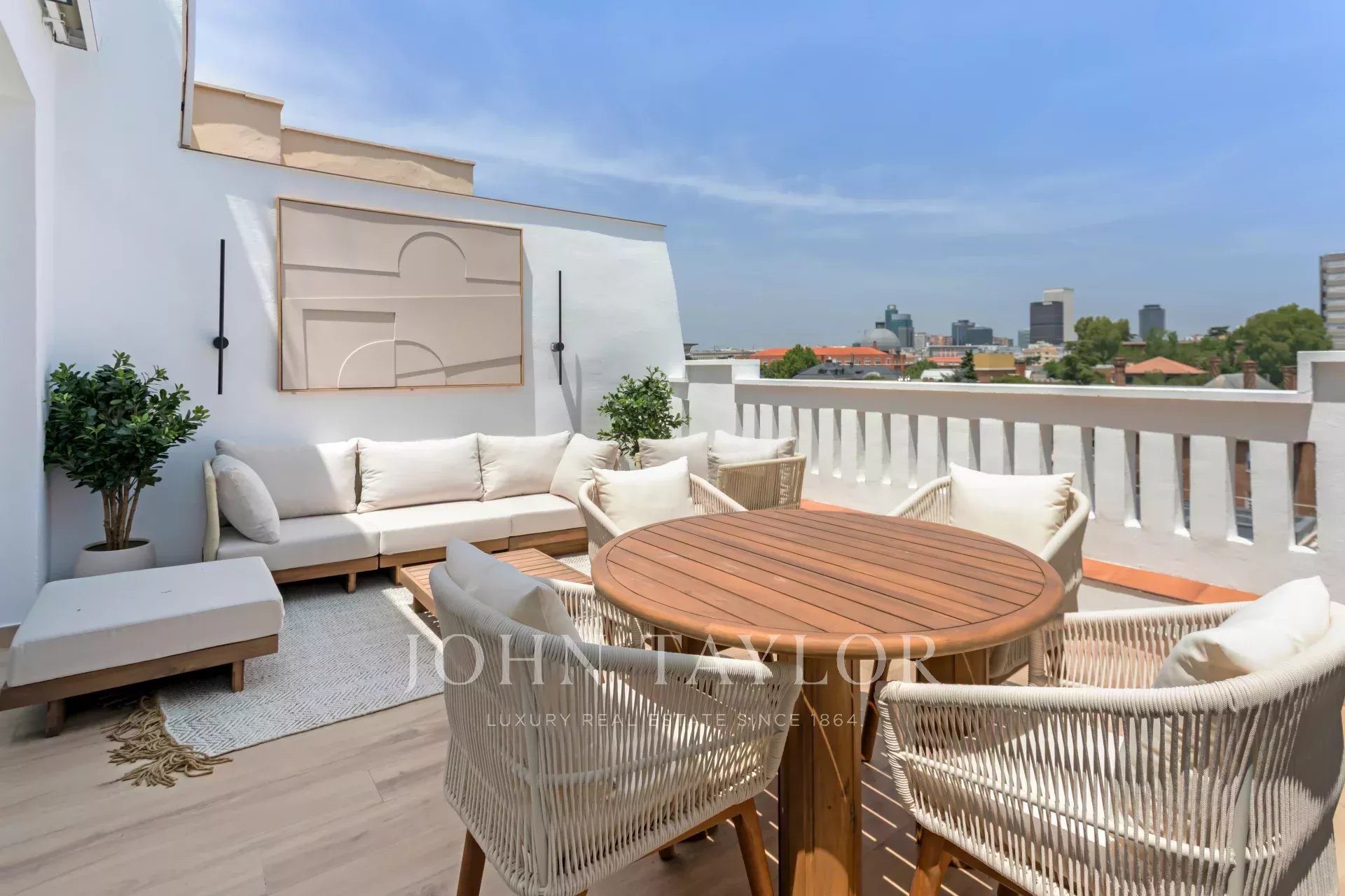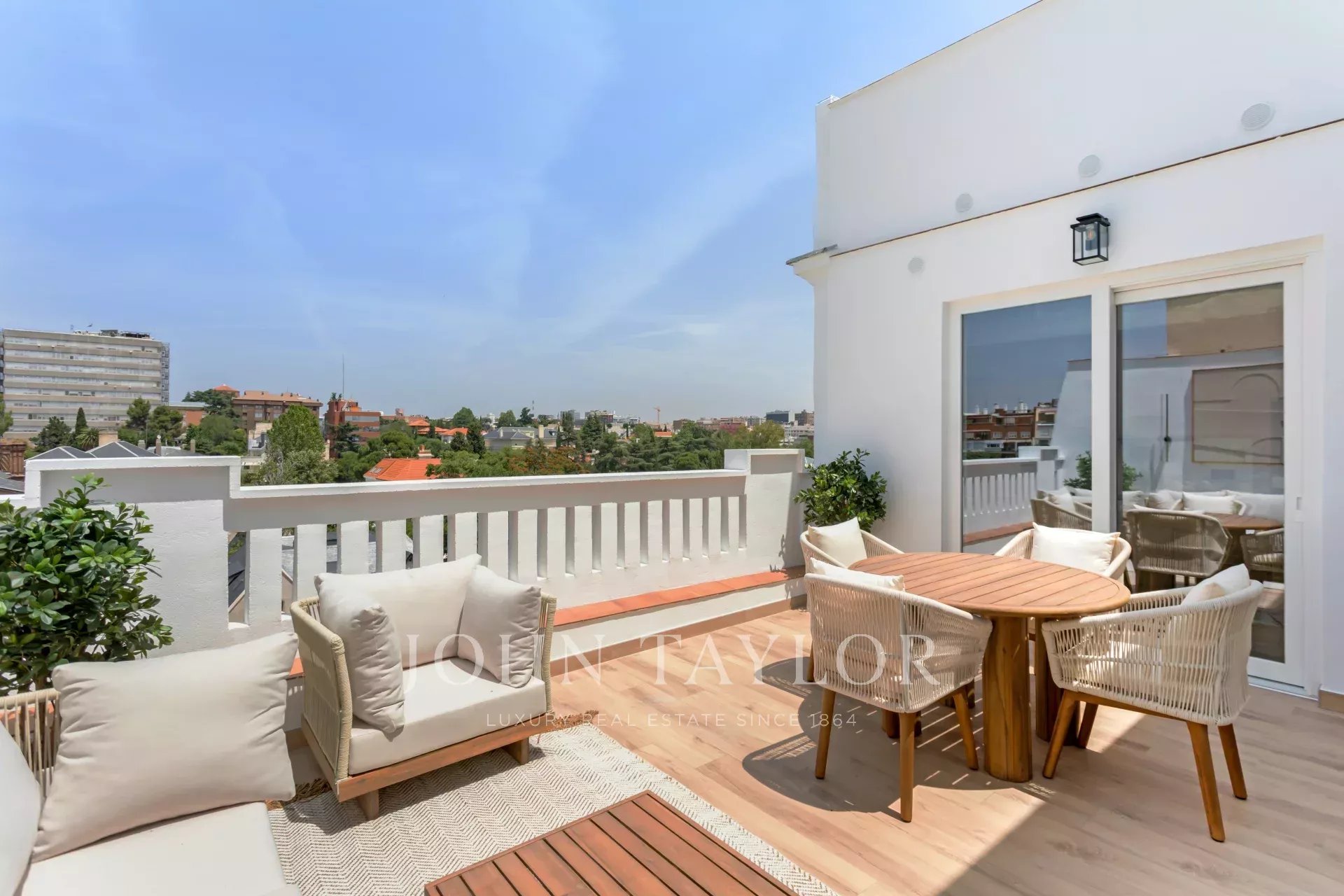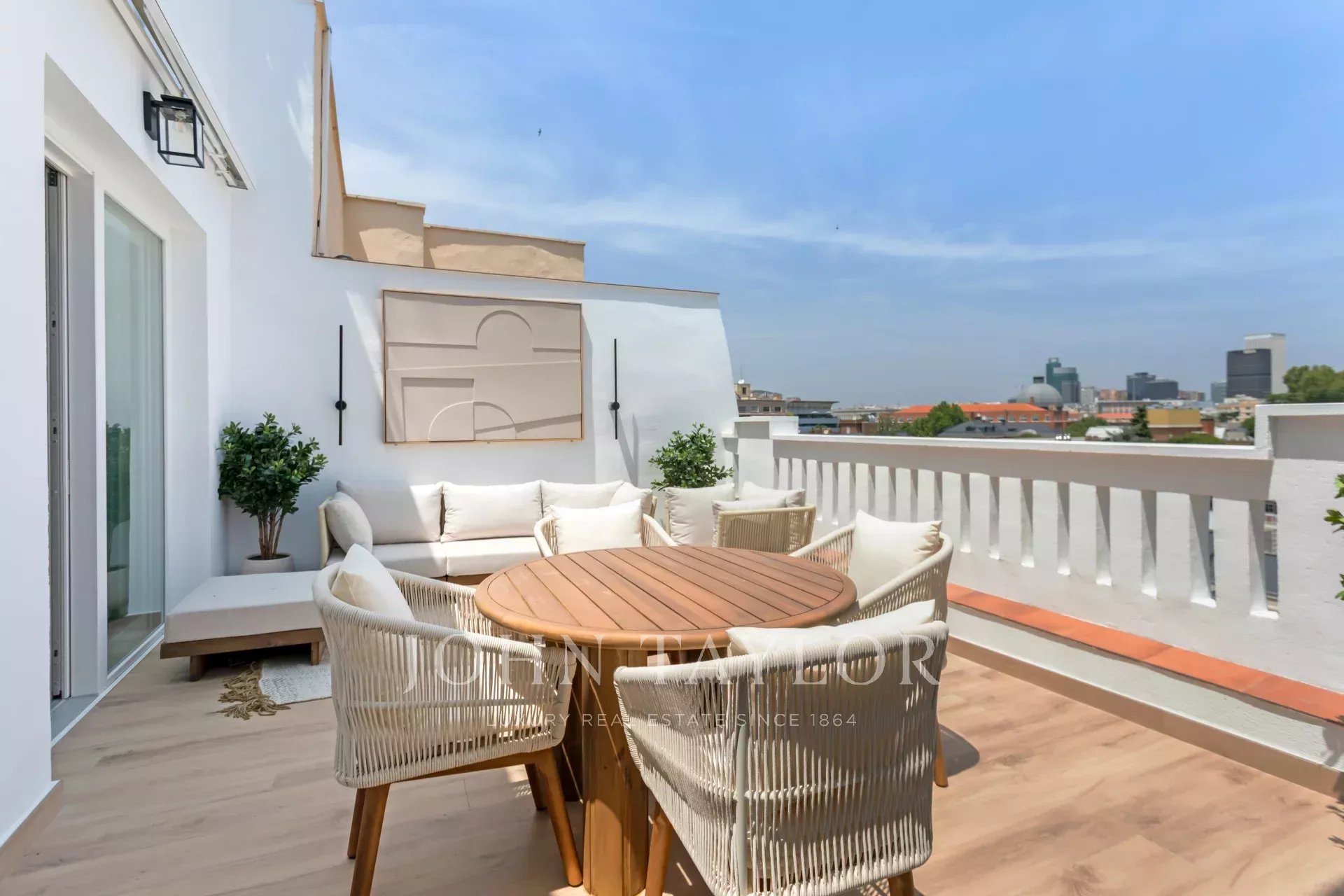 La terrazza ha una forma quadrata, una superficie di 20 m² e gode di splendide viste panoramiche verso il nord della capitale.