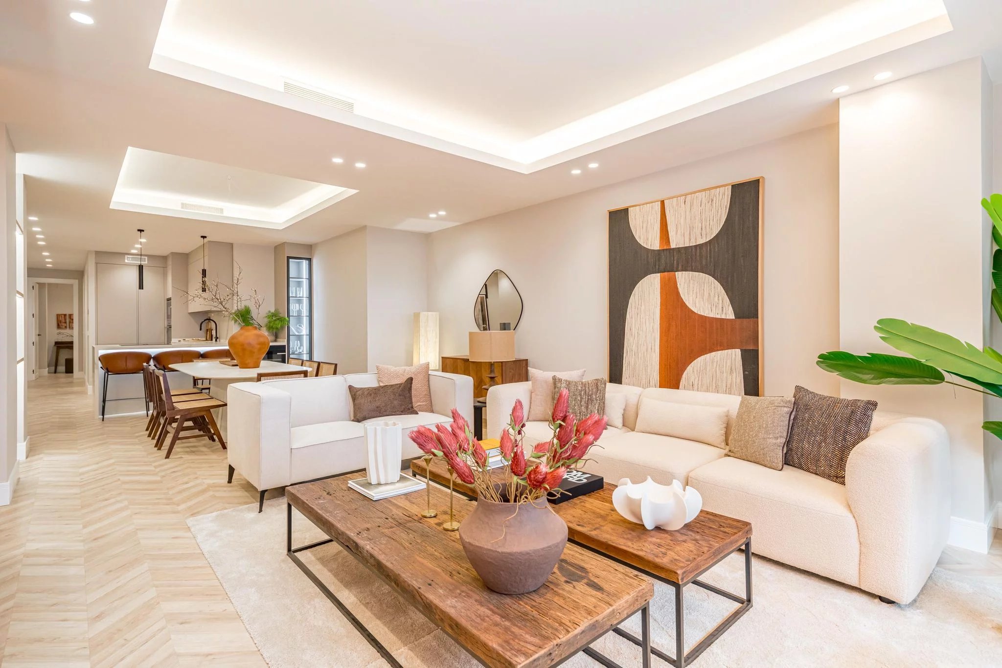 La zona sociale si articola attorno a un ampio soggiorno e sala da pranzo, perfetto sia per la vita quotidiana sia per ricevere gli ospiti, accompagnato da una cucina spaziosa e funzionale, pensata per un uso confortevole ed efficiente.
