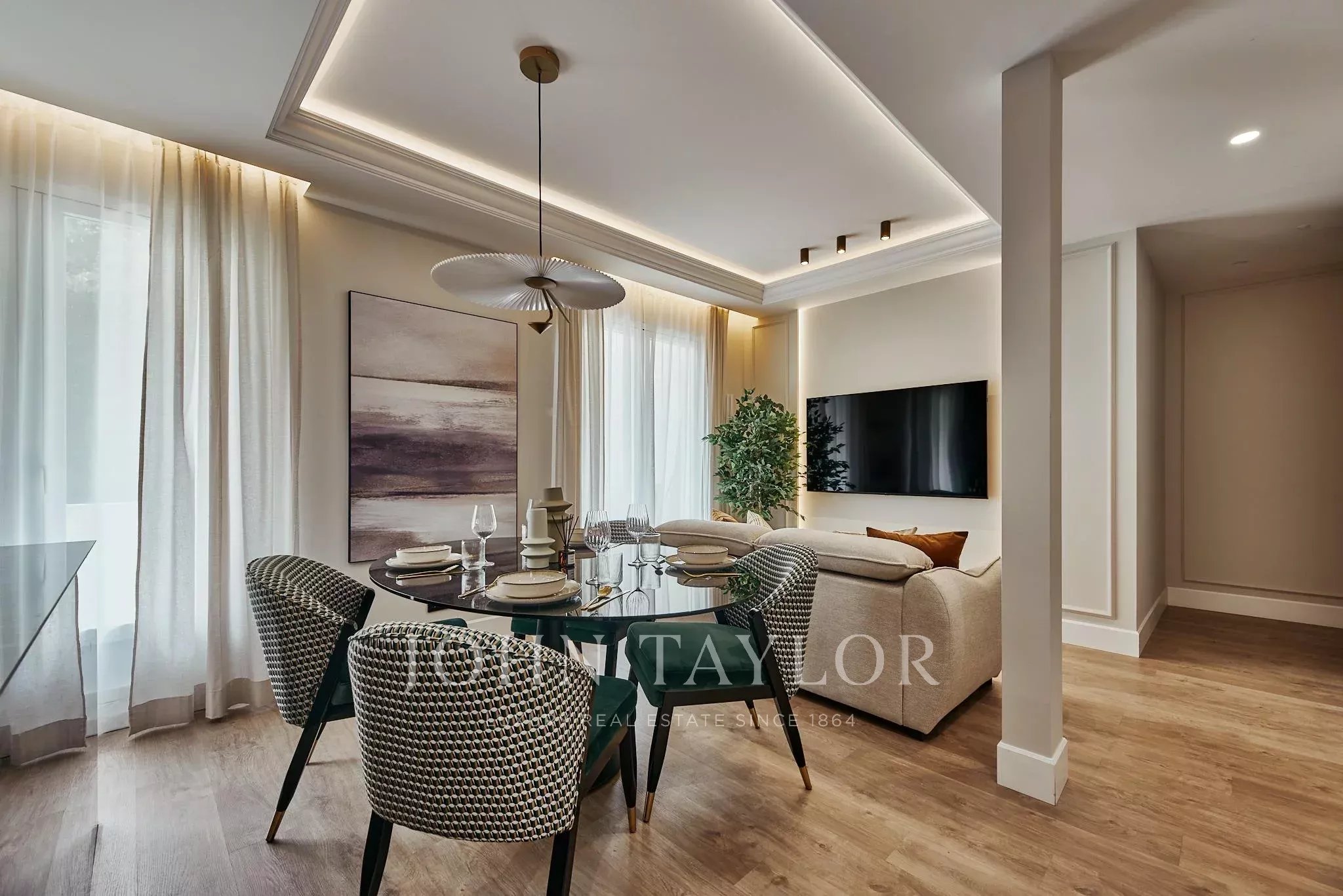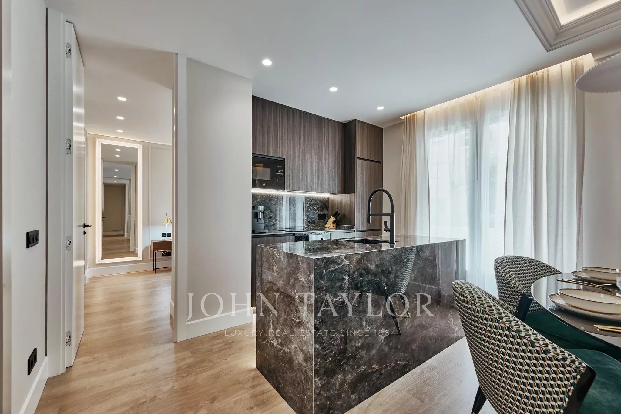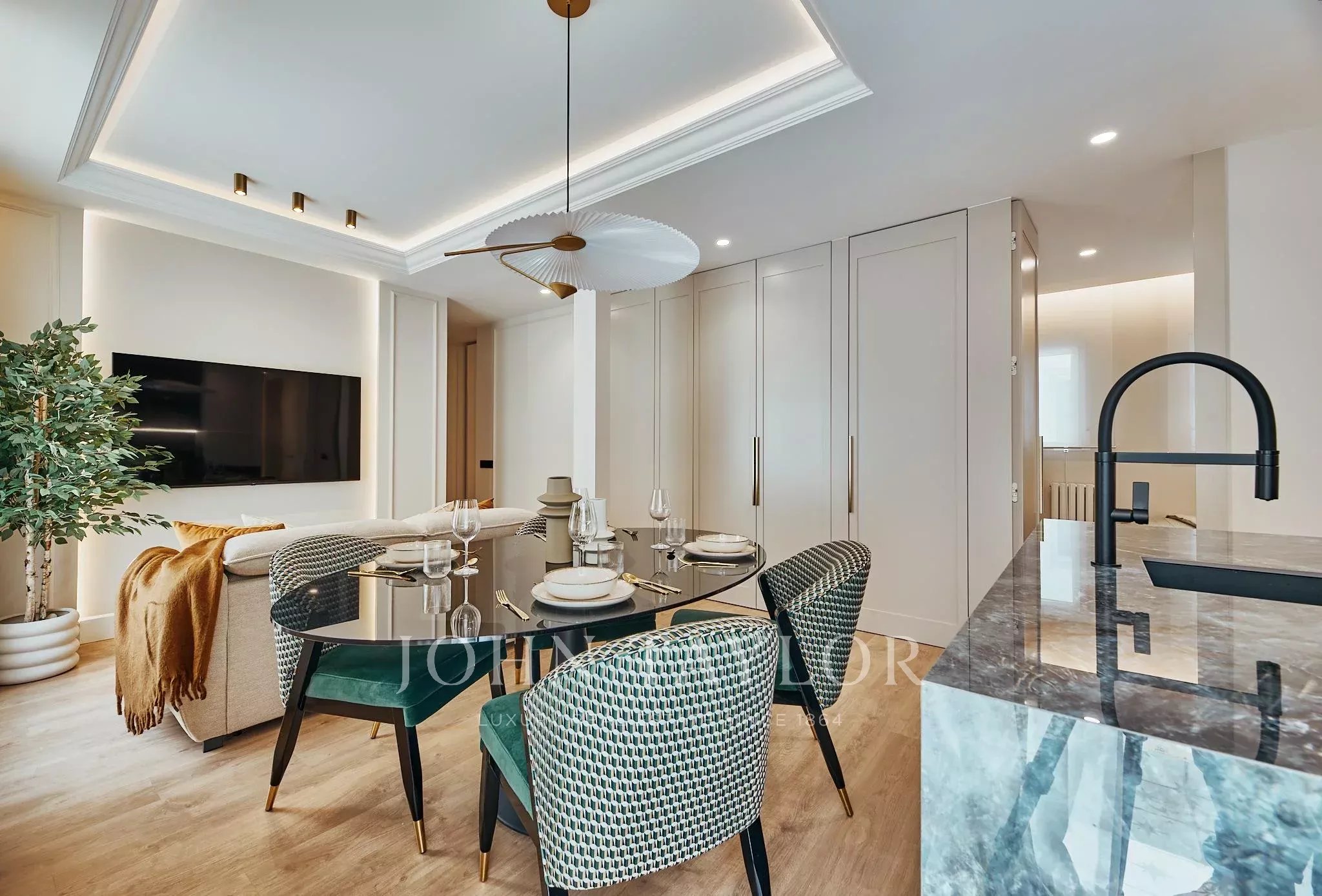 L'appartamento è stato completamente rinnovato con un raffinato design contemporaneo che equilibra perfettamente estetica e funzionalità. La zona giorno si articola intorno a un luminoso soggiorno-pranzo, concepito come uno spazio accogliente e fluido, che si integra armoniosamente con una cucina completamente attrezzata, pensata per uno stile di vita attuale.
