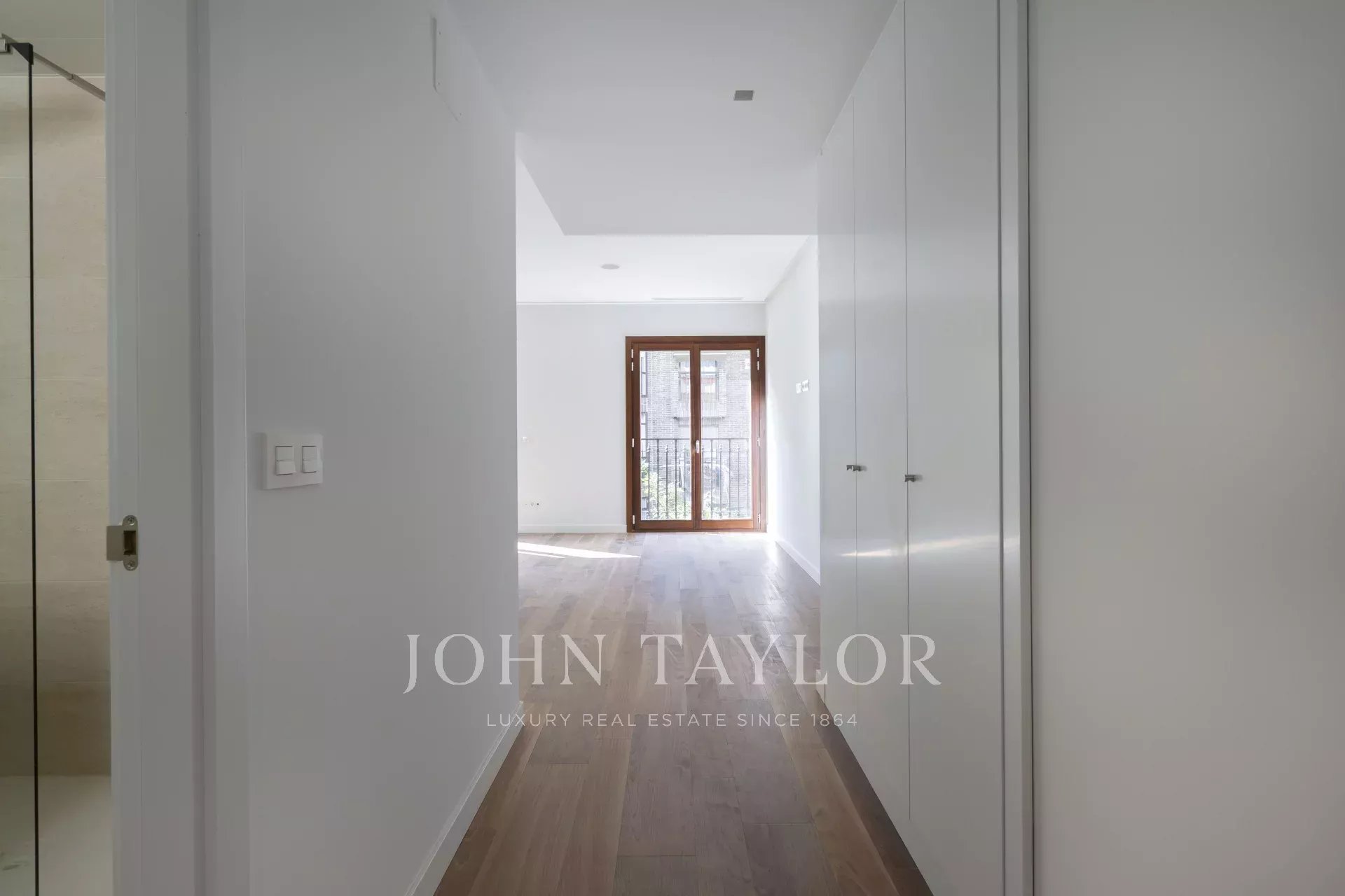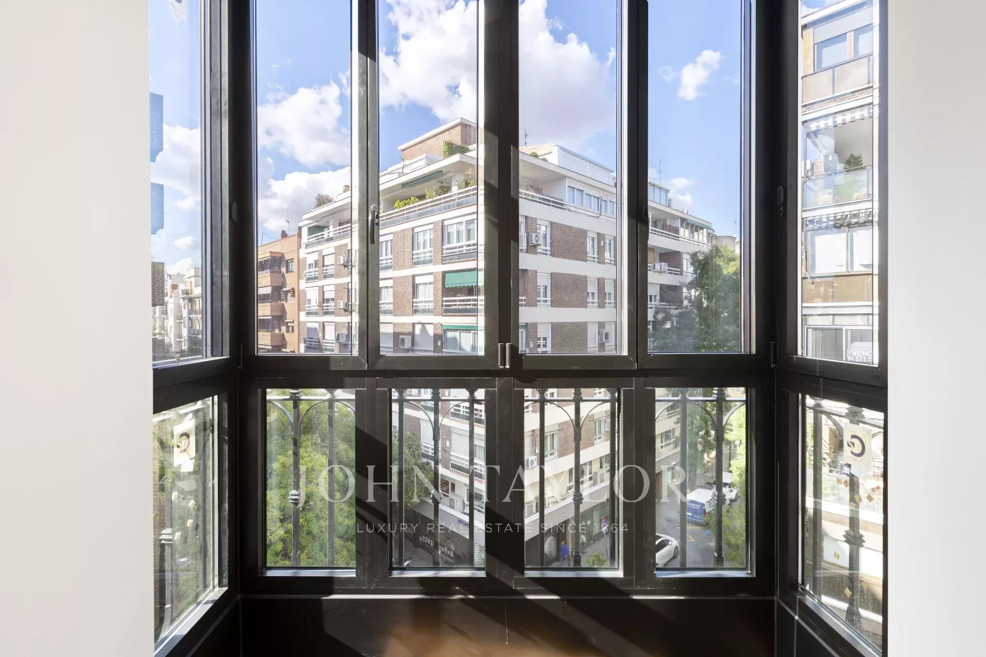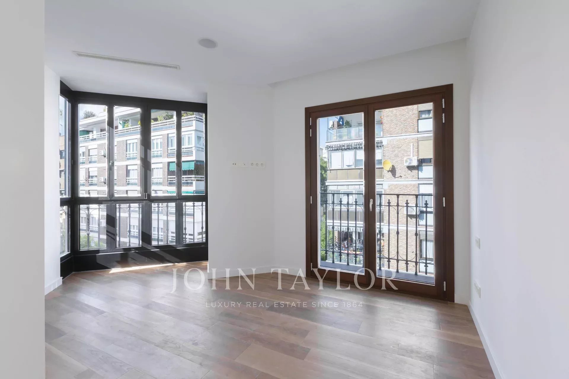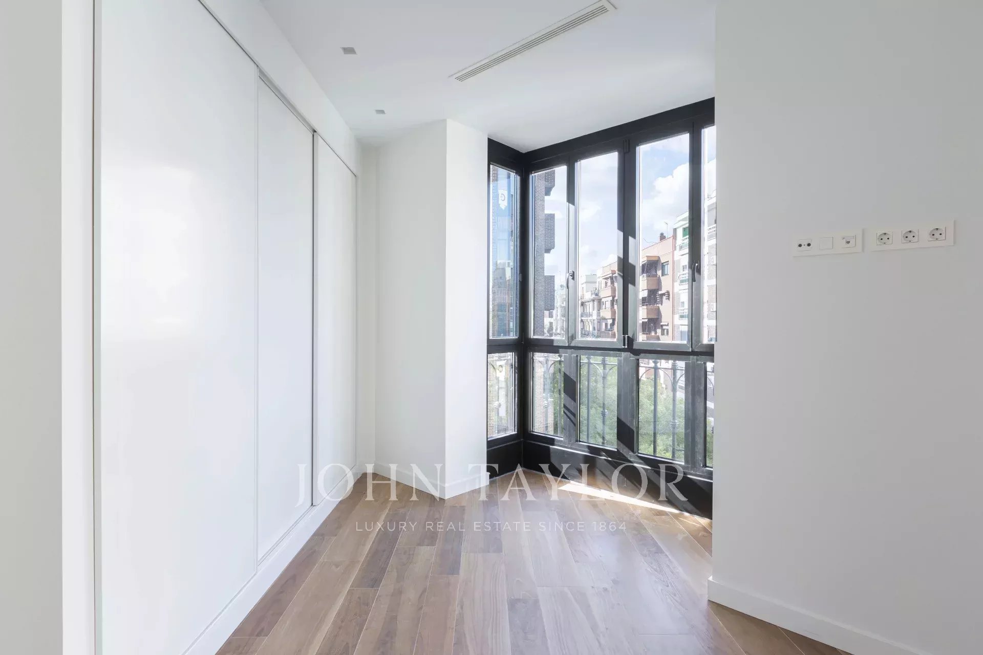 In uno dei pochi edifici nuovi del Barrio de Salamanca, troviamo questo favoloso appartamento nuovo di zecca. Con cinque balconi che si affacciano sulla strada e che occupano l'angolo del quarto piano dell'edificio, l'appartamento gode di una fantastica luce e di ampi spazi.