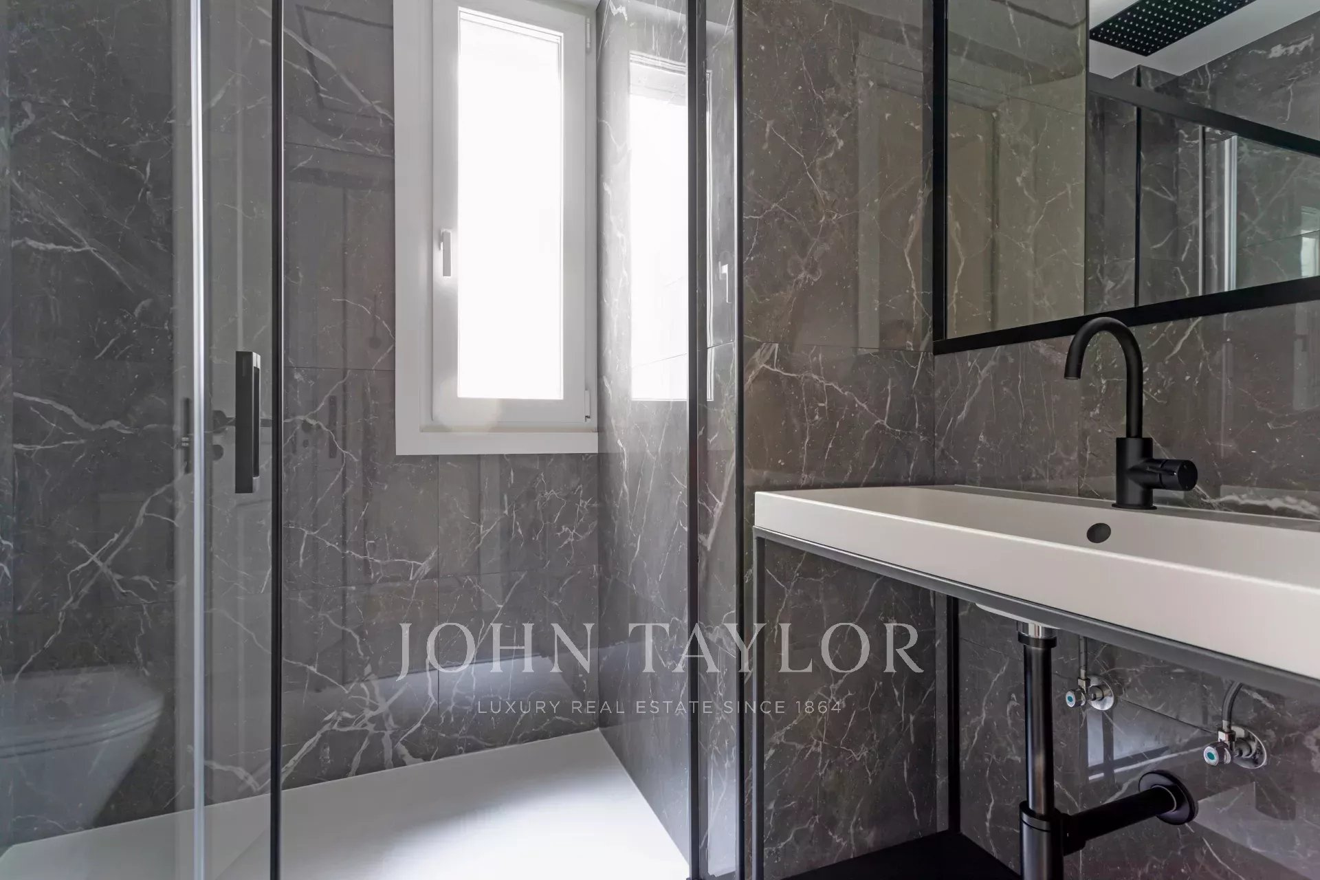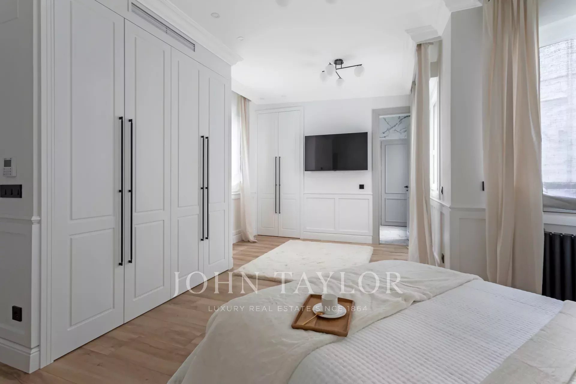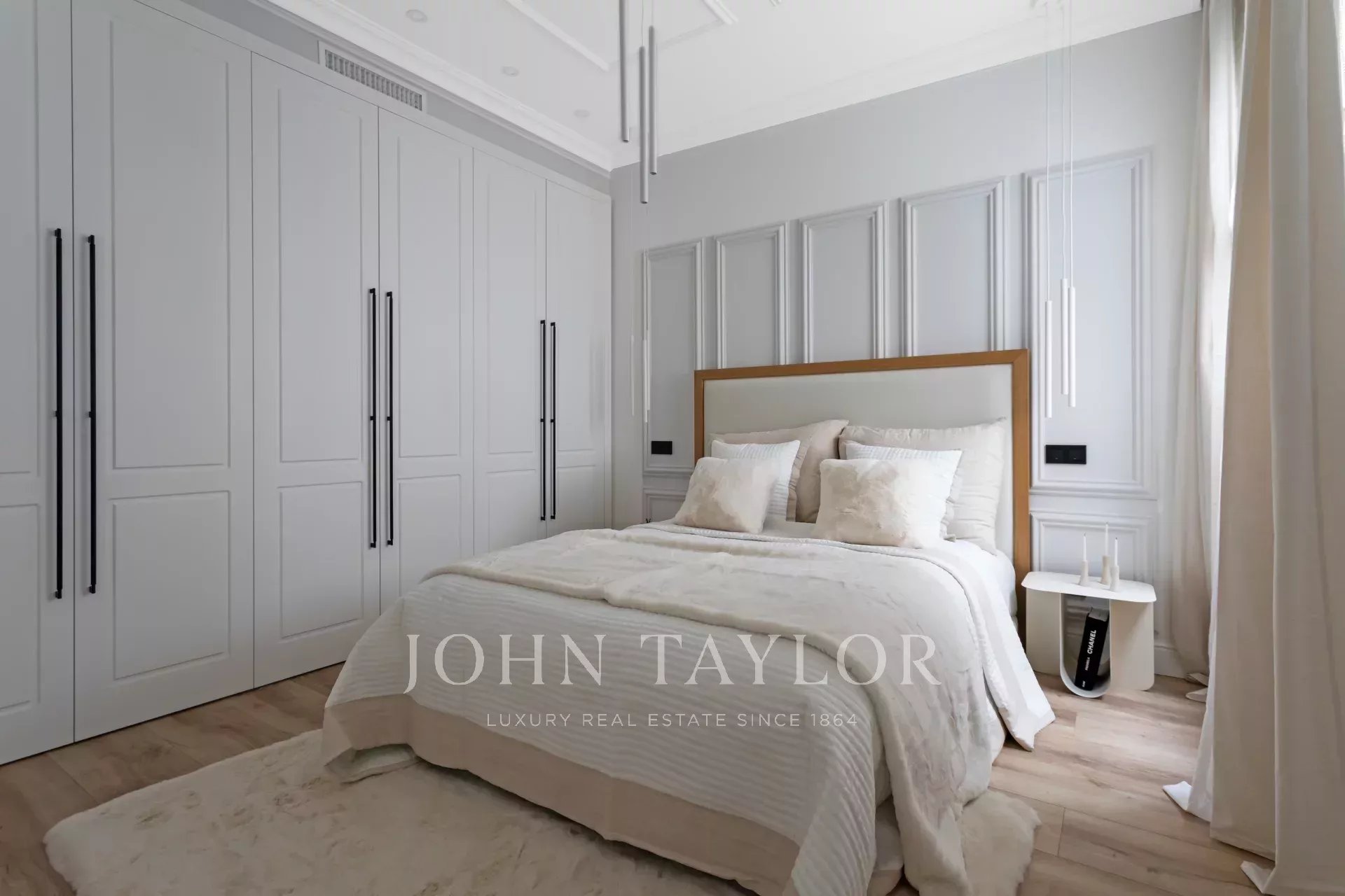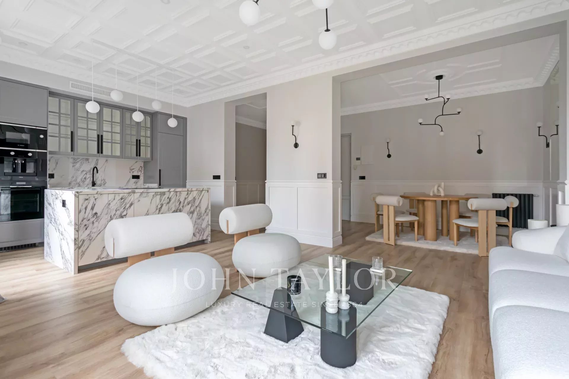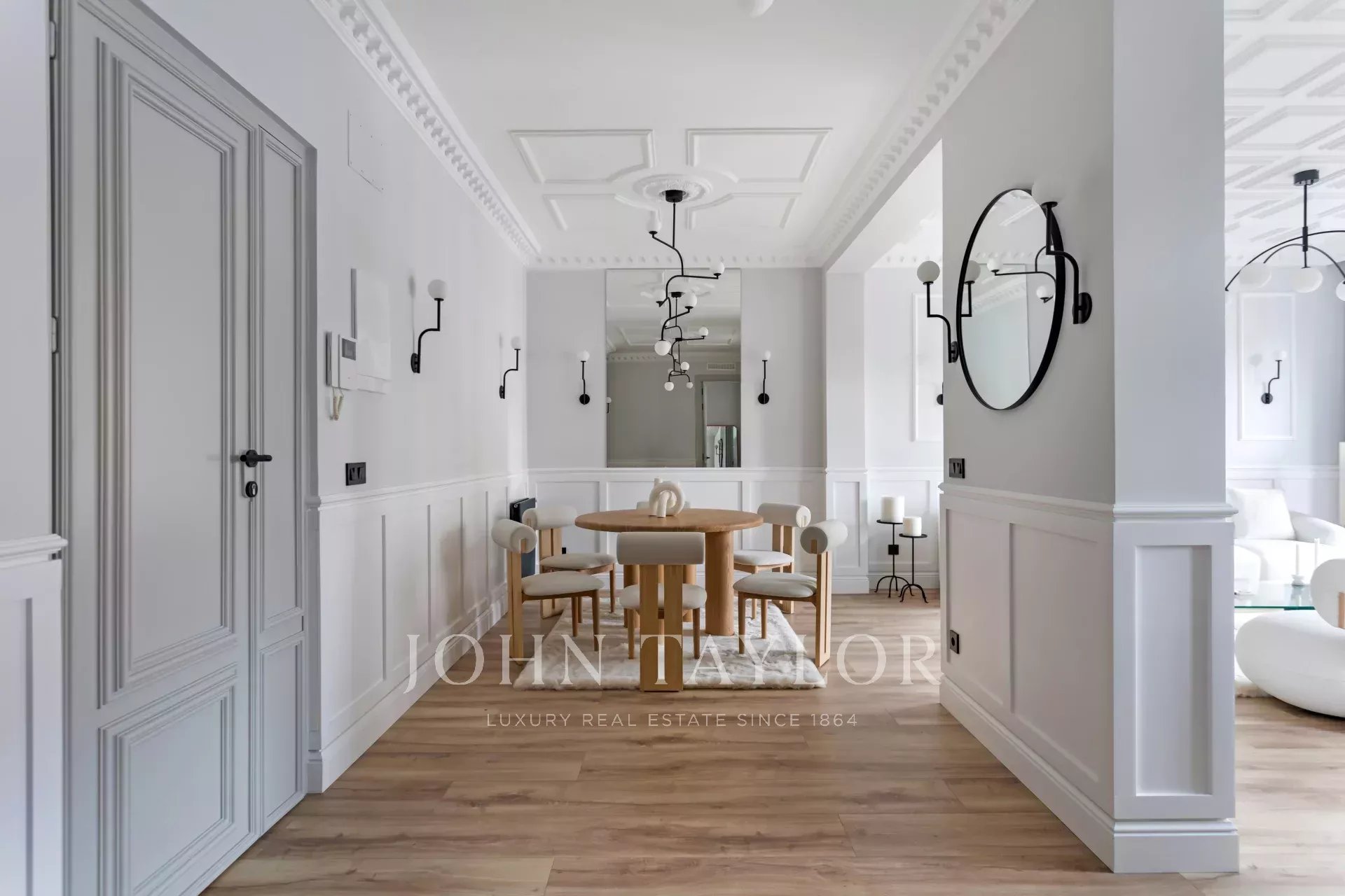 Un appartamento appena ristrutturato situato al quinto piano di un bellissimo edificio con una facciata classica.