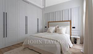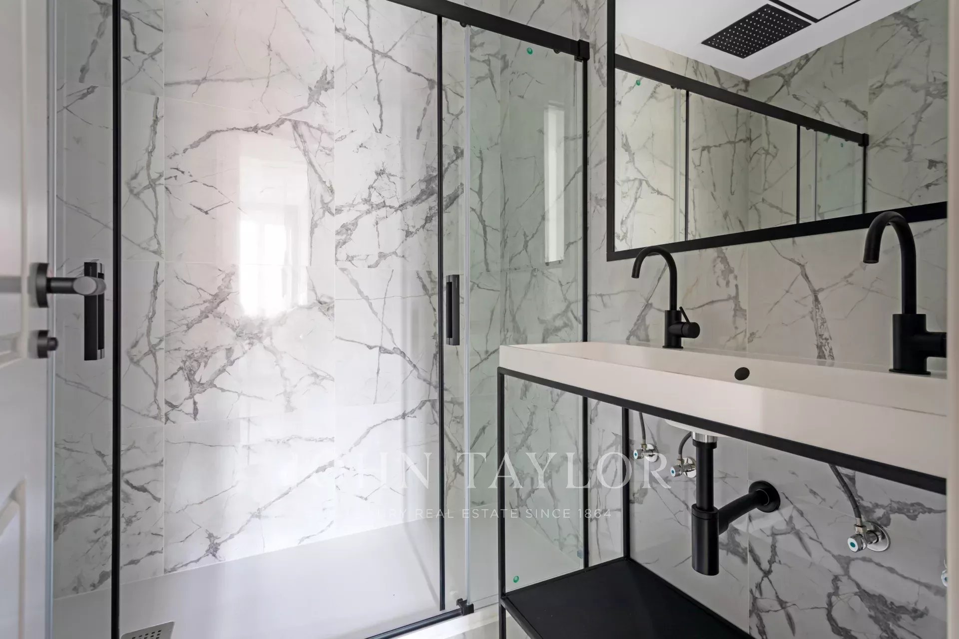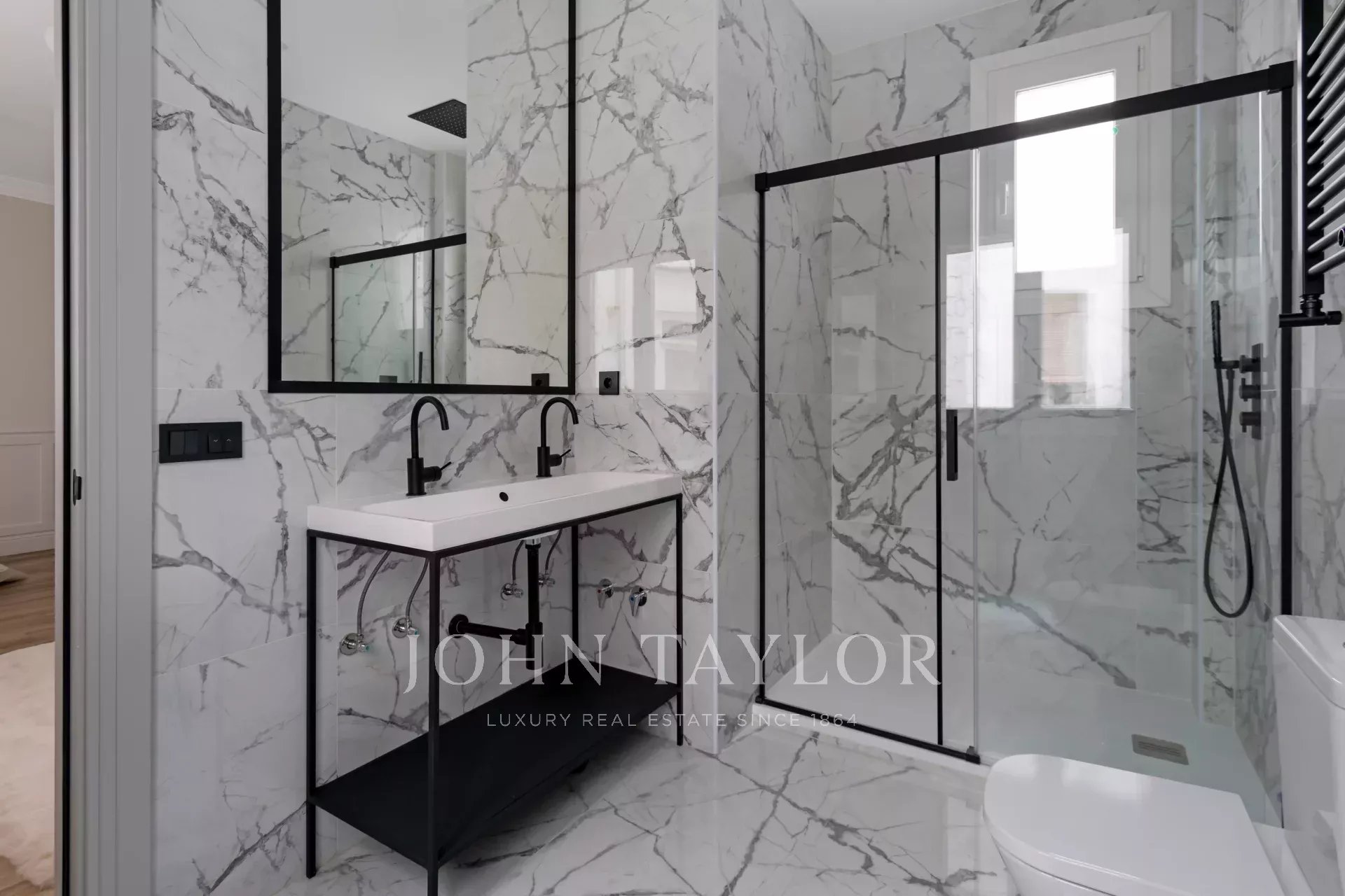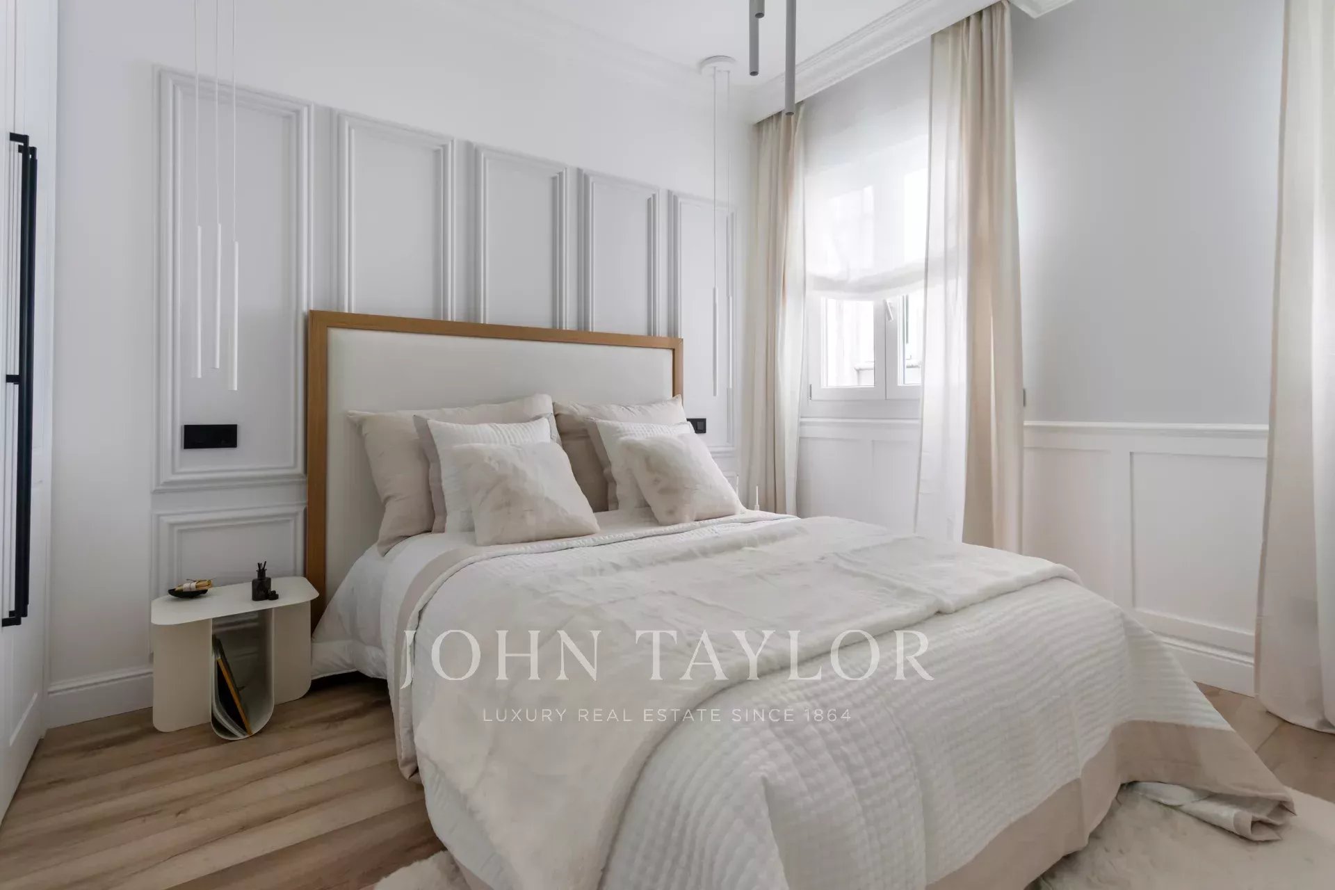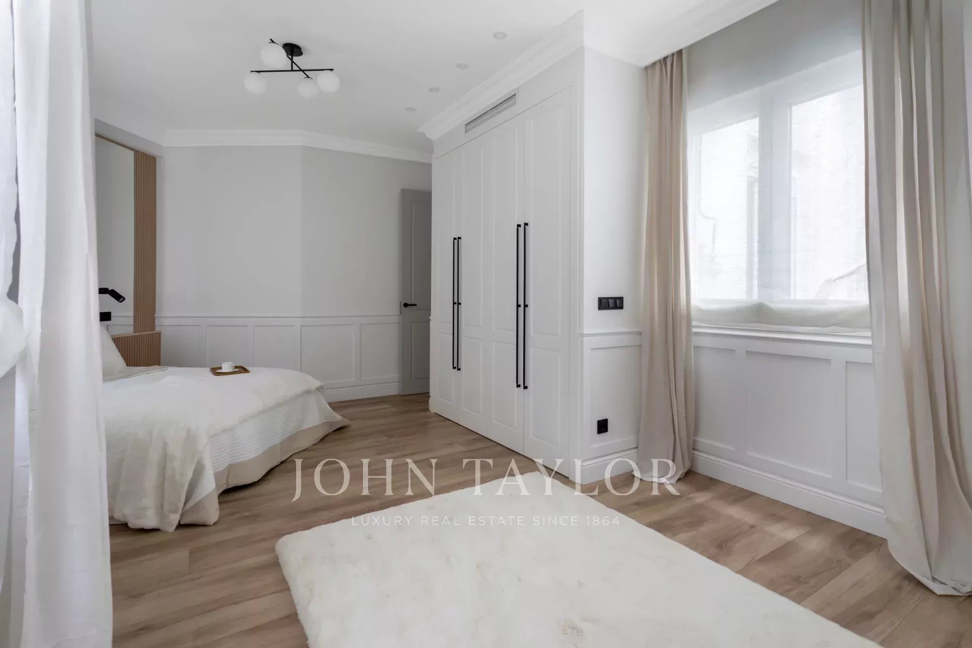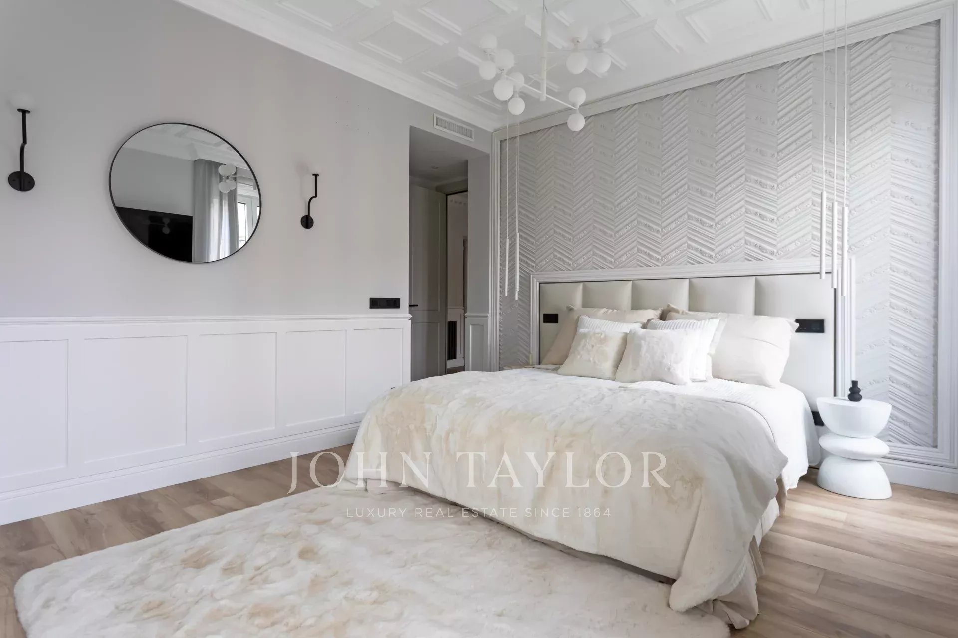 Un appartamento appena ristrutturato situato al quinto piano di un bellissimo edificio con una facciata classica.