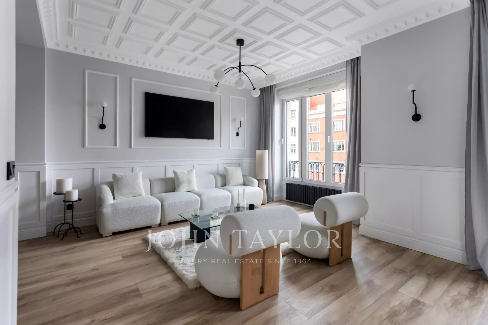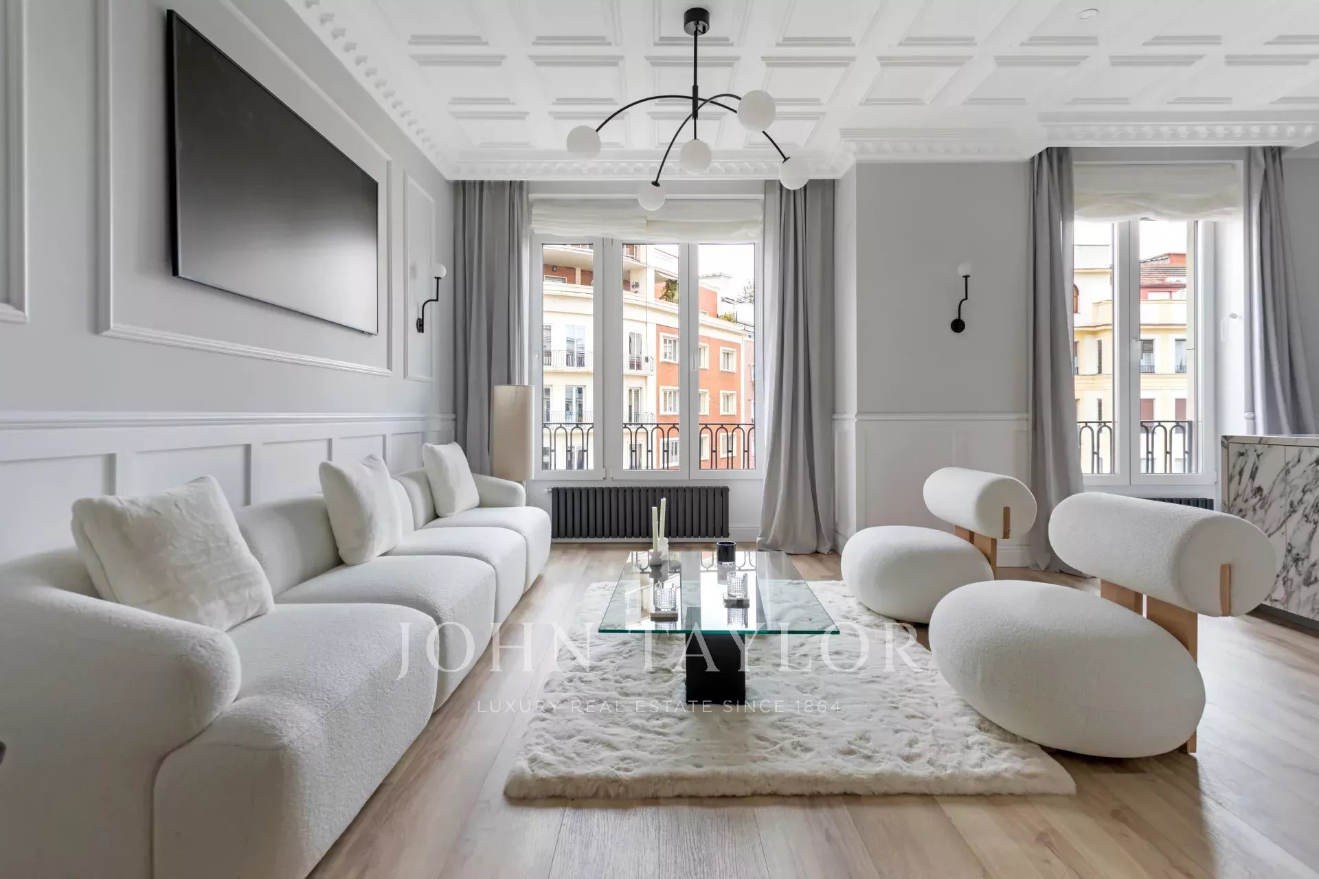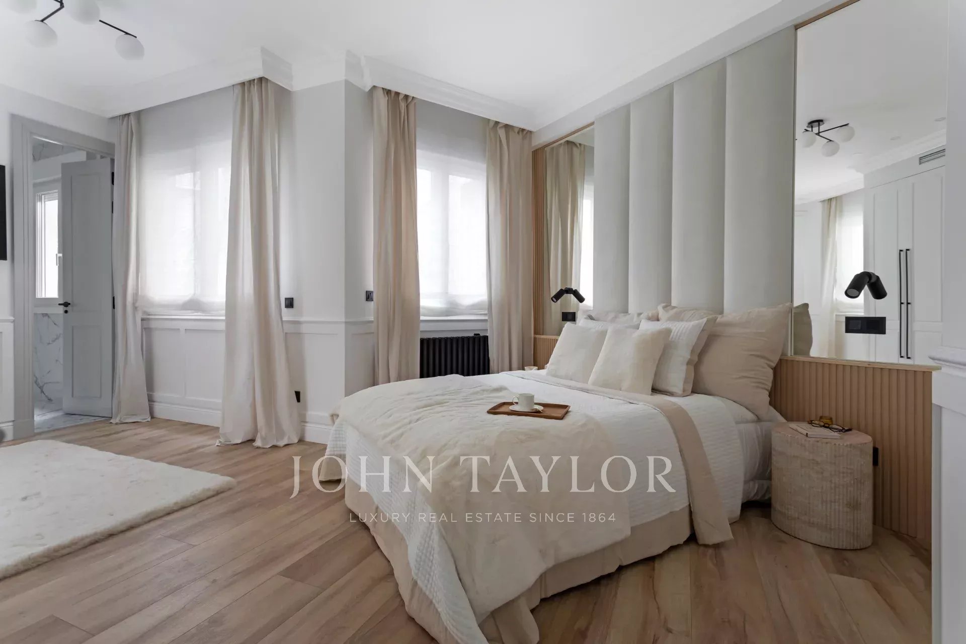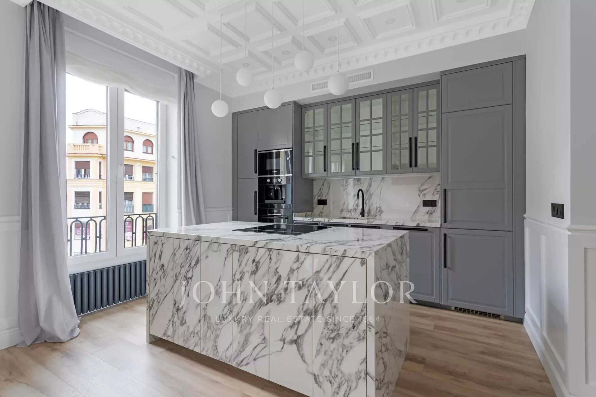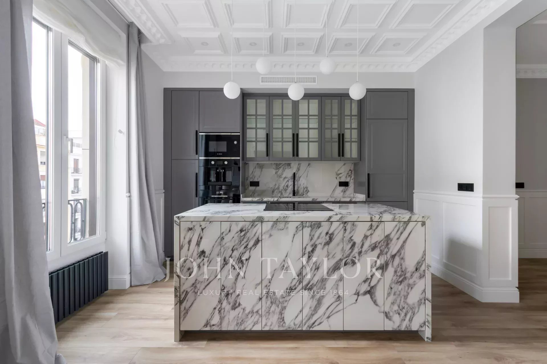 L'area esterna è occupata dall'ampio soggiorno con balconi che si affacciano su via Alcalá, con la cucina in stile moderno, con una grande isola e dotata di elettrodomestici di alta gamma.