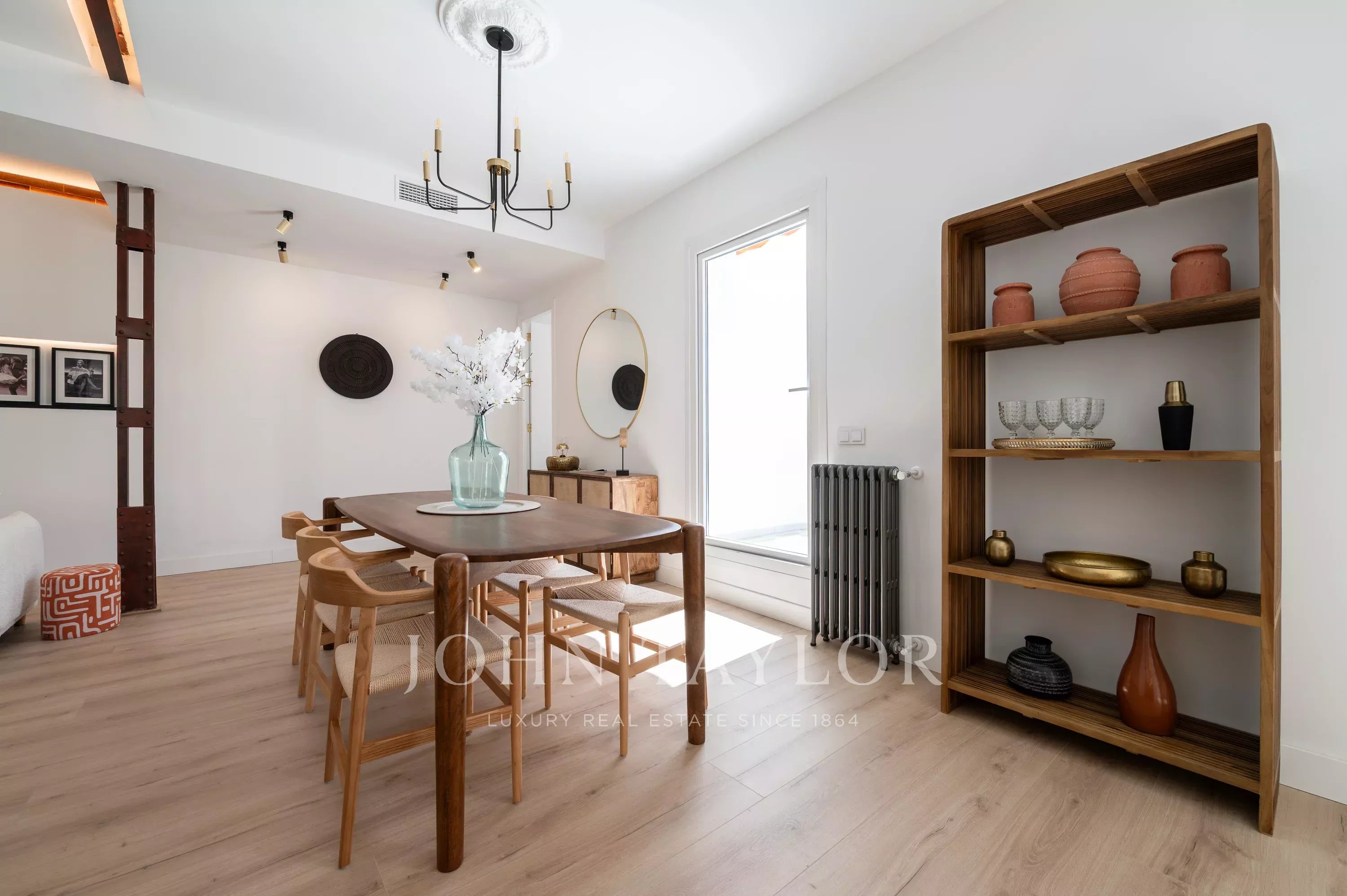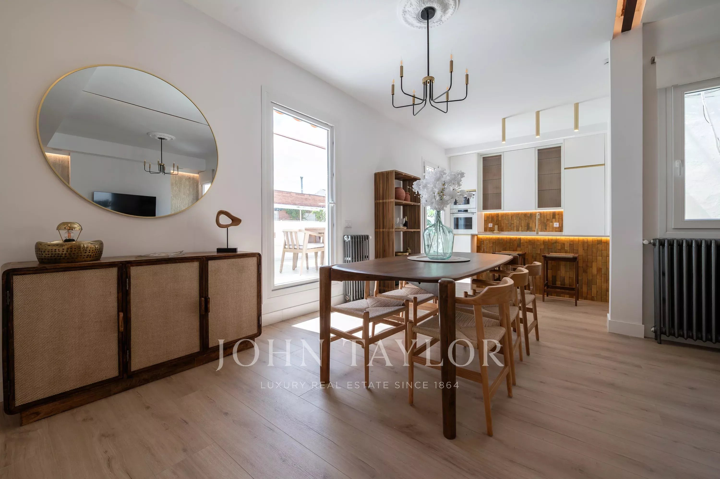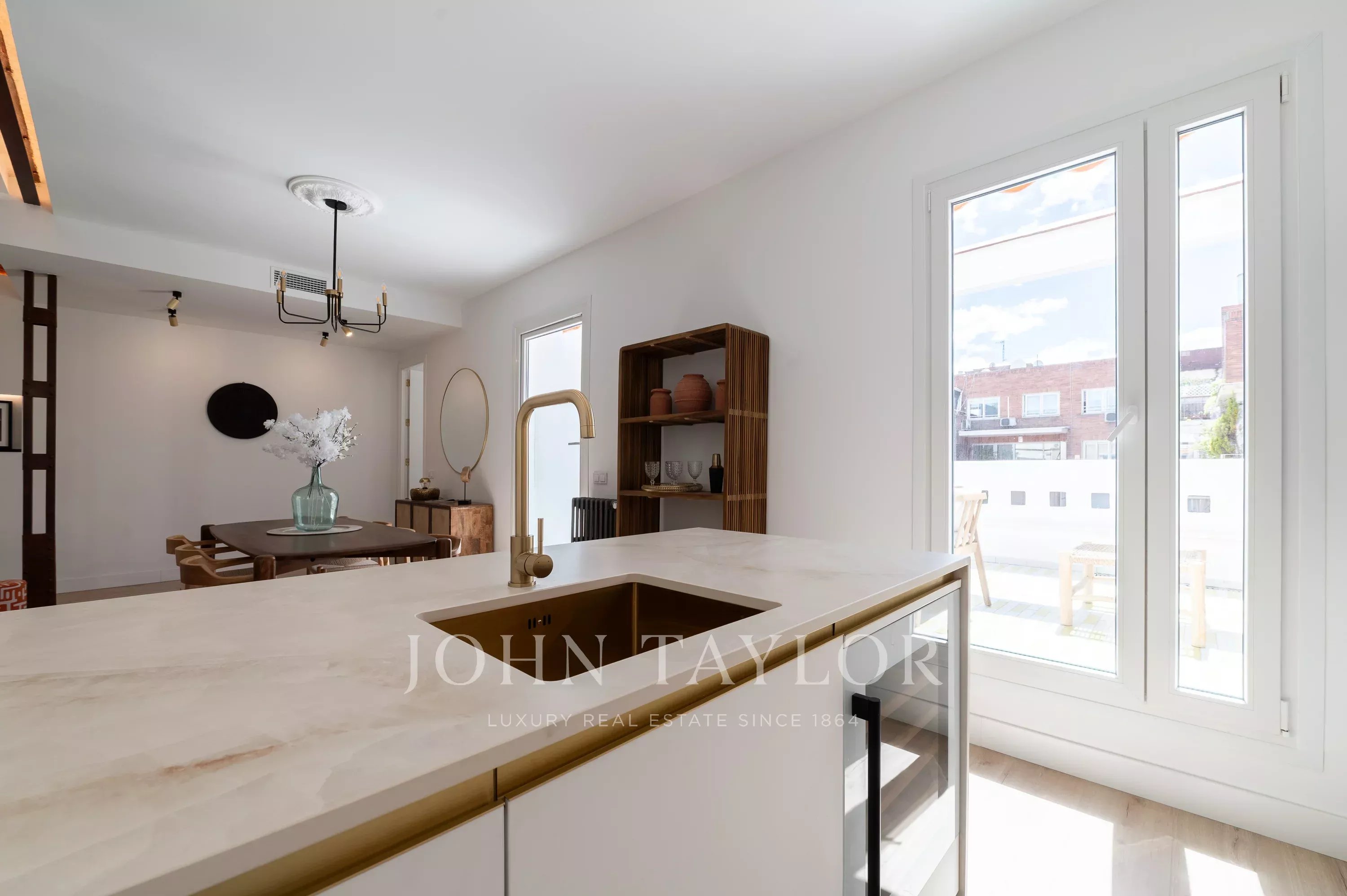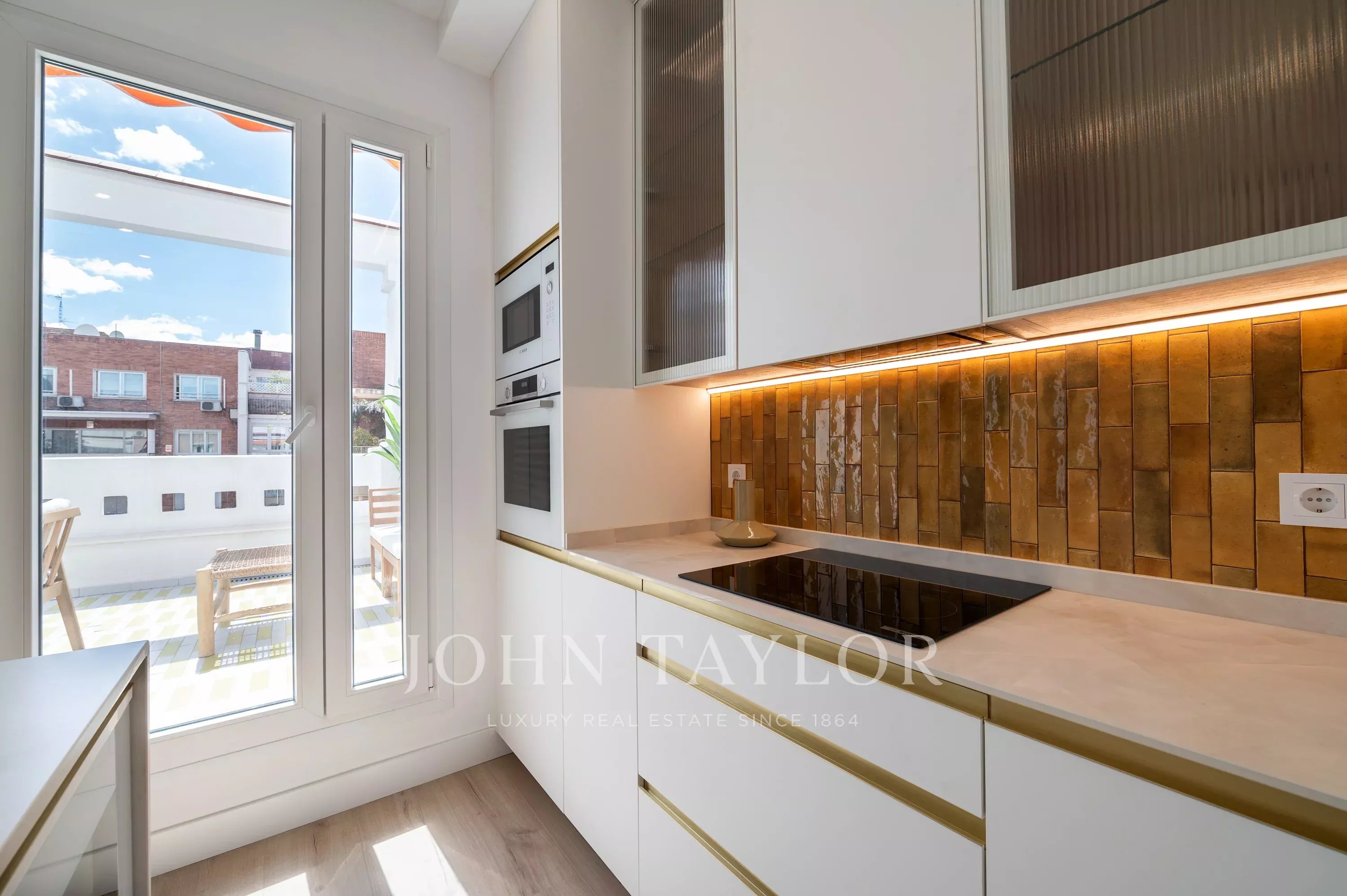 Attico esterno esposto a sud in un edificio classico, dove la luce naturale e la serenità esaltano l'esperienza di vivere a Madrid.