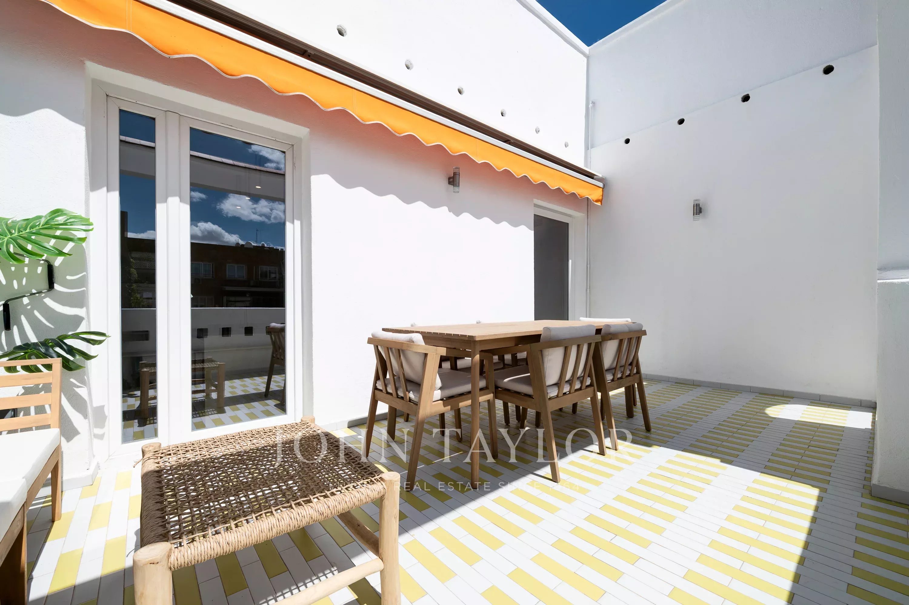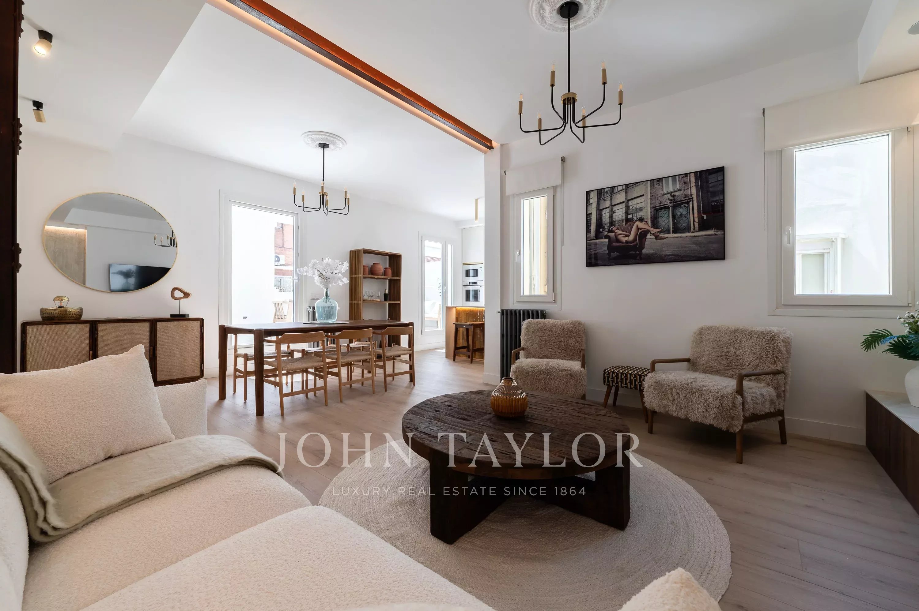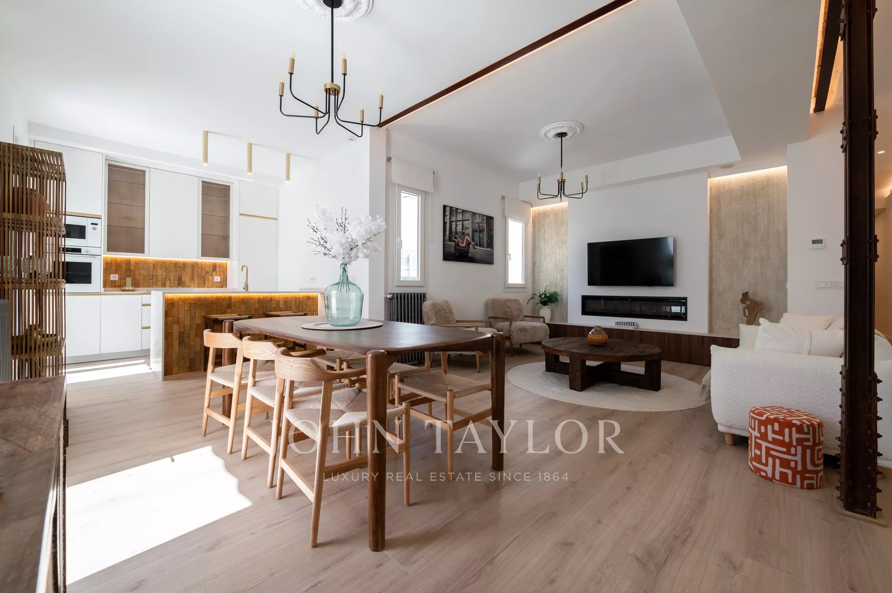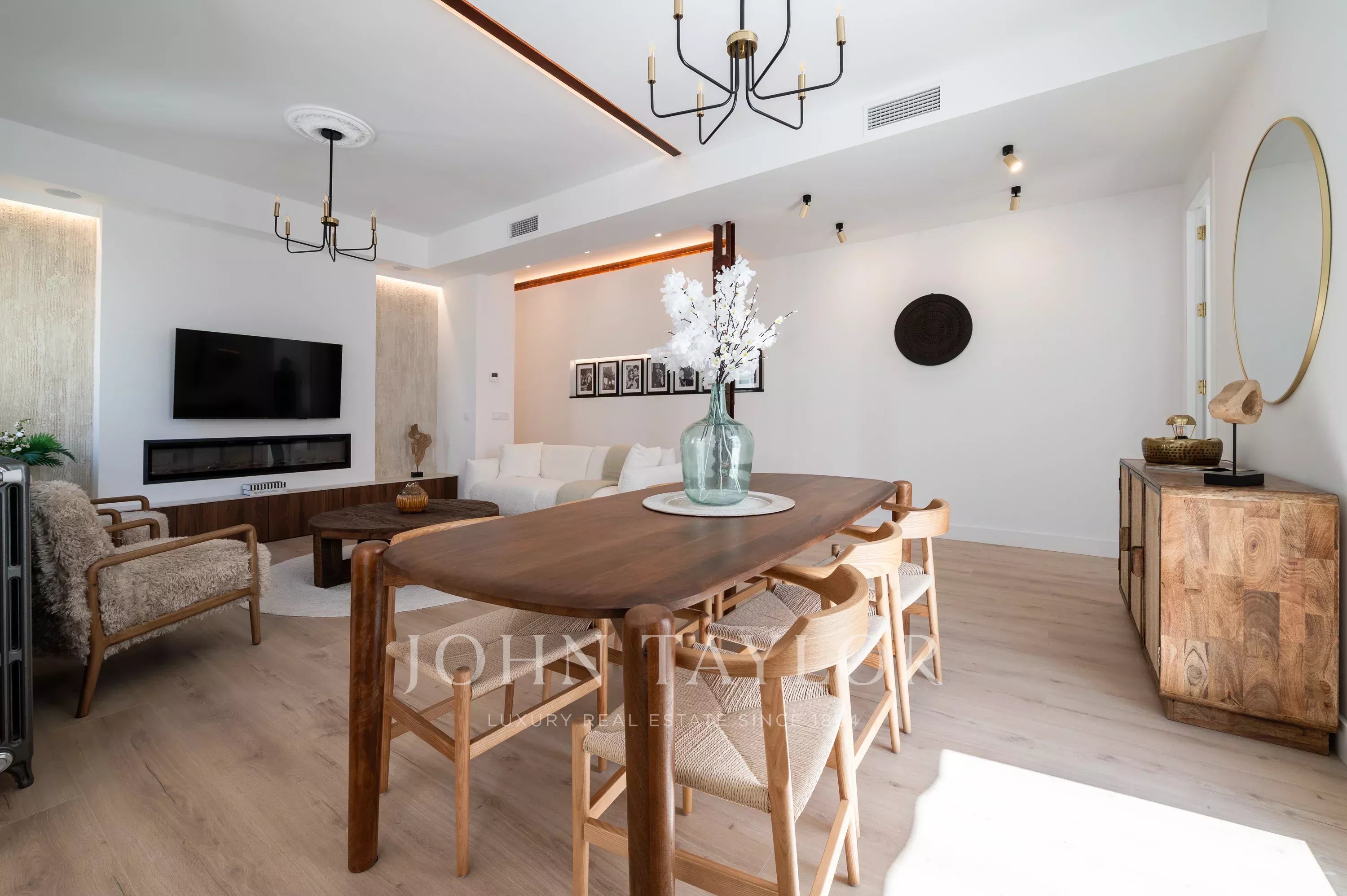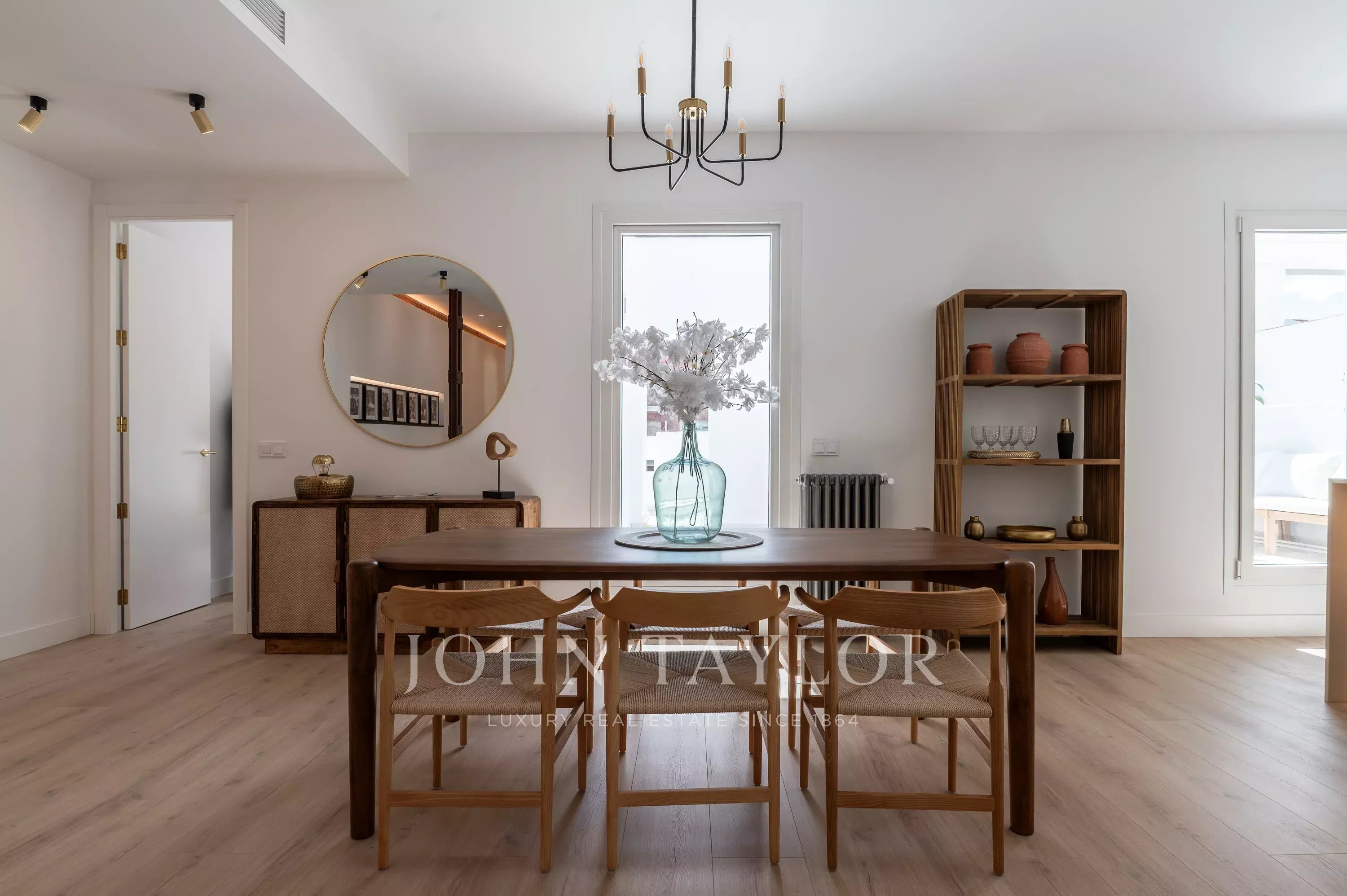 Attico esterno esposto a sud in un edificio classico, dove la luce naturale e la serenità esaltano l'esperienza di vivere a Madrid.