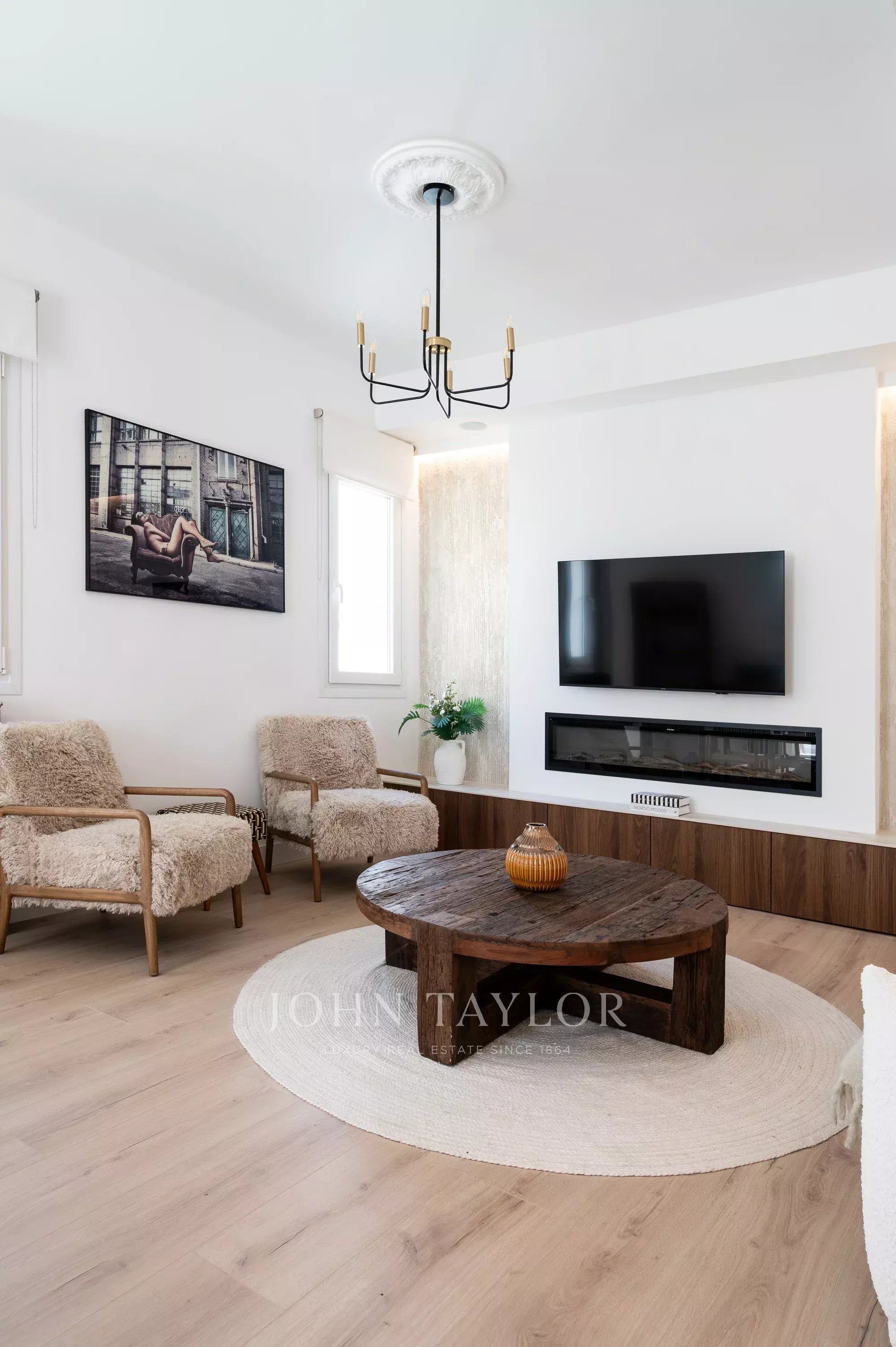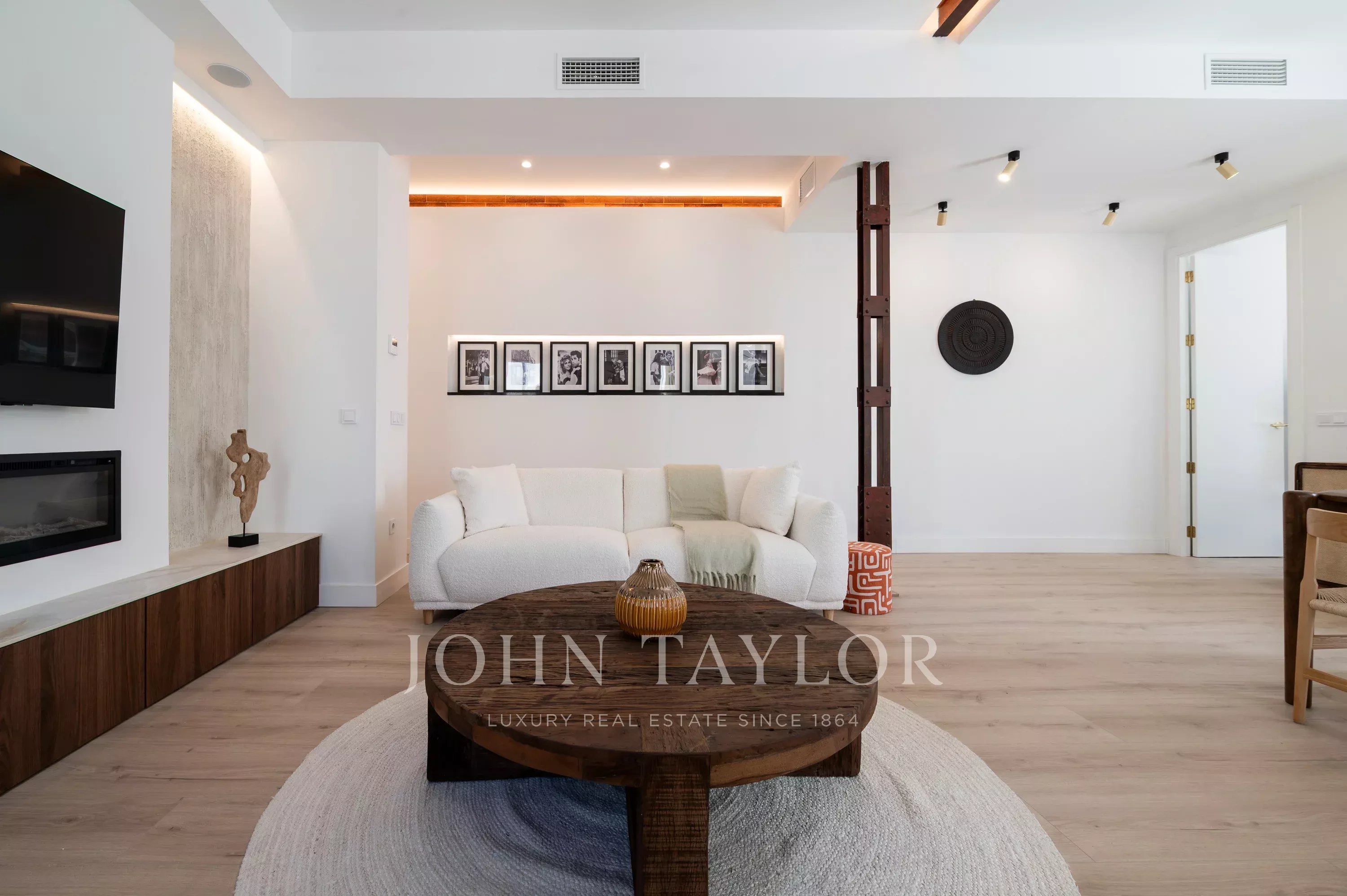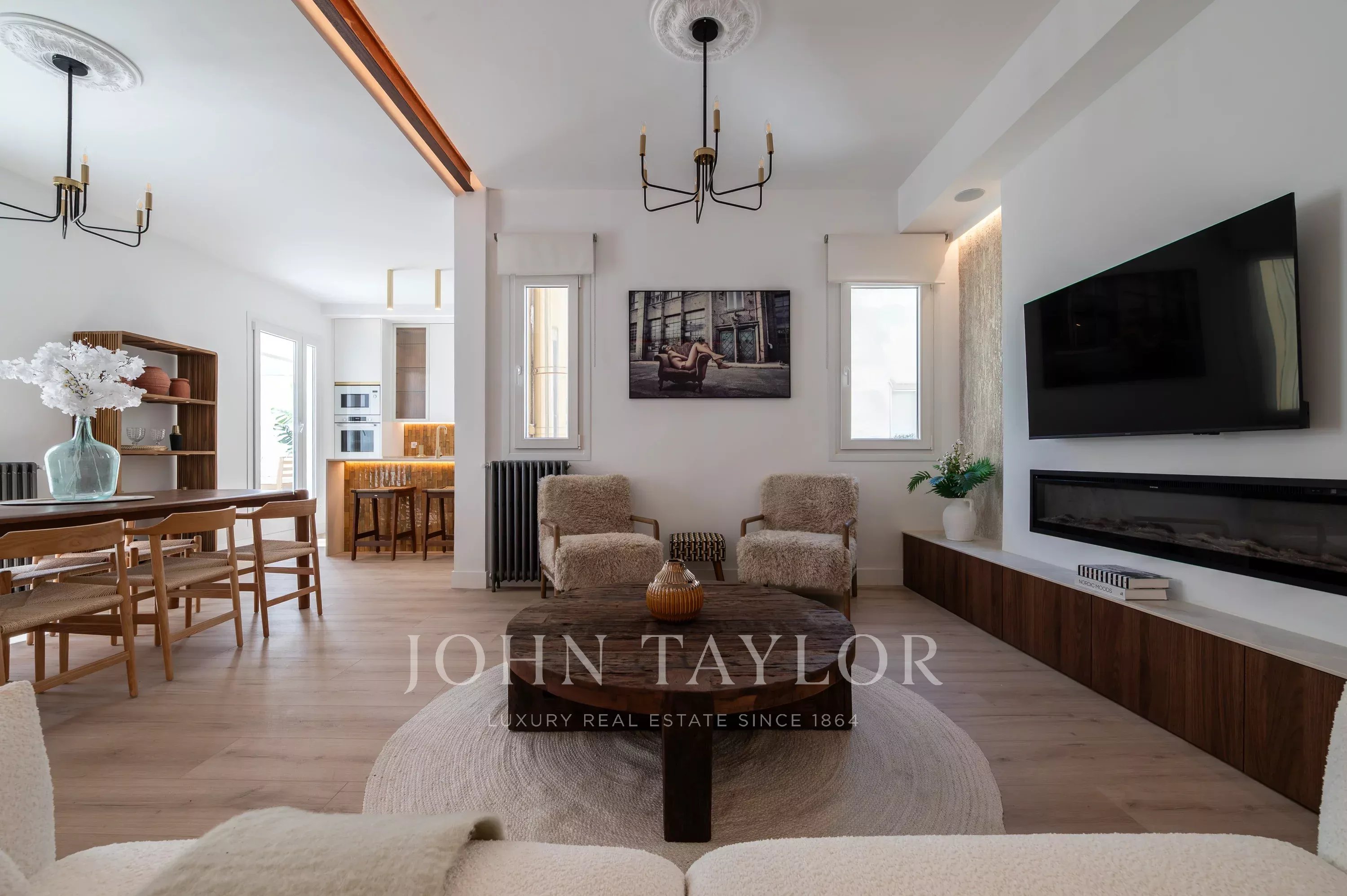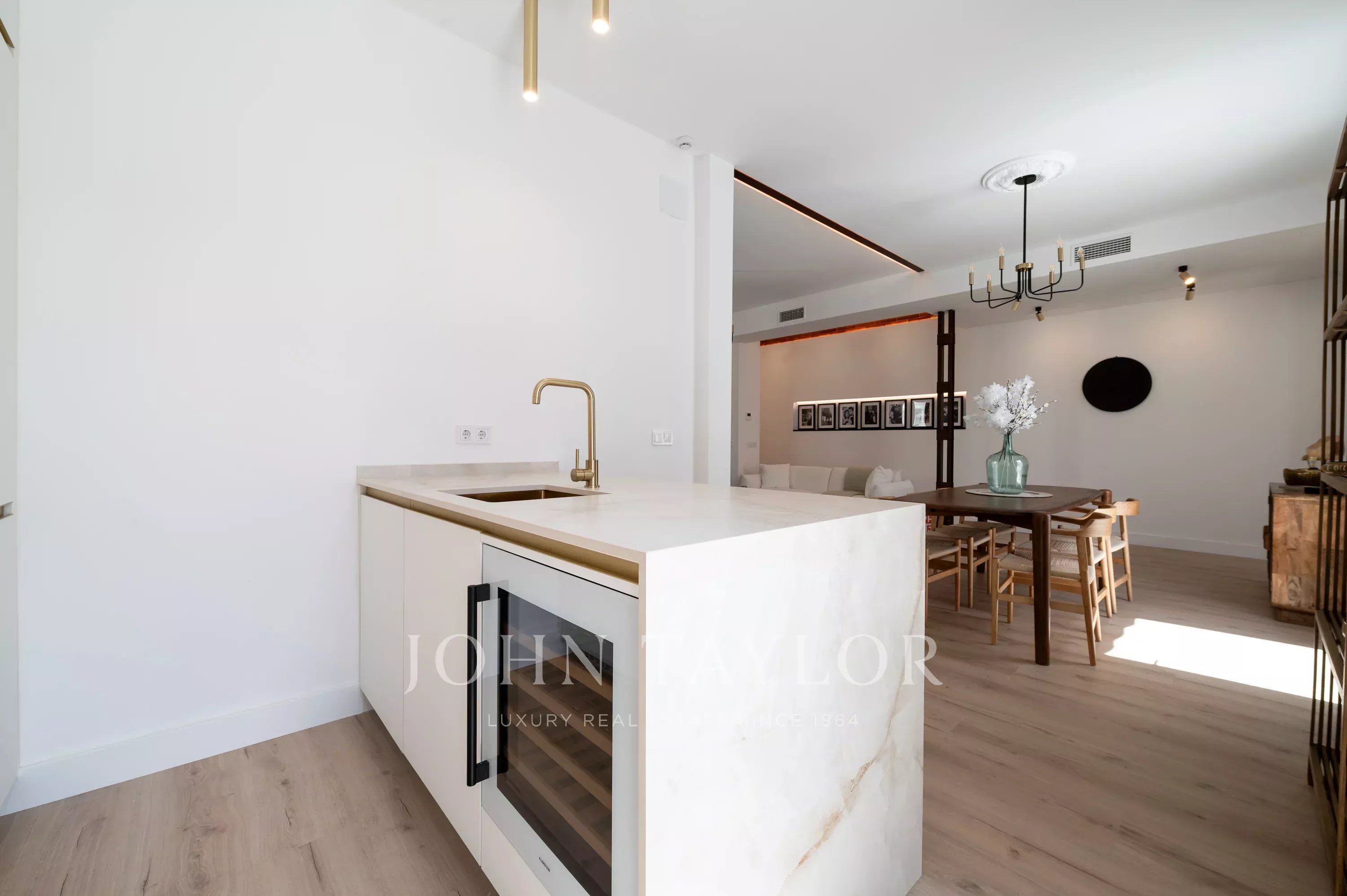 Attico esterno esposto a sud in un edificio classico, dove la luce naturale e la serenità esaltano l'esperienza di vivere a Madrid.